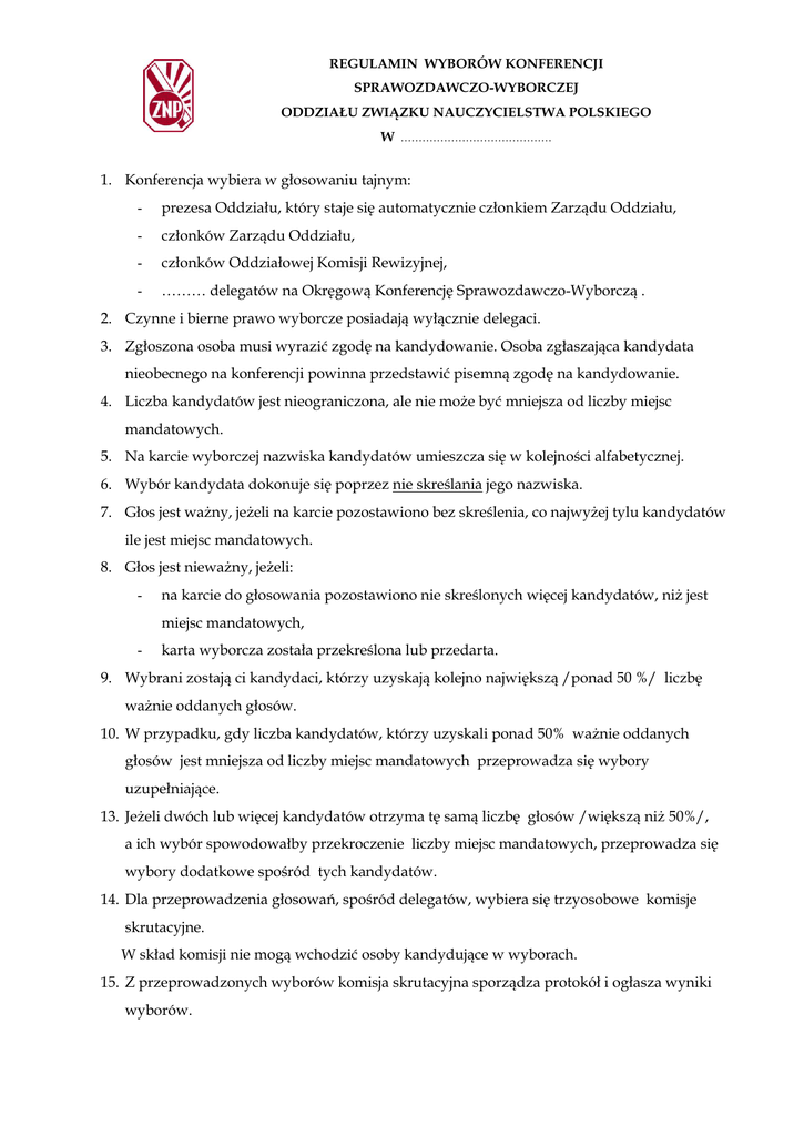 REGULAMIN WYBORÓW KONFERENCJI SPRAWOZDAWCZO-WYBORCZEJ ODDZIAŁU ZWIĄZKU NAUCZYCIELSTWA POLSKIEGO W …………………………………… 1. Konferencja wybiera w głosowaniu tajnym: - prezesa Oddziału, który staje się automatycznie członkiem Zarządu Oddziału, - członków Zarządu Oddziału, - członków Oddziałowej Komisji Rewizyjnej, - ……… delegatów na Okręgową Konferencję Sprawozdawczo-Wyborczą . 2. Czynne i bierne prawo wyborcze posiadają wyłącznie delegaci. 3. Zgłoszona osoba musi wyrazić zgodę na kandydowanie. Osoba zgłaszająca kandydata nieobecnego na konferencji powinna przedstawić pisemną zgodę na kandydowanie. 4. Liczba kandydatów jest nieograniczona, ale nie może być mniejsza od liczby miejsc mandatowych. 5. Na karcie wyborczej nazwiska kandydatów umieszcza się w kolejności alfabetycznej. 6. Wybór kandydata dokonuje się poprzez nie skreślania jego nazwiska. 7. Głos jest ważny, jeżeli na karcie pozostawiono bez skreślenia, co najwyżej tylu kandydatów ile jest miejsc mandatowych. 8. Głos jest nieważny, jeżeli: - na karcie do głosowania pozostawiono nie skreślonych więcej kandydatów, niż jest miejsc mandatowych, - karta wyborcza została przekreślona lub przedarta. 9. Wybrani zostają ci kandydaci, którzy uzyskają kolejno największą /ponad 50 %/ liczbę ważnie oddanych głosów. 10. W przypadku, gdy liczba kandydatów, którzy uzyskali ponad 50% ważnie oddanych głosów jest mniejsza od liczby miejsc mandatowych przeprowadza się wybory uzupełniające. 13. Jeżeli dwóch lub więcej kandydatów otrzyma tę samą liczbę głosów /większą niż 50%/, a ich wybór spowodowałby przekroczenie liczby miejsc mandatowych, przeprowadza się wybory dodatkowe spośród tych kandydatów. 14. Dla przeprowadzenia głosowań, spośród delegatów, wybiera się trzyosobowe komisje skrutacyjne. W skład komisji nie mogą wchodzić osoby kandydujące w wyborach. 15. Z przeprowadzonych wyborów komisja skrutacyjna sporządza protokół i ogłasza wyniki wyborów.