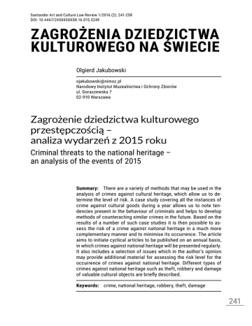Santander Art and Culture Law Review 1/2016 (2): 241-258 DOI: 10.4467/2450050XSR.16.015.5249 ZAGROŻENIA DZIEDZICTWA KULTUROWEGO NA ŚWIECIE Olgierd Jakubowski [email protected] Narodowy Instytut Muzealnictwa i Ochrony Zbiorów ul. Goraszewska 7 02-910 Warszawa Zagrożenie dziedzictwa kulturowego przestępczością – analiza wydarzeń z 2015 roku Criminal threats to the national heritage – an analysis of the events of 2015 Summary: There are a variety of methods that may be used in the analysis of crimes against cultural heritage, which allow us to determine the level of risk. A case study covering all the instances of crime against cultural goods during a year allows us to note tendencies present in the behaviour of criminals and helps to develop methods of counteracting similar crimes in the future. Based on the results of a number of such case studies it is then possible to assess the risk of a crime against national heritage in a much more complementary manner and to minimise its occurrence. The article aims to initiate cyclical articles to be published on an annual basis, in which crimes against national heritage will be presented regularly. It also includes a selection of issues which in the author’s opinion may provide additional material for assessing the risk level for the occurrence of crimes against national heritage. Different types of crimes against national heritage such as theft, robbery and damage of valuable cultural objects are briefly described. Keywords: crime, national heritage, robbery, theft, damage 241 ZAGROŻENIA DZIEDZICTWA KULTUROWEGO NA ŚWIECIE Olgierd Jakubowski Streszczenie: Badając zjawisko przestępczości przeciwko dziedzictwu kulturowemu, można stosować różne metody w celu zdiagnozowania poziomu zagrożenia. Studium konkretnych przypadków przestępstw, których ofiarą padają dobra kultury, w ujęciu rocznym pozwala dostrzec tendencje w działaniach sprawców oraz pomaga wypracować metody przeciwdziałania przyszłym zdarzeniom. Wieloletnie badania przypadków przestępstw godzących w dziedzictwo kulturowe umożliwiają w sposób komplementarny ocenić poziom zagrożenia takimi czynami i zminimalizować ryzyko ich występowania. Słowa kluczowe: przestępczość, dziedzictwo kulturowe, napad rabunkowy, zniszczenie Nr 1 2016 (2) Wstęp Każdego roku diagnozując poziom bezpieczeństwa dziedzictwa kulturowego w Polsce i na świecie, należy zwrócić uwagę zarówno na wydarzenia w danym okresie, jak i tendencje występujące w tym zakresie w poprzednich latach. Niniejszy artykuł jest częścią cyklu dotyczącego zjawiska przestępczości przeciwko dziedzictwu kulturowemu. W pierwszym artykule1, wydanym w 2015 r., wskazano podstawowe źródła danych dotyczących skali i specyfiki zjawiska przestępczości przeciwko dziedzictwu kulturowemu w Polsce oraz przedstawiono założenia cyklu. Niniejsze opracowanie opiera się na dostępnych danych statystycznych2, jest również uzupełnione studiami przypadków (case method) – metodą pozwalającą badać zjawisko. Należy zwrócić uwagę, że odnośnie do przestępczości skierowanej przeciwko dziedzictwu kulturowemu trudno oszacować skalę szkód, jakie wskutek takich działań ponosi kultura. Wynika to, jak się podaje w literaturze, z faktu nieudokumentowania lub niezauważenia kradzieży dóbr kultury oraz braku w wielu krajach podstawowych systemów monitoringu i rejestracji strat takich obiektów3. Zob. O. Jakubowski, Zagrożenie dziedzictwa kulturowego przestępczością – analiza wydarzeń z 2014 roku, „Santander Art and Culture Law Review” 2015, nr 1, s. 263-274. 1 W ocenie autora nie ma obecnie na świecie wiarygodnych danych statystycznych dotyczących przestępczości przeciwko dziedzictwu kulturowemu. 2 242 M. Durney, Art Theft Statistics: Valuable Tools in Need of Reliable Measures, „Cultural Heritage & Arts Review” 2010, jesień/zima, s. 13. 3 Zagrożenie dziedzictwa kulturowego przestępczością… Criminal threats to the national heritage… Skala i specyfika zjawiska przestępczości przeciwko dziedzictwu kulturowemu w Polsce w statystykach organów ścigania oraz Służby Celnej Jednym z głównych dostępnych źródeł informacji o przestępczości przeciwko dziedzictwu kulturowemu są dane opracowywane przez Komendę Główną Policji. Zgodnie z nimi, liczba wszystkich przestępstw stwierdzonych w 2015 r. w Polsce wyniosła 833 281. Przestępstw, w których przedmiotem zamachu były dobra kultury, było łącznie 1063, tj. o 232 mniej niż w roku 2014, kiedy to stwierdzono 1295 tego rodzaju przestępstw. Z ogółu przestępstw 92 stanowiły przestępstwa ścigane z ustawy z dnia 23 lipca 2003 r. o ochronie zabytków i opiece nad zabytkami4 (w 2014 r. – 108 przestępstw)5. By mieć pełniejszy obraz zjawiska, dane Policji dotyczące przestępczości przeciwko dziedzictwu kulturowemu należy uzupełnić o analizy i statystyki Straży Granicznej oraz Służby Celnej. Straż Graniczna zajmuje się zjawiskiem przemytu przede wszystkim ze względu na bezpieczeństwo granic. W ocenie ekspertów tej służby praktyka ostatnich lat wskazuje na problem kontroli wywozu poza teren Unii Europejskiej dóbr kultury, które są przemieszczane przez Polskę z innych krajów unijnych szeroko rozumianym tranzytem6. Zaleca się m.in. weryfikację takich przedmiotów w zakresie progów finansowych określonych w rozporządzeniu Rady nr 116/2009 z dnia 18 grudnia 2008 r. w sprawie wywozu dóbr kultury7. Funkcjonariusze tej służby spotykają się często z przypadkami przewożenia przedmiotów oszacowanych na kwoty nieznacznie niższe niż te przewidziane w progach rozporządzenia. Zaniżanie kwot staje się w ocenie ekspertów Straży Granicznej praktyką skutkującą brakiem możliwości zatrzymywania zabytków w ramach takiego wywozu. Możliwość weryfikacji kwot, które widnieją na dokumentach, w momencie przekraczania granicy jest bardzo ograniczona. Generalnie w takich