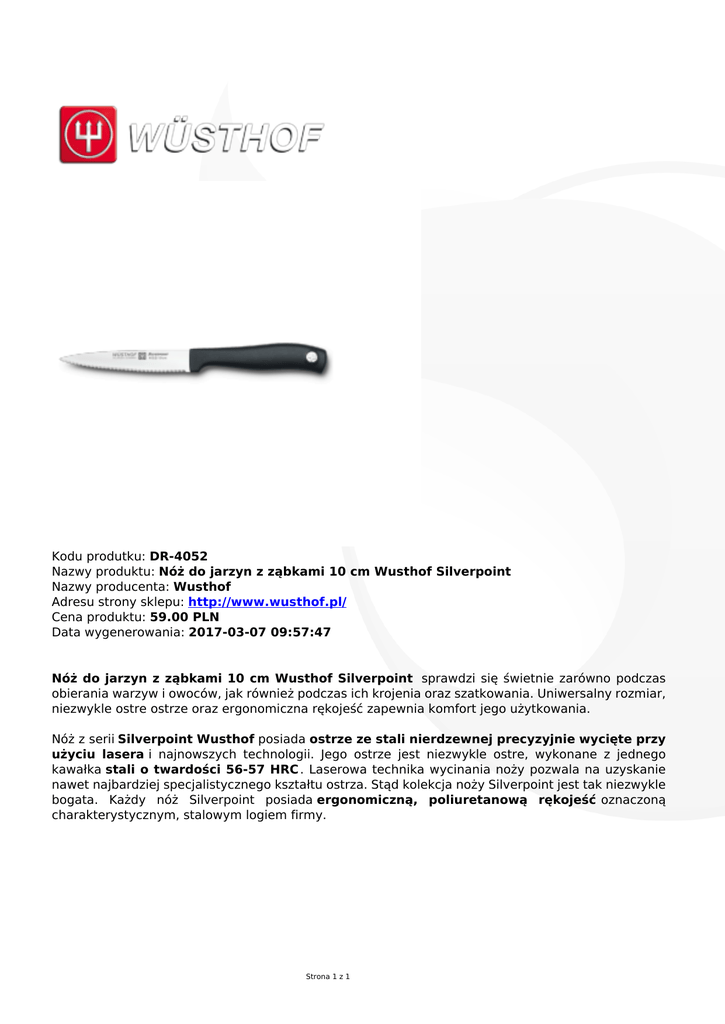 Kodu produtku: DR-4052 Nazwy produktu: Nóż do jarzyn z ząbkami 10 cm Wusthof Silverpoint Nazwy producenta: Wusthof Adresu strony sklepu: http://www.wusthof.pl/ Cena produktu: 59.00 PLN Data wygenerowania: 2017-03-07 09:57:47 Nóż do jarzyn z ząbkami 10 cm Wusthof Silverpoint sprawdzi się świetnie zarówno podczas obierania warzyw i owoców, jak również podczas ich krojenia oraz szatkowania. Uniwersalny rozmiar, niezwykle ostre ostrze oraz ergonomiczna rękojeść zapewnia komfort jego użytkowania. Nóż z serii Silverpoint Wusthof posiada ostrze ze stali nierdzewnej precyzyjnie wycięte przy użyciu lasera i najnowszych technologii. Jego ostrze jest niezwykle ostre, wykonane z jednego kawałka stali o twardości 56-57 HRC . Laserowa technika wycinania noży pozwala na uzyskanie nawet najbardziej specjalistycznego kształtu ostrza. Stąd kolekcja noży Silverpoint jest tak niezwykle bogata. Każdy nóż Silverpoint posiada ergonomiczną, poliuretanową rękojeść oznaczoną charakterystycznym, stalowym logiem firmy. Strona 1 z 1