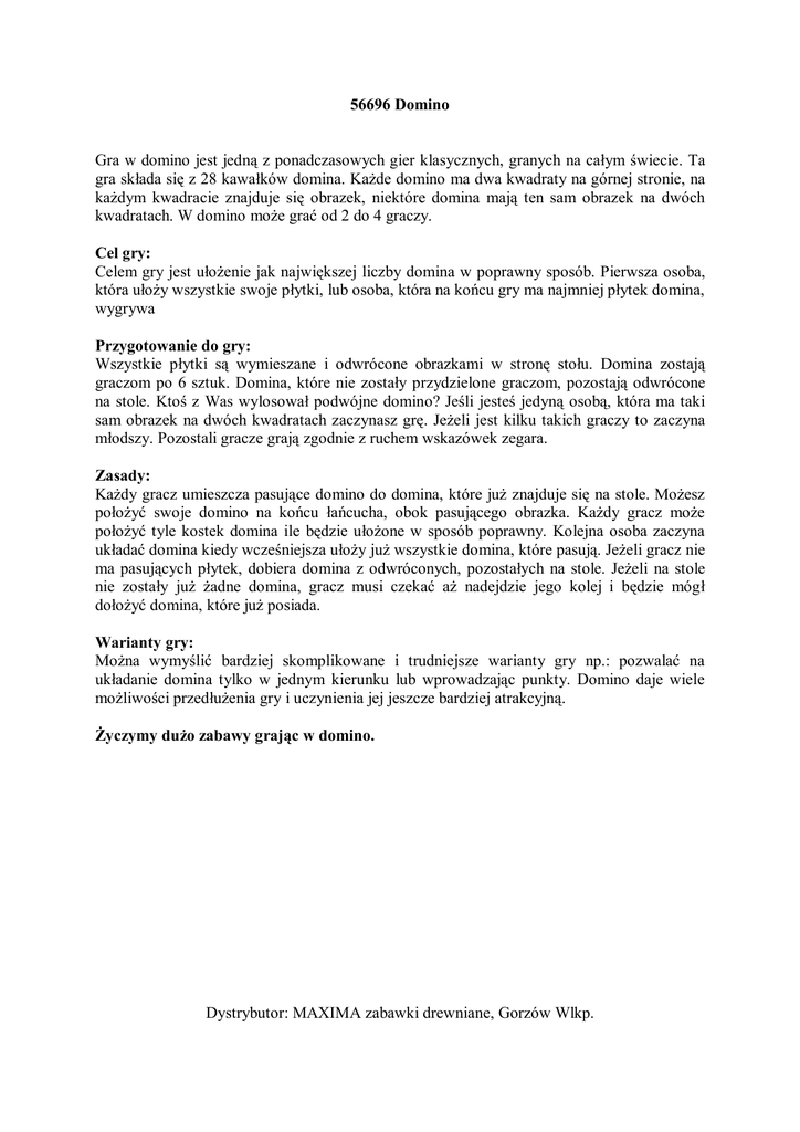56696 Domino Gra w domino jest jedną z ponadczasowych gier klasycznych, granych na całym świecie. Ta gra składa się z 28 kawałków domina. Każde domino ma dwa kwadraty na górnej stronie, na każdym kwadracie znajduje się obrazek, niektóre domina mają ten sam obrazek na dwóch kwadratach. W domino może grać od 2 do 4 graczy. Cel gry: Celem gry jest ułożenie jak największej liczby domina w poprawny sposób. Pierwsza osoba, która ułoży wszystkie swoje płytki, lub osoba, która na końcu gry ma najmniej płytek domina, wygrywa Przygotowanie do gry: Wszystkie płytki są wymieszane i odwrócone obrazkami w stronę stołu. Domina zostają graczom po 6 sztuk. Domina, które nie zostały przydzielone graczom, pozostają odwrócone na stole. Ktoś z Was wylosował podwójne domino? Jeśli jesteś jedyną osobą, która ma taki sam obrazek na dwóch kwadratach zaczynasz grę. Jeżeli jest kilku takich graczy to zaczyna młodszy. Pozostali gracze grają zgodnie z ruchem wskazówek zegara. Zasady: Każdy gracz umieszcza pasujące domino do domina, które już znajduje się na stole. Możesz położyć swoje domino na końcu łańcucha, obok pasującego obrazka. Każdy gracz może położyć tyle kostek domina ile będzie ułożone w sposób poprawny. Kolejna osoba zaczyna układać domina kiedy wcześniejsza ułoży już wszystkie domina, które pasują. Jeżeli gracz nie ma pasujących płytek, dobiera domina z odwróconych, pozostałych na stole. Jeżeli na stole nie zostały już żadne domina, gracz musi czekać aż nadejdzie jego kolej i będzie mógł dołożyć domina, które już posiada. Warianty gry: Można wymyślić bardziej skomplikowane i trudniejsze warianty gry np.: pozwalać na układanie domina tylko w jednym kierunku lub wprowadzając punkty. Domino daje wiele możliwości przedłużenia gry i uczynienia jej jeszcze bardziej atrakcyjną. Życzymy dużo zabawy grając w domino. Dystrybutor: MAXIMA zabawki drewniane, Gorzów Wlkp.