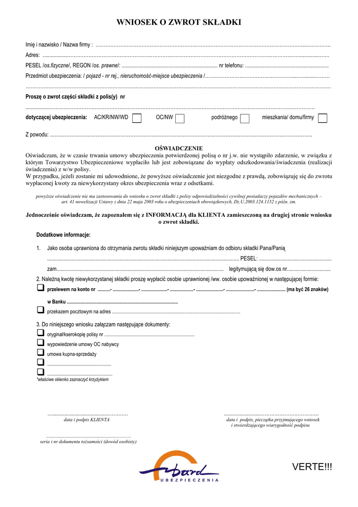 WNIOSEK O ZWROT SKŁADKI Imię i nazwisko / Nazwa firmy : ………………………………………………………………………………………………………………....………….. Adres: ..................……………………………………………………………………………………………………………………………..............……. PESEL /os.fizyczne/, REGON /os. prawne/: ...................................................................... nr telefonu: ............................................................. Przedmiot ubezpieczenia: / pojazd - nr rej., nieruchomość-miejsce ubezpieczenia /………………………………………………..…..........……… …………………………………………………………………………………………………………………………………………………………………… Proszę o zwrot części składki z polis(y) nr .................……………………………………………………………………………………………………………………………………………… dotyczącej ubezpieczenia: AC/KR/NW/WD OC/NW podróżnego mieszkania/ domu/firmy Z powodu: ………………………………………………………………………………………………………….………………………………… OŚWIADCZENIE Oświadczam, że w czasie trwania umowy ubezpieczenia potwierdzonej polisą o nr j.w. nie wystąpiło zdarzenie, w związku z którym Towarzystwo Ubezpieczeniowe wypłaciło lub jest zobowiązane do wypłaty odszkodowania/świadczenia (realizacji świadczenia) z w/w polisy. W przypadku, jeżeli zostanie mi udowodnione, że powyższe oświadczenie jest niezgodne z prawdą, zobowiązuję się do zwrotu wypłaconej kwoty za niewykorzystany okres ubezpieczenia wraz z odsetkami. powyższe oświadczenie nie ma zastosowania do wniosku o zwrot składki z polisy odpowiedzialności cywilnej posiadaczy pojazdów mechanicznych – art. 41 nowelizacji Ustawy z dnia 22 maja 2003 roku o ubezpieczeniach obowiązkowych, Dz.U.2003.124.1152 z późn. zm. Jednocześnie oświadczam, że zapoznałem się z INFORMACJĄ dla KLIENTA zamieszczoną na drugiej stronie wniosku o zwrot składki. Dodatkowe informacje: 1. Jako osoba uprawniona do otrzymania zwrotu składki niniejszym upoważniam do odbioru składki Pana/Panią ............................................................................................................................................ PESEL: ..................................................... zam.......................................................................................................................... legitymującą się dow.os nr................................ 2. Należną kwotę niewykorzystanej składki proszę wypłacić osobie uprawnionej /ww. osobie upoważnionej w następującej formie: przelewem na konto nr ..........- .....................- .....................- ...................- ......................- .......................- ....................... (ma być 26 znaków) w Banku .......................................................................................... przekazem pocztowym na adres ........................................................................................................ 3. Do niniejszego wniosku załączam następujące dokumenty: oryginał/kserokopię polisy nr ......................................................................... wypowiedzenie umowy OC nabywcy umowa kupna-sprzedaży .................................................... ..................................................... *właściwe okienko zaznaczyć krzyżykiem ….........................................………… data i podpis KLIENTA ......….........…....……………………………… data i podpis, pieczątka przyjmującego wniosek i stwierdzającego wiarygodność podpisu ...............................................................………… seria i nr dokumentu tożsamości (dowód osobisty) VERTE!!! INFORMACJA dla KLIENTA Towarzystwo Ubezpieczeniowe informuje, że zwrot składki z tytułu niewykorzystanego okresu ubezpieczenia będzie dokonany pod warunkiem: I. przedłożenia następujących dokumentów: 1. w przypadku zwrotu składki z ubezpieczeń komunikacyjnych: a) zwrot składki z OC: w przypadku sprzedaży pojazdu – wymagane jest wypowiedzenia umowy OC przez nabywcę oraz złożenie kopii umowy kupna-sprzedaży pojazdu – w innym przypadku zwrot składki nie przysługuje; w przypadku złomowania lub kradzieży pojazdu - wymagane jest złożenie kopii decyzji o wyrejestrowaniu pojazdu z wydziału komunikacji; Kwota składki do zwrotu liczona jest od dnia wydania decyzji o wyrejestrowaniu pojazdu z wydziału komunikacji. b) zwrot składki z AC/KR/NW: w przypadku sprzedaży pojazdu – wymagane jest złożenie kopii umowy kupna-sprzedaży pojazdu; przypadku pojazdów leasingowanych – wymagane jest złożenie upoważnienia przez leasingodawcę do odbioru niewykorzystanej części składki przez leasingobiorcę; 2. 3. w przypadku zwrotu składki z ubezpieczenia podróżnego: oryginał polisy złożenia wniosku o zwrot składki z powodu wcześniejszego powrotu do kraju; w przypadku zwrotu składki z ubezpieczeń mieszkaniowych/firm: oryginału / kopii polisy ubezpieczenia domu/ lokalu mieszkalnego/firmy; kopia dokumentu potwierdzającego zmianę właściciela ubezpieczonego domu/ lokalu mieszkalnego; w przypadku zwrotu składki z ubezpieczenia firmy - kserokopię KRS/wpisu do ewidencji działalności gospodarczej ze zmianami adresowymi-wyrejestrowaniami II. Osoba ubezpieczona i uprawniona do zwrotu składki nie jest obciążona zajęciem komorniczym.