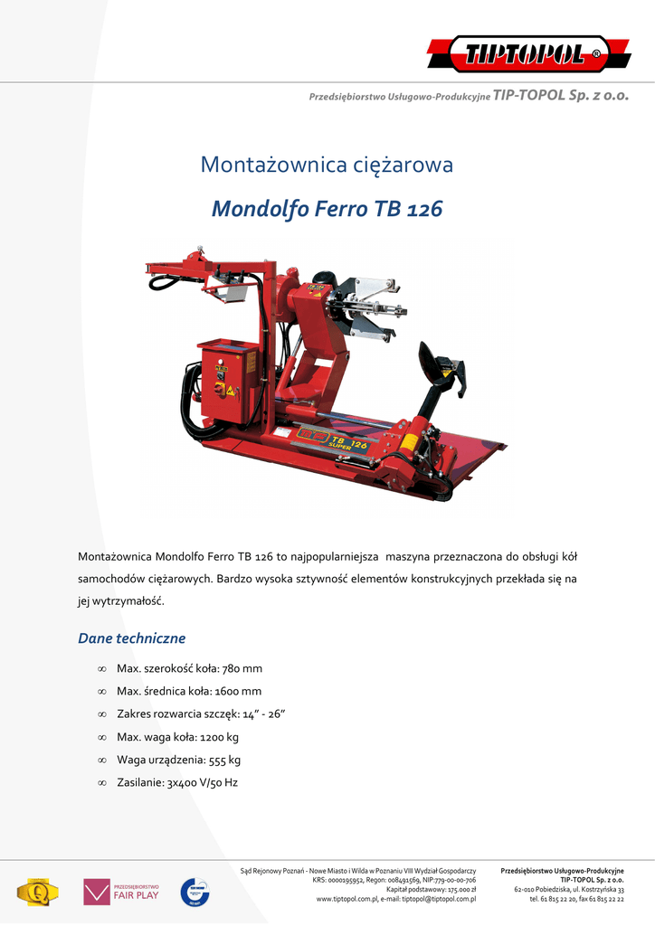 Montażownica ciężarowa Mondolfo Ferro TB 126 Montażownica Mondolfo Ferro TB 126 to najpopularniejsza maszyna przeznaczona do obsługi kół samochodów ciężarowych. Bardzo wysoka sztywność elementów konstrukcyjnych przekłada się na jej wytrzymałość. Dane techniczne • Max. szerokość koła: 780 mm • Max. średnica koła: 1600 mm • Zakres rozwarcia szczęk: 14” - 26” • Max. waga koła: 1200 kg • Waga urządzenia: 555 kg • Zasilanie: 3x400 V/50 Hz Sąd Rejonowy Poznań - Nowe Miasto i Wilda w Poznaniu VIII Wydział Gospodarczy KRS: 0000195952, Regon: 008491569, NIP:779-00-00-706 Kapitał podstawowy: 175.000 zł www.tiptopol.com.pl, e-mail: [email protected] Przedsiębiorstwo Usługowo-Produkcyjne TIP-TOPOL Sp. z o.o. 62-010 Pobiedziska, ul. Kostrzyńska 33 tel. 61 815 22 20, fax 61 815 22 22 Wymiary Informacje ogólne • Specjalny kształt dysku ułatwia penetrację miedzy stopką opony a krawędzią obręczy, • Intuicyjny panel kontrolny zamontowany na ramieniu przegubowy zapewnia bezpieczną pracę, • Uniwersalny samocentrujący się uchwyt 14” – 26” pozwala na chwytanie obręczy z kołnierzem wewnętrznym, zewnętrznym oraz bez kołnierza., Wersje urządzenia • TB 126 N posiada ręcznie podnoszone ramię i ręcznie obracany dysk. • TB 126 DE LUXE posiada automatycznie podnoszone ramię i ręcznie obracany dysk. • TB 126 SUPER posiada automatycznie podnoszone ramię i automatycznie obracany dysk. Sąd Rejonowy Poznań - Nowe Miasto i Wilda w Poznaniu VIII Wydział Gospodarczy KRS: 0000195952, Regon: 008491569, NIP:779-00-00-706 Kapitał podstawowy: 175.000 zł www.tiptopol.com.pl, e-mail: [email protected] Przedsiębiorstwo Usługowo-Produkcyjne TIP-TOPOL Sp. z o.o. 62-010 Pobiedziska, ul. Kostrzyńska 33 tel. 61 815 22 20, fax 61 815 22 22 Wyposażenie standardowe • łyżka montażowa duża, • łyżka montażowa mała, • Imadełko, Wyposażenie dodatkowe Nr katalogowy Opis Zdjęcie Pierścienie zabezpieczające do felg MF19120151 MF19120151 – 281mm MF19120152 MF19120152 – 221mm MF19120153 MF19120153 – 202mm MF19120154 MF19120154 – 161mm MF19120017 Rolka do zbijania opony BU5974000 Łyżka montażowa Sąd Rejonowy Poznań - Nowe Miasto i Wilda w Poznaniu VIII Wydział Gospodarczy KRS: 0000195952, Regon: 008491569, NIP:779-00-00-706 Kapitał podstawowy: 175.000 zł www.tiptopol.com.pl, e-mail: [email protected] Przedsiębiorstwo Usługowo-Produkcyjne TIP-TOPOL Sp. z o.o. 62-010 Pobiedziska, ul. Kostrzyńska 33 tel. 61 815 22 20, fax 61 815 22 22