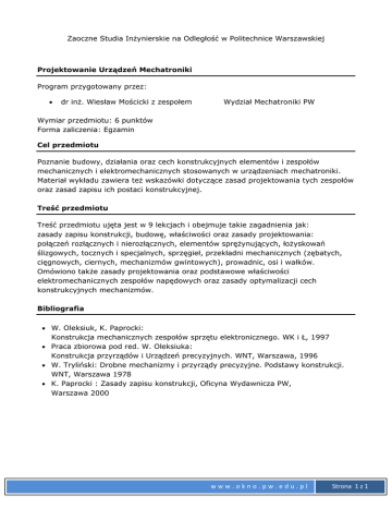 Zaoczne Studia Inżynierskie na Odległość w Politechnice Warszawskiej Projektowanie Urządzeń Mechatroniki Program przygotowany przez: dr inż. Wiesław Mościcki z zespołem Wydział Mechatroniki PW Wymiar przedmiotu: 6 punktów Forma zaliczenia: Egzamin Cel przedmiotu Poznanie budowy, działania oraz cech konstrukcyjnych elementów i zespołów mechanicznych i elektromechanicznych stosowanych w urządzeniach mechatroniki. Materiał wykładu zawiera też wskazówki dotyczące zasad projektowania tych zespołów oraz zasad zapisu ich postaci konstrukcyjnej. Treść przedmiotu Treść przedmiotu ujęta jest w 9 lekcjach i obejmuje takie zagadnienia jak: zasady zapisu konstrukcji, budowę, właściwości oraz zasady projektowania: połączeń rozłącznych i nierozłącznych, elementów sprężynujących, łożyskowań ślizgowych, tocznych i specjalnych, sprzęgieł, przekładni mechanicznych (zębatych, cięgnowych, ciernych, mechanizmów gwintowych), prowadnic, osi i wałków. Omówiono także zasady projektowania oraz podstawowe właściwości elektromechanicznych zespołów napędowych oraz zasady optymalizacji cech konstrukcyjnych mechanizmów. Bibliografia W. Oleksiuk, K. Paprocki: Konstrukcja mechanicznych zespołów sprzętu elektronicznego. WK i Ł, 1997 Praca zbiorowa pod red. W. Oleksiuka: Konstrukcja przyrządów i Urządzeń precyzyjnych. WNT, Warszawa, 1996 W. Tryliński: Drobne mechanizmy i przyrządy precyzyjne. Podstawy konstrukcji. WNT, Warszawa 1978 K. Paprocki : Zasady zapisu konstrukcji, Oficyna Wydawnicza PW, Warszawa 2000 www.okno.pw.edu.pl Strona 1 z 1