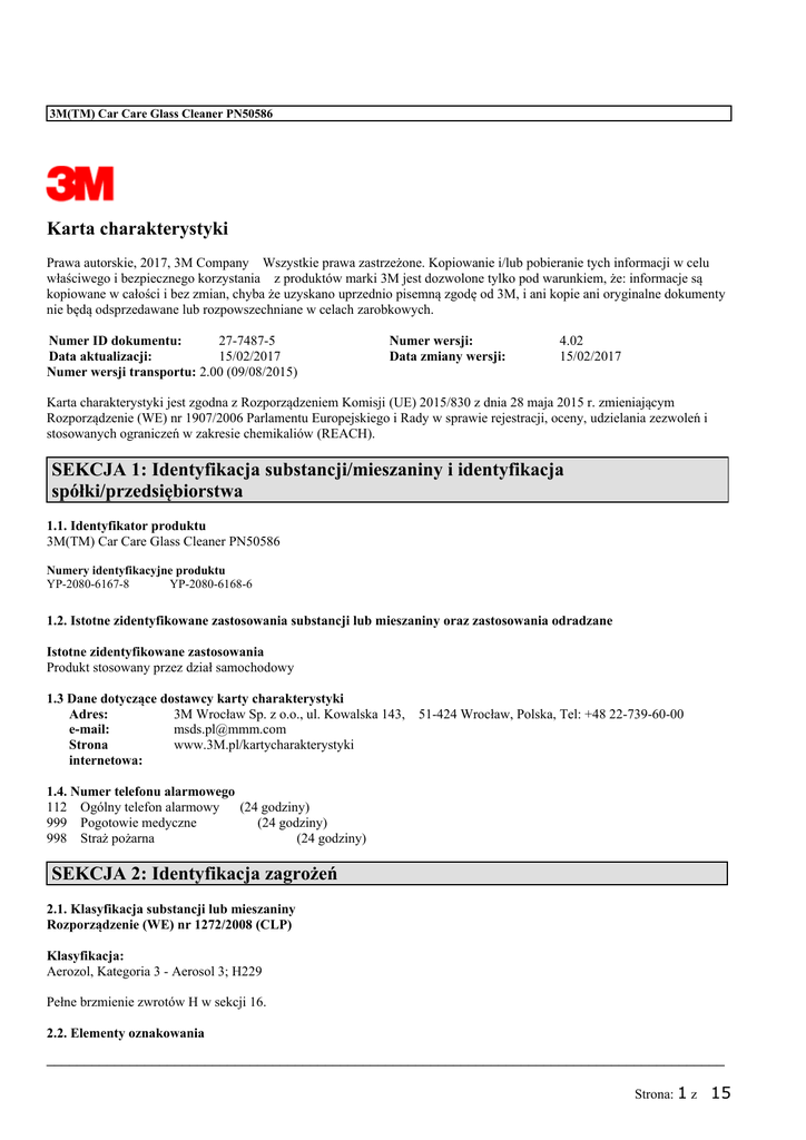 3M(TM) Car Care Glass Cleaner PN50586 Karta charakterystyki Prawa autorskie, 2017, 3M Company Wszystkie prawa zastrzeżone. Kopiowanie i/lub pobieranie tych informacji w celu właściwego i bezpiecznego korzystania z produktów marki 3M jest dozwolone tylko pod warunkiem, że: informacje są kopiowane w całości i bez zmian, chyba że uzyskano uprzednio pisemną zgodę od 3M, i ani kopie ani oryginalne dokumenty nie będą odsprzedawane lub rozpowszechniane w celach zarobkowych. Numer ID dokumentu: 27-7487-5 Data aktualizacji: 15/02/2017 Numer wersji transportu: 2.00 (09/08/2015) Numer wersji: Data zmiany wersji: 4.02 15/02/2017 Karta charakterystyki jest zgodna z Rozporządzeniem Komisji (UE) 2015/830 z dnia 28 maja 2015 r. zmieniającym Rozporządzenie (WE) nr 1907/2006 Parlamentu Europejskiego i Rady w sprawie rejestracji, oceny, udzielania zezwoleń i stosowanych ograniczeń w zakresie chemikaliów (REACH). SEKCJA 1: Identyfikacja substancji/mieszaniny i identyfikacja spółki/przedsiębiorstwa 1.1. Identyfikator produktu 3M(TM) Car Care Glass Cleaner PN50586 Numery identyfikacyjne produktu YP-2080-6167-8 YP-2080-6168-6 1.2. Istotne zidentyfikowane zastosowania substancji lub mieszaniny oraz zastosowania odradzane Istotne zidentyfikowane zastosowania Produkt stosowany przez dział samochodowy 1.3 Dane dotyczące dostawcy karty charakterystyki Adres: 3M Wrocław Sp. z o.o., ul. Kowalska 143, e-mail: [email protected] Strona www.3M.pl/kartycharakterystyki internetowa: 51-424 Wrocław, Polska, Tel: +48 22-739-60-00 1.4. Numer telefonu alarmowego 112 Ogólny telefon alarmowy (24 godziny) 999 Pogotowie medyczne (24 godziny) 998 Straż pożarna (24 godziny) SEKCJA 2: Identyfikacja zagrożeń 2.1. Klasyfikacja substancji lub mieszaniny Rozporządzenie (WE) nr 1272/2008 (CLP) Klasyfikacja: Aerozol, Kategoria 3 - Aerosol 3; H229 Pełne brzmienie zwrotów H w sekcji 16. 2.2. Elementy oznakowania __________________________________________________________________________________________ Strona: 1 z 15 3M(TM) Car Care Glass Cleaner PN50586 Rozporządzenie (WE) nr 1272/2008 (CLP) Hasło ostrzegawcze: UWAGA Zwroty H229 wskazujące rodzaj zagrożenia: Pojemnik pod ciśnieniem: Ogrzanie grozi wybuchem. Zwroty wskazujące środki ostrożności: Ogólne: P102 Chronić przed dziećmi. Zapobieganie: P210A P251 Przechowywanie: P410 + P412 Przechowywać z dala od źródeł ciepła, gorących powierzchni, iskrzenia, otwartego ognia i innych źródeł zapłonu. Palenie wzbronione. Nie przekłuwać ani nie spalać, nawet po zużyciu. Chronić przed światłem słonecznym. Nie wystawiać na działanie temperatury przekraczającej 50 ⁰C/122 ⁰F. Wskazówki dotyczące oznakowania: Zaktualizowano zgodnie z rozporządzeniem (EC) nr 648/2004 w sprawie detergentów. Zgodnie z rozporządzeniem 648/2004 w sprawie detergentów na etykiecie wymagane są następujące składniki: <5% Węglowodory alifatyczne. 10% masy składników jest łatwopalne. Produkt nie jest palny w oparciu o wyniki badań na palność. 2.3. Inne zagrożenia Nieznane SEKCJA 3: Skład/informacja o składnikach Nazwa substancji Butan (Numer rejestracji REACH:012119474691-32) 2-Butoksyetanol Nr CAS 106-97-8 Nr WE 203-448-7 Stężenie % 1 - 10 111-76-2 203-905-0 1 - 10 Izobutan 75-28-5 200-857-2 1 - 10 Propan 74-98-6 200-827-9 1 - 10 Amoniak, roztwór (Numer rejestracji REACH:01-2119488876-14) 1336-21-6 215-647-6 0,1 - Substancja nieklasyfikowana jako niebezpieczna Mieszanina >= 10 1 Klasyfikacja Flam. Gas 1, H220; Skroplony gaz, H280 - Nota C,U (CLP) Acute Tox. 4, H332; Acute Tox. 4, H312; Acute Tox. 4, H302; Skin Irrit. 2, H315; Eye Irrit. 2, H319 (CLP) Flam. Gas 1, H220; Skroplony gaz, H280 - Nota C,U (CLP) Flam. Gas 1, H220; Skroplony gaz, H280 - Nota U (CLP) Skin Corr. 1B, H314; STOT SE 3, H335; Aquatic Acute 1, H400,M=1 - Nota B (CLP) Met. Corr. 1, H290 (Dostawca) Substancja niesklasyfikowana jako niebezpieczna W sekcji 16 znajduje się pełny tekst zwrotów H użytych w powyższej tabeli. __________________________________________________________________________________________ Strona: 2 z 15 3M(TM) Car Care Glass Cleaner PN50586 Informacje dotyczące najwyższych dopuszczalnych stężeń i substancji PBT i vPvB znajdują się w sekcji 8 i 12 karty charakterystyki. SEKCJA 4: Środki pierwszej pomocy 4.1. Opis środków pierwszej pomocy Drogi oddechowe Wynieść poszkodowanego na świeże powietrze. Skontaktować się z lekarzem. Kontakt ze skórą Umyć wodą z mydłem. Jeżeli objawy narażenia wystąpią, skontaktować się z lekarzem. Kontakt z oczami Wypłukać dużą ilością wody. Usunąć szkła kontaktowe. Nadal płukać. Jeżeli objawy nie ustępują, skontaktować się z lekarzem. W przypadku połknięcia: Wypłukać usta. Jeżeli objawy podrażnienia nie ustępują, wezwać lekarza. 4.2. Najważniejsze ostre i opóźnione objawy oraz skutki narażenia Patrz Sekcja 11.1 Informacje dotyczące skutków toksykologicznych 4.3. Wskazania dotyczące wszelkiej natychmiastowej pomocy lekarskiej i szczególnego postępowania z poszkodowanym Narażenie może być przyczyną nadwrażliwości mięśnia sercowego. Nie podawać leków sympatykomimetycznych, jeżeli nie jest to absolutnie konieczne. SEKCJA 5: Postępowanie w przypadku pożaru 5.1. Środki gaśnicze W przypadku pożaru: Użyć stosowny środek gaśniczy dla gaszenia. zwyczajnych materiałów palnych, taki jak woda lub piana do 5.2. Szczególne zagrożenia związane z substancją lub mieszaniną Zamknięte pojemniki narażone na działanie ciepła lub ognia mogą eksplodować. Niebezpieczne produkty rozpadu lub produkty uboczne Substancja Tlenek węgla Dwutlenek węgla Drażniące pary lub gazy Warunki Podczas spalania Podczas spalania Podczas spalania 5.3. Informacje dla straży pożarnej Nie są przewidziane żadne specjalne działania ochronne dla strażaków. SEKCJA 6: Postępowanie w przypadku niezamierzonego uwolnienia do środowiska 6.1. Indywidualne środki ostrożności,