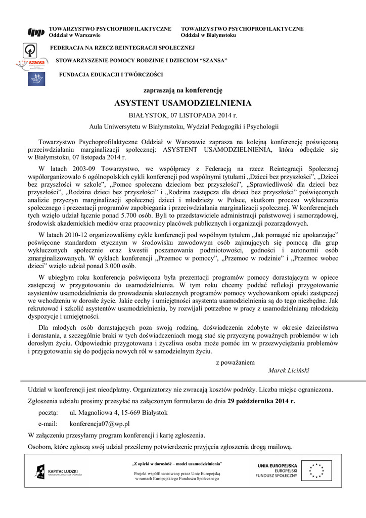 TOWARZYSTWO PSYCHOPROFILAKTYCZNE Oddział w Warszawie TOWARZYSTWO PSYCHOPROFILAKTYCZNE Oddział w Białymstoku FEDERACJA NA RZECZ REINTEGRACJI SPOŁECZNEJ STOWARZYSZENIE POMOCY RODZINIE I DZIECIOM “SZANSA” FUNDACJA EDUKACJI I TWÓRCZOŚCI zapraszają na konferencję ASYSTENT USAMODZIELNIENIA BIAŁYSTOK, 07 LISTOPADA 2014 r. Aula Uniwersytetu w Białymstoku, Wydział Pedagogiki i Psychologii Towarzystwo Psychoprofilaktyczne Oddział w Warszawie zaprasza na kolejną konferencję poświęconą przeciwdziałaniu marginalizacji społecznej: ASYSTENT USAMODZIELNIENIA, która odbędzie się w Białymstoku, 07 listopada 2014 r. W latach 2003-09 Towarzystwo, we współpracy z Federacją na rzecz Reintegracji Społecznej współorganizowało 6 ogólnopolskich cykli konferencji pod wspólnymi tytułami „Dzieci bez przyszłości”, „Dzieci bez przyszłości w szkole”, „Pomoc społeczna dzieciom bez przyszłości”, „Sprawiedliwość dla dzieci bez przyszłości”, „Rodzina dzieci bez przyszłości” i „Rodzina zastępcza dla dzieci bez przyszłości” poświęconych analizie przyczyn marginalizacji społecznej dzieci i młodzieży w Polsce, skutkom procesu wykluczenia społecznego i prezentacji programów zapobiegania i przeciwdziałania marginalizacji społecznej. W konferencjach tych wzięło udział łącznie ponad 5.700 osób. Byli to przedstawiciele administracji państwowej i samorządowej, środowisk akademickich mediów oraz pracownicy placówek publicznych i organizacji pozarządowych. W latach 2010-12 organizowaliśmy cykle konferencji pod wspólnym tytułem „Jak pomagać nie upokarzając” poświęcone standardom etycznym w środowisku zawodowym osób zajmujących się pomocą dla grup wykluczonych społecznie oraz kwestii poszanowania podmiotowości, godności i autonomii osób zmarginalizowanych. W cyklach konferencji „Przemoc w pomocy”, „Przemoc w rodzinie” i „Przemoc wobec dzieci” wzięło udział ponad 3.000 osób. W ubiegłym roku konferencja poświęcona była prezentacji programów pomocy dorastającym w opiece zastępczej w przygotowaniu do usamodzielnienia. W tym roku chcemy poddać refleksji przygotowanie asystentów usamodzielnienia do prowadzenia skutecznych programów pomocy wychowankom opieki zastępczej we wchodzeniu w dorosłe życie. Jakie cechy i umiejętności asystenta usamodzielnienia są do tego niezbędne. Jak rekrutować i szkolić asystentów usamodzielnienia, by rozwijali potrzebne w pracy z usamodzielnianą młodzieżą dyspozycje i umiejętności. Dla młodych osób dorastających poza swoją rodziną, doświadczenia zdobyte w okresie dzieciństwa i dorastania, a szczególnie braki w tych doświadczeniach mogą stać się przyczyną poważnych problemów w ich dorosłym życiu. Odpowiednio przygotowana i życzliwa osoba może pomóc im w przezwyciężaniu problemów i przygotowaniu się do podjęcia nowych ról w samodzielnym życiu. z poważaniem Marek Liciński Udział w konferencji jest nieodpłatny. Organizatorzy nie zwracają kosztów podróży. Liczba miejsc ograniczona. Zgłoszenia udziału prosimy przesyłać na załączonym formularzu do dnia 29 października 2014 r. pocztą: ul. Magnoliowa 4, 15-669 Białystok e-mail: [email protected] W załączeniu przesyłamy program konferencji i kartę zgłoszenia. Osobom, które zgłoszą swój udział prześlemy potwierdzenie przyjęcia zgłoszenia drogą mailową. „Z opieki w dorosłość – model usamodzielnienia” Projekt współfinansowany przez Unię Europejską w ramach Europejskiego Funduszu Społecznego