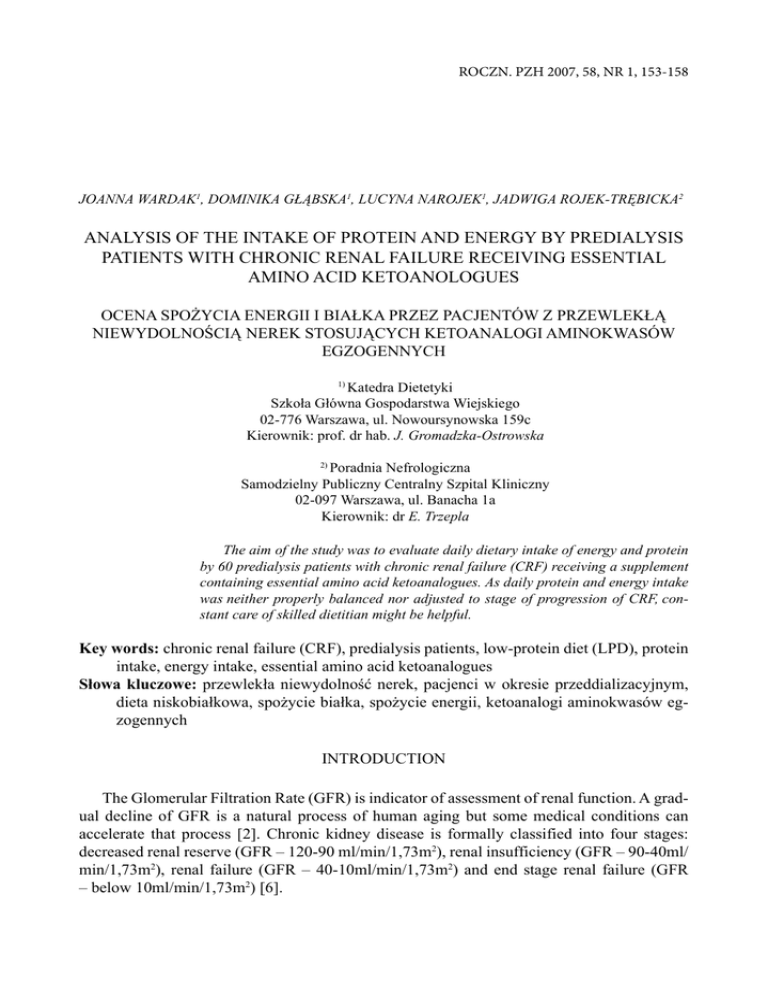 ROCZN. PZH 2007, 58, NR 1, 153-158 JOANNA WARDAK1, DOMINIKA GŁĄBSKA1, LUCYNA NAROJEK1, JADWIGA ROJEK-TRĘBICKA2 ANALYSIS OF THE INTAKE OF PROTEIN AND ENERGY BY PREDIALYSIS PATIENTS WITH CHRONIC RENAL FAILURE RECEIVING ESSENTIAL AMINO ACID KETOANOLOGUES OCENA SPOŻYCIA ENERGII I BIAŁKA PRZEZ PACJENTÓW Z PRZEWLEKŁĄ NIEWYDOLNOŚCIĄ NEREK STOSUJĄCYCH KETOANALOGI AMINOKWASÓW EGZOGENNYCH Katedra Dietetyki Szkoła Główna Gospodarstwa Wiejskiego 02-776 Warszawa, ul. Nowoursynowska 159c Kierownik: prof. dr hab. J. Gromadzka-Ostrowska 1) 2) Poradnia Nefrologiczna Samodzielny Publiczny Centralny Szpital Kliniczny 02-097 Warszawa, ul. Banacha 1a Kierownik: dr E. Trzepla The aim of the study was to evaluate daily dietary intake of energy and protein by 60 predialysis patients with chronic renal failure (CRF) receiving a supplement containing essential amino acid ketoanalogues. As daily protein and energy intake was neither properly balanced nor adjusted to stage of progression of CRF, constant care of skilled dietitian might be helpful. Key words: chronic renal failure (CRF), predialysis patients, low-protein diet (LPD), protein intake, energy intake, essential amino acid ketoanalogues Słowa kluczowe: przewlekła niewydolność nerek, pacjenci w okresie przeddializacyjnym, dieta niskobiałkowa, spożycie białka, spożycie energii, ketoanalogi aminokwasów egzogennych INTRODUCTION The Glomerular Filtration Rate (GFR) is indicator of assessment of renal function. A gradual decline of GFR is a natural process of human aging but some medical conditions can accelerate that process [2]. Chronic kidney disease is formally classified into four stages: decreased renal reserve (GFR – 120-90 ml/min/1,73m2), renal insufficiency (GFR – 90-40ml/ min/1,73m2), renal failure (GFR – 40-10ml/min/1,73m2) and end stage renal failure (GFR – below 10ml/min/1,73m2) [6]. 154 J. Wardak i in. Nr 1 For many years Low-Protein Diet (LPD) have been proposed to patients with Chronic Renal Failure (CRF) to correct uremic symptoms and metabolic complications of uremia [1]. Current guidelines suggest diet containing 0,6-0,8 g protein per kilogram of body weight per day, 50% of which should be protein of high biological value (animal protein containing essential amino acids) [3]. LPD is said to be better option, when it includes supplements with essential amino acid ketoanalogues [12]. At the same time substantial restrictions in protein supply without adequate energy intake may lead to malnutrition which is known as mortality risk factor in patients with CRF, therefore 30-35 kcal per kilogram of body weight per day is recommended [5, 2]. The aim of the study was to evaluate daily dietary intake of energy and protein by predialysis patients with chronic renal failure (CRF) receiving a supplement containing essential amino acid ketoanalogues. MATERIALS AND METHODS The study was carried out on 60 patients with CRF of different etiology receiving a supplement containing essential amino acid ketoanalogues and being monitored in outpatient clinics in Warsaw. Thirty-three male patients aged 32-83 years (GFR: 25,1±3,5ml/min/1,73m2) and 27 female patients aged 43-83 years (GFR: 16±5,23) were qualified to the study. GFR was assessed by the calculation of Cockcroft and Gault. Assessment of the patients diet was based on their three-day dietary recall. The results were analyzed using the computer program „Dietetyk 2” with the base of nutritional value of products [8] and on the base of „Gluten-free products composition and nutritive value” [9]. The statistical analysis was conducted using the computer program Statgraphics Plus 4.0. The intake of energy, protein (containing amino acids from supplements) as well as energy and protein per kilogram of body weight per day were tested by means of two-sample t test (hypothesis test) to compare diets between groups (GFR≤15, GFR>15ml/min./1,73m2; male, female; BMI≤20, BMI∈(20 – 25), BMI ≥25; age≤60, age>60). The multiple variable analysis (coefficient of correlations by Pearson) was used to asses dependences between analyzed factors as well as between protein and energy intake. RESULTS AND DISCUSSION The intake of energy (kcal per day and kcal per kilogram of body weight per day), protein, animal protein, and protein including supplements (g per day and g per kilogram of body weight per day) are presented in Table I. The results showed that the diet of examined patients was not properly balanced. In the large quantity of patients – 33% (38% when ketoanalogues supplementation was taken into account) protein overnutrition was observed (as consumed more than 0,8g of protein per kilogram of body weight per day). Only 37% of patients (33% when ketoanalogues supplementation was taken into account) had adequate protein intake. Unlimited intake of protein-rich food may contribute to progressive loss of renal function [10]. Only 12% of the group had the adequate calories intake, while 88% of patients did not have sufficient energy intake (below 30kcal per kilogram of body weight per day). The outcomes of our study demonstrated also that decrease of total protein and animal protein intake (in g per day) was related to decrease of energy intake (in kcal per day) (Figure 1). Low energy intake might p Mean ± SD Mean ± SD [g] [g/kg a] [g] [g/kg a] [g/1000kcalb] - 0,0851* - - - 0,0832* - 30,1±7,8 1598±333 24,8±5,2 46,5±15,6 0,72±0,24 28,8±13,2 0,45±0,20 48,3±15,7 0,75±0,24 - 1614±416 23,2±6,7 50,9±17,6 0,73±0,26 31,6±15,2 0,45±0,22 52,8±17,7 0,75±0,27 - 32,9±8,4 0,0937* - 0,0470** 0,0218** - 34,4±8,8 1527±344 21,6±5,8 50,7±17,1 0,71±0,26 32,4±15,1 0,46±0,23 52,6±17,1 0,74±0,27 - 30,7±7,3 1744±485 25,6±7,3 51,3±18,7 0,75±0,27 30,4±15,7 0,44±0,22 53,2±18,8 0,78±0,27 - 35,6±8,4 0,0135** - 20,6±6,2 54,8±19,0 0,70±0,24 34,2±16,8 0,43±0,21 56,8±19,0 0,72±0,24 0,0036** 0,0221** 0,0187** 0,0079** 0,0789* 0,0793* 0,0006** 0,0147** 0,0990* 