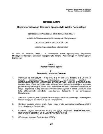 Załącznik do Uchwały Nr 34/2009 Senatu WUM z dnia 18.05.2009 REGULAMIN Międzynarodowego Centrum Epigenetyki Wieku Podeszłego sporządzony w Warszawie dnia 23 kwietnia 2009 r. w imieniu Warszawskiego Uniwersytetu Medycznego JEGO MAGNIFICENCJA REKTOR podaje do powszechnej wiadomości: W dniu 23 kwietnia 2008 r. w Warszawie został sporządzony Regulamin Międzynarodowego Centrum Epigenetyki Wieku Podeszłego w następującym brzmieniu: Dział I Postanowienia ogólne § 1. Powołanie i siedziba Centrum 1. Powołuje się niniejszym – w oparciu o § 14 ust. 2 w związku z § 26 ust. 2 Statutu Warszawskiego Uniwersytetu Medycznego (WUM) MIĘDZYNARODOWE CENTRUM EPIGENETYKI WIEKU PODESZŁEGO (zwane dalej "Centrum") jako jednostkę ogólnouczelnianą skupiającą wybrane jednostki organizacyjne WUM oraz afiliowane ośrodki naukowo-badawcze w kraju i zagranicą. Listę jednostek WUM wchodzących w skład Centrum oraz listę afiliowanych ośrodków przedstawia Załącznik 1 do niniejszego Regulaminu. 2. Siedzibą Centrum jest Wydział Farmaceutyczny Warszawskiego Uniwersytetu Medycznego; ul. Banacha 1, 02-097 Warszawa. 3. Centrum posiada własny znak. Opis i wzór znaku przedstawiają Załączniki 2 i 3 do niniejszego Regulaminu. 4. Centrum uŜywa tłumaczeń nazwy na język angielski: INTERNATIONAL RESEARCH CENTER OF ELDERLY EPIGENETICS 5. Oficjalnym skrótem Centrum jest: EDEN § 2. Cele Celami Centrum są: 1. Opracowanie nowoczesnych standardów medyczno-farmaceutycznych dla prawidłowej diagnostyki i leczenia chorób u ludzi w podeszłym wieku. 2. Stworzenie programu funkcjonowania opieki medycznej i farmaceutycznej poprawiającego jakość Ŝycia ludzi w podeszłym wieku. 3. Podejmowanie międzynarodowej współpracy w kierunku składania wniosków o wspólne projekty badawcze oraz skutecznego pozyskiwania funduszy dla ich realizacji. 4. Promowanie wykorzystania najnowszych osiagnięć nauki i techniki w rozwiązywaniu kluczowych problemów zdrowotnych u ludzi w podeszłym wieku. 5. Tworzenie wielopłaszczyznowych forów wymiany informacji naukowych oraz działań typu „know-how”. 6. Stymulowanie powstawania „inkubatorów innowacji” dla inicjowania wdroŜeń wyników badań naukowych i prac rozwojowych. 7. Tworzenie programu nowoczesnego kształcenia lekarzy i farmaceutów w zakresie tematyki naukowej Centrum. 8. Zwiększanie szans na promocję młodych kadr naukowych. 9. Integrowanie środowiska lekarskiego i farmaceutycznego podejmowania wspólnych inicjatyw naukowo-badawczych. w kierunku § 3. Funkcje Dla realizacji swych celów Centrum podejmuje konieczne i stosowne działania, a w szczególności: 1. Prowadzi badania naukowe w zakresie: 1) przedklinicznej i klinicznej oceny procesów i mechanizmów regulujących czynnościową, metaboliczną i strukturalną homeostazę ustroju w warunkach zdrowia i wybranych jednostek chorobowych u ludzi w podeszłym wieku; 2) opracowania nowoczesnych procedur leczenia chorób u ludzi w podeszłym wieku, a w szczególności naukowego zdefiniowania odmienności i specyfiki postępowania w zakresie farmakoterapii geriatrycznej, fizjologicznych podstaw rehabilitacji i aktywności ruchowej oraz optymalizacji sposobów Ŝywienia u ludzi chorych w podeszłym wieku; 2 3) opracowania nowoczesnych metod diagnozowania wybranych jednostek chorobowych u ludzi w podeszłym wieku ze szczególnym uwzględnieniem technik (epi)genomiki, proteomiki, metabolomiki, farmako(epi)genomiki i toksyko(epi)gonomiki; 4) analiz farmako-ekonomicznych w grupach terapeutycznych ATC (geriatric pharmacovigilance), w tym m.in., oceny konsumpcji rynkowej leków i optymalizacji kosztów leczenia przez ludzi w podeszłym wieku, zasad prowadzenia profilaktyki pro-zdrowotnej, adaptacji podstaw fizjologii Ŝywienia oraz optymalizacji procedur farmakoterapii wybranych jednostek chorobowych u ludzi w podeszłym wieku. 2. Promuje kontakty między środowiskami naukowców z róŜnych dziedzin nauk biomedycznych i farmaceutycznych poprzez m.in., tworzenie ramowych programów umoŜliwiających wspólne podejmowania badań naukowych. 3. Organizuje spotkania międzynarodowych grup ekspertów w celu wzmocnienia działalności naukowo-badawczej Centrum oraz jego roli w skali krajowej i międzynarodowej. 4. Podejmuje szkolenia dla pracowników naukowych Centrum, a w szczególności młodych kadr naukowych. 5. Prowadzi usługi doradcze mające na celu rozwój i wdraŜanie nowoczesnych metod diagnostyki i leczenia chorób u ludzi w podeszłym wieku. Dział II Organy Centrum § 4. Organy 1. Organami Centrum są: 1) 2) 3) 4) Rada Administracyjna Rada Naukowa Międzynarodowy Komitet Doradców Naukowych Sekretariat 2. Rada Administracyjna moŜe zgodnie z § 5 i 6 powoływać inne organy pomocnicze. § 5. Rada Administracyjna 1. Rada Administracyjna składa się z 5 stałych członków, tj. Dziekanów Wydziałów WUM i Kierownika Centrum Kształcenia Podyplomowego WUM. 2. Przewodniczącym Rady Administracyjnej jest Dziekan Wydziału Farmaceutycznego WUM - jako jednostki inicjującej powstanie Centrum, pełni on teŜ funkcję Dyrektora Centrum. 3. Dyrektor Centrum powołuje swego Zastępcę, który jednocześnie pełni funkcje Kierownika Sekretariatu Centrum zgodnie z § 8 ust. 1 i 2. 3 4. Organami doradczymi Rady Administracyjnej Międzynarodowy Komitet Doradców Naukowych. 5. Do zadań Rady Administracyjnej naleŜą: są: Rada Naukowa i 1) Określanie głównych kierunków i zasad działalności Centrum; 2) Zatwierdzanie programu działania i rocznych planów rzeczowofinansowych Centrum, będących elementem planu rzeczowofinansowego WUM, po uwzględnieniu zaleceń i opinii Rady Naukowej i Międzynarodowego Komitetu Doradców Naukowych; 3) Decydowanie o sprawach finansowych, w zakresie ustalania zasad pozyskiwania i wydatkowania środków finansowych dla skutecznego prowadzenia Centrum; 4) Ustanawianie, zgodnie z § 12, zasad regulujących prawa patentowe, licencyjne, autorskie i inne dotyczące w