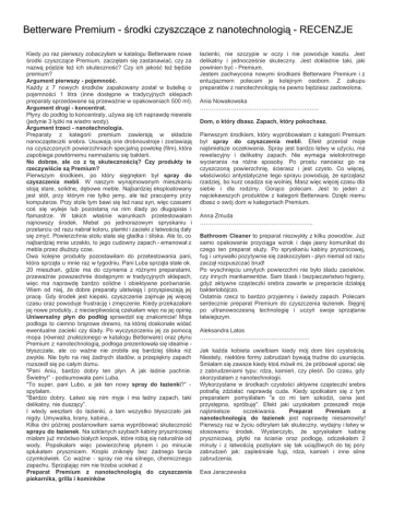 Betterware Premium środki czyszczące z nanotechnologią RECENZJE Kiedy po raz pierwszy zobaczyłam w katalogu Betterware nowe środki czyszczące Premium, zaczęłam się zastanawiać, czy za nazwą pójdzie też ich skuteczność? Czy ich jakość też będzie premium? Argument pierwszy pojemność. Każdy z 7 nowych środków zapakowany został w butelkę o pojemności 1 litra (inne dostępne w tradycyjnych sklepach preparaty sprzedawane są przeważnie w opakowaniach 500 ml). Argument drugi koncentrat. Płyny do podłóg to koncentraty, używa się ich naprawdę niewiele (jedynie 3 łyżki na wiadro wody). Argument trzeci nanotechnologia. Preparaty z kategorii premium zawierają w składzie nanocząsteczki srebra. Usuwają one drobnoustroje i zostawiają na czyszczonych powierzchniach specjalną powłokę (film), która zapobiega powtórnemu namnażaniu się bakterii. No dobrze, ale co z tą skutecznością? Czy produkty te rzeczywiście są Premium? Pierwszym środkiem, po który sięgnęłam był spray do czyszczenia mebli . W naszym wynajmowanym mieszkaniu stoją stare, solidne, dębowe meble. Najbardziej eksploatowany jest stół, przy którym nie tylko jemy, ale też pracujemy przy komputerze. Przy stole tym bawi się też nasz syn, więc czasami coś się wyleje lub pozostaną na nim ślady po długopisie i flamastrze. W takich właśnie warunkach przetestowałam najnowszy środek. Mebel po jednorazowym spryskaniu i przetarciu od razu nabrał koloru, plamki i zacieki z łatwością dały się zmyć. Powierzchnia stołu stała się gładka i śliska. Ale to, co najbardziej mnie urzekło, to jego cudowny zapach emanował z mebla przez dłuższy czas. Dwa kolejne produkty pozostawiłam do przetestowania pani, która sprząta u mnie raz w tygodniu. Pani Luba sprząta stale ok. 20 mieszkań, gdzie ma do czynienia z różnymi preparatami, przeważnie powszechnie dostępnymi w tradycyjnych sklepach, więc ma naprawdę bardzo solidne i obiektywne porównanie. Wiem od niej, że dobre preparaty ułatwiają i przyspieszają jej pracę. Gdy środek jest kiepski, czyszczenie zajmuje jej więcej czasu oraz powoduje frustrację i zmęczenie. Kiedy przekazałam jej nowe produkty, z niecierpliwością czekałam więc na jej opinię. Uniwersalny płyn do podłóg sprawdził się znakomicie! Moja podłoga to ciemno brązowe drewno, na której doskonale widać ewentualne zacieki czy ślady. Po wyczyszczeniu jej za pomocą mopa (również znalezionego w katalogu Betterware) oraz płynu Premium z nanotechnologią, podłoga prezentowała się idealnie błyszczała, ale co ważne nie zrobiła się bardziej śliska niż zwykle. Nie było na niej żadnych śladów, a przepiękny zapach rozszedł się po całym domu. "Pani Aniu, bardzo dobry ten płyn. A jak ładnie pachnie. Świetny!” podsumowała pani Luba. "To super, pani Lubo, a jak ten nowy spray do łazienki ?” spytałam. "Bardzo dobry. Łatwo się nim myje i ma ładny zapach, taki delikatny, nie duszący”. I wtedy weszłam do łazienki, a tam wszystko błyszczało jak nigdy. Umywalka, krany, kabina... Kilka dni później postanowiłam sama wypróbować skuteczność sprayu do łazienek . Na szklanych szybach kabiny prysznicowej miałam już mnóstwo białych kropek, które robią się naturalnie od wody. Popsikałam więc powierzchnię płynem i po minucie spłukałam prysznicem. Kropki zniknęły bez żadnego tarcia czymkolwiek. Co ważne spray nie ma silnego, chemicznego zapachu. Sprzątając nim nie trzeba uciekać z Preparat Premium z nanotechnologią do czyszczenia piekarnika, grilla i kominków łazienki, nie szczypie w oczy i nie powoduje kaszlu. Jest delikatny i jednocześnie skuteczny. Jest dokładnie taki, jaki powinien być Premium. Jestem zachwycona nowymi środkami Betterware Premium i z entuzjazmem polecam je kolejnym osobom. Z zakupu preparatów z nanotechnologią na pewno będziesz zadowolona. Ania Nowakowska …………………………………………………….. Dom, o który dbasz. Zapach, który pokochasz. Pierwszym środkiem, który wypróbowałam z kategorii Premium był spray do czyszczenia mebli . Efekt przerósł moje najśmielsze oczekiwania. Spray jest bardzo łatwy w użyciu, ma rewelacyjny i delikatny zapach. Nie wymaga wielokrotnego wycierania na różne sposoby. Po prostu nanosisz go na czyszczoną powierzchnię, ścierasz i jest czysto. Co więcej, właściwości antystatyczne tego sprayu powodują, że sprzątasz rzadziej, bo kurz osadza się wolniej. Masz więc więcej czasu dla siebie i dla rodziny. Gorąco polecam. Jest to jeden z najciekawszych produktów z kategorii Betterware. Dzięki niemu dbasz o swój dom w kategoriach Premium. Anna Zmuda ………………………………………………….. Bathroom Cleaner to preparat niezwykły z kilku powodów. Już samo opakowanie przyciąga wzrok i daje jasny komunikat do czego ten preparat służy. Po spryskaniu kabiny prysznicowej, fug i umywalki pozytywnie się zaskoczyłam płyn niemal od razu zaczął rozpuszczać brud! Po wyschnięciu umytych powierzchni nie było śladu zacieków, czy innych mankamentów. Sam blask i bezpieczeństwo higieny, gdyż aktywne cząsteczki srebra zawarte w preparacie działają bakteriobójczo. Ostatnia rzecz to bardzo przyjemny i świeży zapach. Polecam serdecznie preparat Premium do czyszczenia łazienek. Sięgnij po ultranowoczesną technologię i uczyń swoje sprzątanie łatwiejszym. Aleksandra Latos ………………………………………………… Jak każda kobieta uwielbiam kiedy mój dom lśni czystością. Niestety, niektóre formy zabrudzeń bywają trudne do usunięcia. Śmiałam się zawsze kiedy ktoś mówił mi, że próbował uporać się z zabrudzeniami typu: rdza, kamień, czy pleśń. Do czasu, gdy skorzystałam z nanotechnologii. Wykorzystane w środkach czystości aktywne cząsteczki srebra potrafią zdziałać naprawdę cuda. Kiedy spotkałam się z tym preparatem pomyślałam "a c
