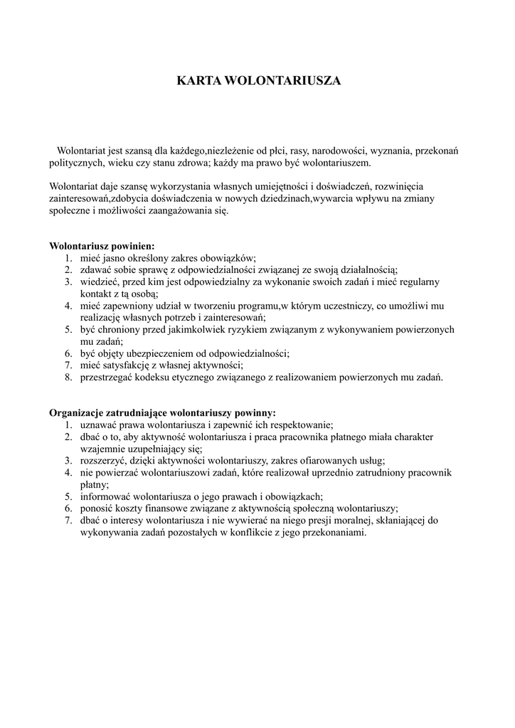KARTA WOLONTARIUSZA Wolontariat jest szansą dla każdego,niezleżenie od płci, rasy, narodowości, wyznania, przekonań politycznych, wieku czy stanu zdrowa; każdy ma prawo być wolontariuszem. Wolontariat daje szansę wykorzystania własnych umiejętności i doświadczeń, rozwinięcia zainteresowań,zdobycia doświadczenia w nowych dziedzinach,wywarcia wpływu na zmiany społeczne i możliwości zaangażowania się. Wolontariusz powinien: 1. mieć jasno określony zakres obowiązków; 2. zdawać sobie sprawę z odpowiedzialności związanej ze swoją działalnością; 3. wiedzieć, przed kim jest odpowiedzialny za wykonanie swoich zadań i mieć regularny kontakt z tą osobą; 4. mieć zapewniony udział w tworzeniu programu,w którym uczestniczy, co umożliwi mu realizację własnych potrzeb i zainteresowań; 5. być chroniony przed jakimkolwiek ryzykiem związanym z wykonywaniem powierzonych mu zadań; 6. być objęty ubezpieczeniem od odpowiedzialności; 7. mieć satysfakcję z własnej aktywności; 8. przestrzegać kodeksu etycznego związanego z realizowaniem powierzonych mu zadań. Organizacje zatrudniające wolontariuszy powinny: 1. uznawać prawa wolontariusza i zapewnić ich respektowanie; 2. dbać o to, aby aktywność wolontariusza i praca pracownika płatnego miała charakter wzajemnie uzupełniający się; 3. rozszerzyć, dzięki aktywności wolontariuszy, zakres ofiarowanych usług; 4. nie powierzać wolontariuszowi zadań, które realizował uprzednio zatrudniony pracownik płatny; 5. informować wolontariusza o jego prawach i obowiązkach; 6. ponosić koszty finansowe związane z aktywnością społeczną wolontariuszy; 7. dbać o interesy wolontariusza i nie wywierać na niego presji moralnej, skłaniającej do wykonywania zadań pozostałych w konflikcie z jego przekonaniami. KODEKS ETYCZNY WOLONTARIUSZA Wolontariusz powinien: być pewnym- zastanów się, dlaczego chcesz pomagać innym ludziom; być przekonanym- nie ofiaruj swej pomocy, jeżeli nie jesteś przekonany o wartości tego, co robisz; być lojalnym- zgłaszaj sugestie, nie „ uderzaj” w innych; przestrzegać zasad – nie krytykuj rzeczy, których nie rozumiesz, może okazać się, że mają swoje uzasadnienie; mów otwarcie- pytaj o rzeczy, których nie rozumiesz, nie pozwól, by tłumione wątpliwości i frustracje odciągały cię od tego co najważniejsze bądź zmieniły w osobę stwarzająca problemy; chętnie ucz się- rozszerzaj swoją wiedzę; stale się rozwijać- staraj się wiedzieć jak najwięcej o organizacji, w których pracujesz i o powierzonej pracy; nie sprzeciwiać się kontroli nad sobą- będziesz pracował lepiej i z większą satysfakcją, wykonując to, czego się od ciebie oczekuje; być osobą, na której można polegać- praca jest zobowiązaniem, wykonaj to, co zgodziłeś się robić, nie składaj obietnic, których nie jesteś w stanie spełnić; działać w zespole- znajdź dla siebie miejsce w grupie; samotnik działający na własną rękę jest mało skuteczny. DANE OSOBOWE WOLONTARIUSZA Imię :.......................................................................................................................................... Nazwisko : ................................................................................................................................ Wiek: …..................................................................................................................................... Nr PESEL : …........................................................................................................................... Adres - stały : …................................................................................................................... - tymczasowy : …...................................................................................................... Telefon : - dom:........................................................................................................................... komórka: …............................................................................................................... praca : …................................................................................................................... e- mail : ….................................................................................................................................. Rodzaj wykonywanej pracy lub szkoła, studia ( kierunek studiów lub profil szkoły) : ….............................................................................................................................................. Dodatkowe umiejętności,ukończone kursy,szkolenia,języki obce itp.;................................... …...................................................................................................................................... Forma pracy w naszym wolontariacie: …..................................................................................................................................... Data zgłoszenia........................................................................................................................ Data odbytego szkolenia........................................................................................................... FORMULARZ DLA NIEPEŁNOLETNIEGO WOLONTARIUSZA IMIĘ: NAZWISKO: DATA URODZENIA: ADRES ZAMIESZKANIA: ulica dzielnica Kod pocztowy Tel. domowy Tel. kontaktowy/komórkowy E-mail PROSIMY O OKREŚLENIE BIEŻĄCEJ AKTYWNOŚCI ZAWODOWEJ : Uczeń Osoba pobierająca rentę Inne.:........................................ JEŚLI PRACUJESZ ZAROBKOWO,PROSIMY O PODANIE NASTĘPUJĄCYCH INFORMACJI: Nazwa : Organizacji, Firmy, Instytucji ….............................................................................................................................................................. Ulica: …...............................................................