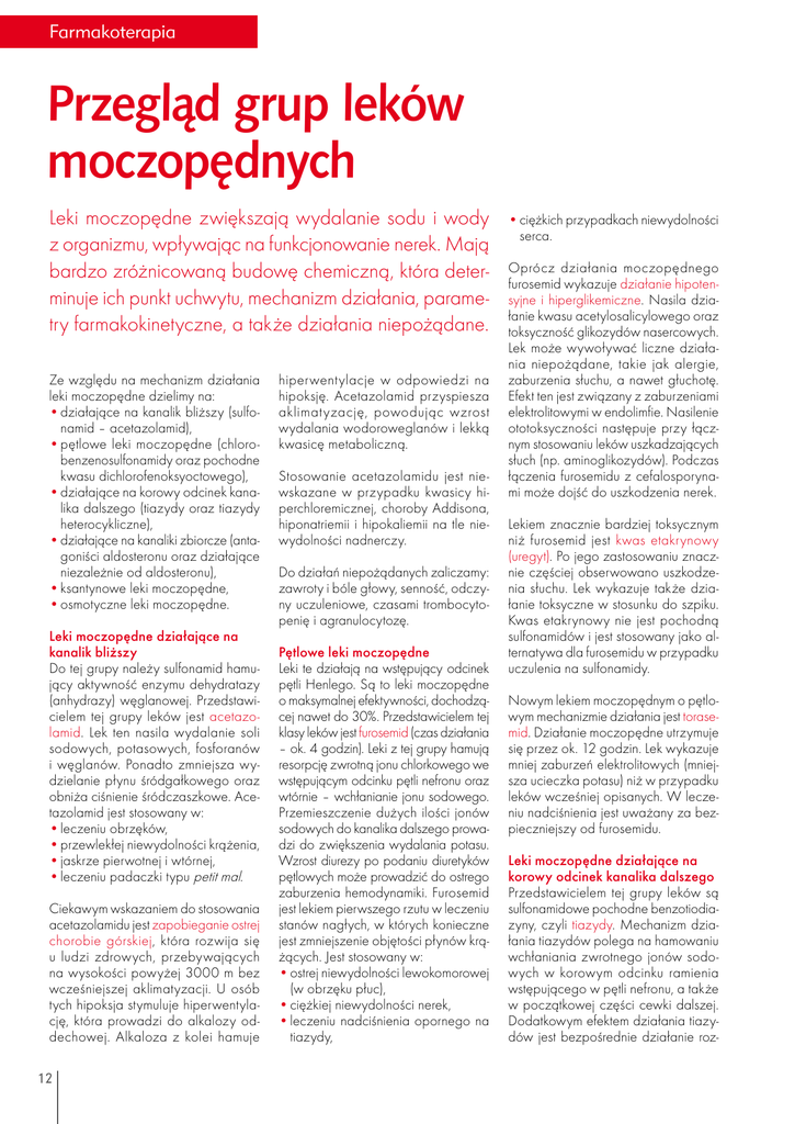 Farmakoterapia Przegl¹d grup leków moczopêdnych Leki moczopędne zwiększają wydalanie sodu i wody z organizmu, wpływając na funkcjonowanie nerek. Mają bardzo zróżnicowaną budowę chemiczną, która determinuje ich punkt uchwytu, mechanizm działania, parametry farmakokinetyczne, a także działania niepożądane. Ze względu na mechanizm działania leki moczopędne dzielimy na: •działające na kanalik bliższy (sulfonamid – acetazolamid), •pętlowe leki moczopędne (chlorobenzenosulfonamidy oraz pochodne kwasu dichlorofenoksyoctowego), •działające na korowy odcinek kanalika dalszego (tiazydy oraz tiazydy heterocykliczne), •działające na kanaliki zbiorcze (antagoniści aldosteronu oraz działające niezależnie od aldosteronu), •ksantynowe leki moczopędne, •osmotyczne leki moczopędne. Leki moczopędne działające na kanalik bliższy Do tej grupy należy sulfonamid hamujący aktywność enzymu dehydratazy (anhydrazy) węglanowej. Przedstawicielem tej grupy leków jest acetazolamid. Lek ten nasila wydalanie soli sodowych, potasowych, fosforanów i węglanów. Ponadto zmniejsza wydzielanie płynu śródgałkowego oraz obniża ciśnienie śródczaszkowe. Acetazolamid jest stosowany w: •leczeniu obrzęków, •przewlekłej niewydolności krążenia, •jaskrze pierwotnej i wtórnej, •leczeniu padaczki typu petit mal. Ciekawym wskazaniem do stosowania acetazolamidu jest zapobieganie ostrej chorobie górskiej, która rozwija się u ludzi zdrowych, przebywających na wysokości powyżej 3000 m bez wcześniejszej aklimatyzacji. U osób tych hipoksja stymuluje hiperwentylację, która prowadzi do alkalozy oddechowej. Alkaloza z kolei hamuje 12 hiperwentylacje w odpowiedzi na hipoksję. Acetazolamid przyspiesza aklimatyzację, powodując wzrost wydalania wodoroweglanów i lekką kwasicę metaboliczną. Stosowanie acetazolamidu jest niewskazane w przypadku kwasicy hiperchloremicznej, choroby Addisona, hiponatriemii i hipokaliemii na tle niewydolności nadnerczy. Do działań niepożądanych zaliczamy: zawroty i bóle głowy, senność, odczyny uczuleniowe, czasami trombocytopenię i agranulocytozę. Pętlowe leki moczopędne Leki te działają na wstępujący odcinek pętli Henlego. Są to leki moczopędne o maksymalnej efektywności, dochodzącej nawet do 30%. Przedstawicielem tej klasy leków jest furosemid (czas działania – ok. 4 godzin). Leki z tej grupy hamują resorpcję zwrotną jonu chlorkowego we wstępującym odcinku pętli nefronu oraz wtórnie – wchłanianie jonu sodowego. Przemieszczenie dużych ilości jonów sodowych do kanalika dalszego prowadzi do zwiększenia wydalania potasu. Wzrost diurezy po podaniu diuretyków pętlowych może prowadzić do ostrego zaburzenia hemodynamiki. Furosemid jest lekiem pierwszego rzutu w leczeniu stanów nagłych, w których konieczne jest zmniejszenie objętości płynów krążących. Jest stosowany w: •ostrej niewydolności lewokomorowej (w obrzęku płuc), •ciężkiej niewydolności nerek, •leczeniu nadciśnienia opornego na tiazydy, •ciężkich przypadkach niewydolności serca. Oprócz działania moczopędnego furosemid wykazuje działanie hipotensyjne i hiperglikemiczne. Nasila działanie kwasu acetylosalicylowego oraz toksyczność glikozydów nasercowych. Lek może wywoływać liczne działania niepożądane, takie jak alergie, zaburzenia słuchu, a nawet głuchotę. Efekt ten jest związany z zaburzeniami elektrolitowymi w endolimfie. Nasilenie ototoksyczności następuje przy łącznym stosowaniu leków uszkadzających słuch (np. aminoglikozydów). Podczas łączenia furosemidu z cefalosporynami może dojść do uszkodzenia nerek. Lekiem znacznie bardziej toksycznym niż furosemid jest kwas etakrynowy (uregyt). Po jego zastosowaniu znacznie częściej obserwowano uszkodzenia słuchu. Lek wykazuje także działanie toksyczne w stosunku do szpiku. Kwas etakrynowy nie jest pochodną sulfonamidów i jest stosowany jako alternatywa dla furosemidu w przypadku uczulenia na sulfonamidy. Nowym lekiem moczopędnym o pętlowym mechanizmie działania jest torasemid. Działanie moczopędne utrzymuje się przez ok. 12 godzin. Lek wykazuje mniej zaburzeń elektrolitowych (mniejsza ucieczka potasu) niż w przypadku leków wcześniej opisanych. W leczeniu nadciśnienia jest uważany za bezpieczniejszy od furosemidu. Leki moczopędne działające na korowy odcinek kanalika dalszego Przedstawicielem tej grupy leków są sulfonamidowe pochodne benzotiodiazyny, czyli tiazydy. Mechanizm działania tiazydów polega na hamowaniu wchłaniania zwrotnego jonów sodowych w korowym odcinku ramienia wstępującego w pętli nefronu, a także w początkowej części cewki dalszej. Dodatkowym efektem działania tiazydów jest bezpośrednie działanie roz- Farmakoterapia kurczające na mięśniówkę gładką naczyń. U chorych na moczówkę prostą tiazydy paradoksalnie wykazują efekt antydiuretyczny na skutek zmniejszenia pragnienia z powodu obniżenia stężenia sodu w osoczu. Przedstawicielem leków tiazydowych jest hydrochlorotiazyd. Lek ten jest stosowany w: •niewydolności serca, •obrzękach pochodzenia nerkowego i wątrobowego. Do działań niepożądanych zaliczamy: zmniejszenie siły mięśniowej, hiperglikemię, osłabienie, senność i uczulenia. U chorych stosujących duże dawki leków tiazydowych jednocześnie z inhibitorami konwertazy angiotensynowej obserwowano gwałtowną hipotonię oraz ostrą niewydolność nerek. Lekami pochodnymi tiazydom są tzw. tiazydy heterocykliczne (chlortalidon, indapamid, klopamid). Leki te działają podobnie do tiazydów jednak dłużej. Stosowane są raz na dobę, co poprawia komfort chorego oraz eliminuje ryzyko pominięcia dawki leku. Działanie hipotensyjne jest związane dodatkowo z hamowaniem transportu wapnia w komórkach mięśni gładkich, dlatego są one stosowane przede wszystkim w leczeniu nadciśnienia oraz w niewydolności serca. Należy zwrócić uwagę na in