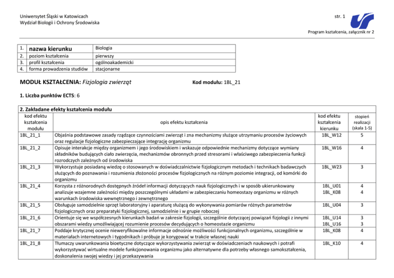 Uniwersytet Śląski w Katowicach Wydział Biologii i Ochrony Środowiska str. 1 Program kształcenia, załącznik nr 2 1. nazwa kierunku Biologia 2. 3. 4. poziom kształcenia profil kształcenia forma prowadzenia studiów pierwszy ogólnoakademicki stacjonarne MODUŁ KSZTAŁCENIA: Fizjologia zwierząt Kod modułu: 1BL_21 1. Liczba punktów ECTS: 6 2. Zakładane efekty kształcenia modułu kod efektu kształcenia modułu 1BL_21_1 1BL_21_2 1BL_21_3 1BL_21_4 1BL_21_5 1BL_21_6 1BL_21_7 1BL_21_8 opis efektu kształcenia Objaśnia podstawowe zasady rządzące czynnościami zwierząt i zna mechanizmy służące utrzymaniu procesów życiowych oraz regulacje fizjologiczne zabezpieczające integrację organizmu Opisuje interakcje między organizmem i jego środowiskiem i wskazuje odpowiednie mechanizmy dotyczące wymiany składników budujących ciało zwierzęcia, mechanizmów obronnych przed stresorami i właściwego zabezpieczenia funkcji rozrodczych zależnych od środowiska Wykorzystuje posiadaną wiedzę o stosowanych w doświadczalnictwie fizjologicznym metodach i technikach badawczych służących do poznawania i rozumienia złożoności procesów fizjologicznych na różnym poziomie integracji, od komórki do organizmu Korzysta z różnorodnych dostępnych źródeł informacji dotyczących nauk fizjologicznych i w sposób ukierunkowany analizuje wzajemne zależności między poszczególnymi układami w zabezpieczaniu homeostazy organizmu w różnych warunkach środowiska wewnętrznego i zewnętrznego Obsługuje samodzielnie sprzęt laboratoryjny i aparaturę służącą do wykonywania pomiarów różnych parametrów fizjologicznych oraz preparatyki fizjologicznej, samodzielnie i w grupie roboczej Orientuje się we współczesnych kierunkach badań w zakresie fizjologii, szczególnie dotyczącej powiązań fizjologii z innymi obszarami wiedzy umożliwiającej rozumienie procesów decydujących o homeostazie organizmu Poddaje krytycznej ocenie nieweryfikowalne informacje odnośnie możliwości funkcjonalnych organizmu, szczególnie w materiałach internetowych i tygodnikach i próbuje je korygować w trakcie własnej nauki Tłumaczy uwarunkowania bioetyczne dotyczące wykorzystywania zwierząt w doświadczeniach naukowych i potrafi wykorzystywać wirtualne modele funkcjonowania organizmu jako alternatywne dla potrzeby własnego samokształcenia, doskonalenia swojej wiedzy i jej przekazywania kod efektu kształcenia kierunku 1BL_W12 stopień realizacji (skala 1-5) 5 1BL_W16 4 1BL_W23 3 1BL_U01 1BL_K08 4 4 1BL_U04 3 1BL_U14 1BL_U16 1BL_K08 3 3 4 1BL_K10 4 Uniwersytet Śląski w Katowicach Wydział Biologii i Ochrony Środowiska str. 2 Program kształcenia, załącznik nr 2 3. Opis modułu Opis Wymagania wstępne modułu Celem modułu jest uzyskanie przez studenta (1) wiedzy dotyczącej funkcji organizmu zwierzęcia w zakresie poznania układów i mechanizmów zabezpieczających procesy życiowe, mechanizmów regulacji procesów fizjologicznych oraz relacji czynnościowych między środowiskiem i zwierzęciem w aspekcie porównawczym i szerszym uwzględnieniem fizjologii człowieka (2) uzyskanie praktycznych umiejętności wykonywania doświadczeń i analiz wybranych parametrów charakteryzujących funkcje różnych zwierząt ich właściwe opracowanie i interpretację wyników weryfikowaną na podstawie dostępnych materiałów źródłowych. Wykłady obejmują aspekty związane z zjawiskami integrującymi funkcje organizmu z wykorzystaniem różnych mechanizmów regulacji fizjologicznych. W oparciu o wiedzę uzyskaną o układach i mechanizmach służących utrzymaniu życia zwierzęcia i relacjach zwierzę – środowisko student poznaje zjawiska wiążące się z zachowaniem homeostazy i mechanizmach naprawczych. Ćwiczenia laboratoryjne uczą studentów przeprowadzania doświadczeń, pomiarów wybranych parametrów fizjologicznych oraz obserwacji, właściwego opracowywania zgromadzonych danych i ich statystycznej analizy oraz przygotowywania adekwatnych protokołów i wniosków z wykonywanych zadań, a także umiejętności ich weryfikacji na bazie dostępnych danych źródłowych. Uczą także zachowań bioetycznych względem zwierząt doświadczalnych i umiejętności korzystania z alternatywnych modeli fizjologicznych lub wirtualnych laboratoriów, tam gdzie nie można przeprowadzać doświadczeń na zwierzętach kręgowych. Student nabywa więc umiejętność korzystania z innych dostępnych źródeł informacji (filmy animacje komputerowe, modele komputerowe). Wiedza i umiejętności z zakresu nauk ścisłych, biochemii, wiedzy o komórkach i tkankach, znajomości świata zwierząt oraz o środowisku bytowania organizmu 4. Sposoby weryfikacji efektów kształcenia modułu Kod 1BL_21_w01 nazwa (typ) sposobu weryfikacji Zaliczenie końcowe 1BL_21_w02 Kolokwium 1Bl_21_w03 Ocena ciągła umiejętności praktycznych 1BL_21_w04 Raport z pracy laboratoryjnej opis szczegółowy Sprawdzian uzyskanej wiedzy (a także częściowo umiejętności) w zakresie wyznaczonym przez prowadzącego i w oparciu o zalecane podręczniki. Pisemne prace sprawdzające stopień zrozumienia, opanowania wiadomości i umiejętności nabytych w czasie laboratoriów Bieżąca ocena wykonywania ćwiczeń, rzetelności przeprowadzanych pomiarów, protokołów i raportów, obejmująca weryfikację otrzymanych wartości, poprawność przeprowadzonych obliczeń, poprawność opisu przebiegu doświadczenia, jego interpretacji i wnioskowania. Student przygotowuje raport zespołowy lub indywidualny opisujący procedury, wyniki i wnioski z przeprowadzonego doświadczenia, pomiarów lub analizy modelowej efekt(-y) kształcenia modułu 1BL_21_1, 1BL_21_2, 1BL_21_4, 1BL_21_6 1BL_21_1, 1BL_21_2, 1BL_21_3, 1BL_21_4; 1BL_21_6 1BL_21_3, 1BL_21_4, 1BL_21_5, 1BL_21_8 1BL_21_2, 1BL_21_3, 1BL_21_4; 1BL_21_7 Uniwersytet Śląski w Katowicach Wydział Biologii i Ochrony Środowiska str. 3 Program kształcenia, załącznik nr 2 5. Formy