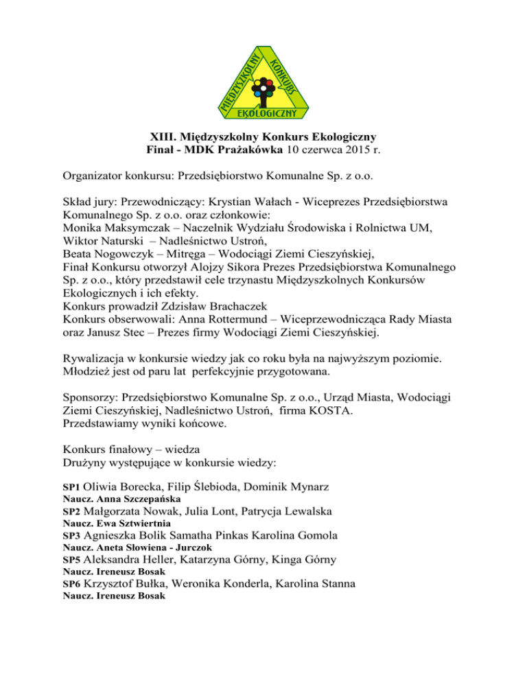 XIII. Międzyszkolny Konkurs Ekologiczny Finał - MDK Prażakówka 10 czerwca 2015 r. Organizator konkursu: Przedsiębiorstwo Komunalne Sp. z o.o. Skład jury: Przewodniczący: Krystian Wałach - Wiceprezes Przedsiębiorstwa Komunalnego Sp. z o.o. oraz członkowie: Monika Maksymczak – Naczelnik Wydziału Środowiska i Rolnictwa UM, Wiktor Naturski – Nadleśnictwo Ustroń, Beata Nogowczyk – Mitręga – Wodociągi Ziemi Cieszyńskiej, Finał Konkursu otworzył Alojzy Sikora Prezes Przedsiębiorstwa Komunalnego Sp. z o.o., który przedstawił cele trzynastu Międzyszkolnych Konkursów Ekologicznych i ich efekty. Konkurs prowadził Zdzisław Brachaczek Konkurs obserwowali: Anna Rottermund – Wiceprzewodnicząca Rady Miasta oraz Janusz Stec – Prezes firmy Wodociągi Ziemi Cieszyńskiej. Rywalizacja w konkursie wiedzy jak co roku była na najwyższym poziomie. Młodzież jest od paru lat perfekcyjnie przygotowana. Sponsorzy: Przedsiębiorstwo Komunalne Sp. z o.o., Urząd Miasta, Wodociągi Ziemi Cieszyńskiej, Nadleśnictwo Ustroń, firma KOSTA. Przedstawiamy wyniki końcowe. Konkurs finałowy – wiedza Drużyny występujące w konkursie wiedzy: SP1 Oliwia Borecka, Filip Ślebioda, Dominik Mynarz Naucz. Anna Szczepańska SP2 Małgorzata Nowak, Julia Lont, Patrycja Lewalska Naucz. Ewa Sztwiertnia SP3 Agnieszka Bolik Samatha Pinkas Karolina Gomola Naucz. Aneta Słowiena - Jurczok SP5 Aleksandra Heller, Katarzyna Górny, Kinga Górny Naucz. Ireneusz Bosak SP6 Krzysztof Bułka, Weronika Konderla, Karolina Stanna Naucz. Ireneusz Bosak Ponieważ 3 drużyny miały taką samą ilość punktów, odbyła się dogrywka by ustalić kolejność miejsc od II do IV w konkursie wiedzy. Szkoła SP 2 SP 6 SP 3 SP 1 SP 5 Wiedza punkty 63 62 62 62 61 miejsce I II III IV V Zebrane surowce wtórne XIII MKE 2014/15 makulatura baterie Szkoła Ilość uczniów (kg) (kg) SP1 272 9238 205 SP2 383 6409 144 SP3 80 1365 15 SP5 83 0 0 SP6 175 5040 511 G1 962 G2 864 Razem 993 23878 875 Wyniki konkursu plastycznego oraz zdjęcia przedstawione są w osobnym pliku. Wyniki końcowe: XIII Międzyszkolny Konkurs Ekologiczny 10 czerwiec 2015 r. wiedza plakat makulat. baterie razem Szkoła SP 1 62 41 10 3,5 118,5 SP 6 62 14 5,0 10 98,5 SP 2 63 14 5,1 1,3 83,3 SP 3 62 11 5 0,7 81,5 SP 5 61 0 0 0 61 Opracował: Jan Sztefek - Przedsiębiorstwo Komunalne Sp. z o.o. miejsce I II III IV V