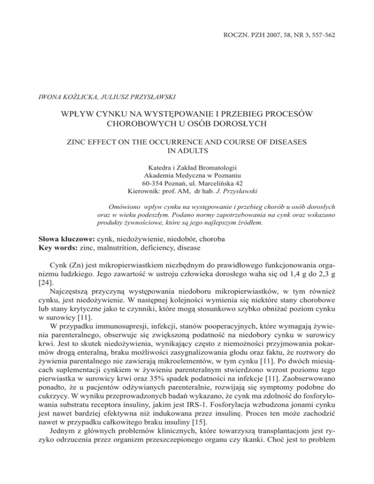 ROCZN. PZH 2007, 58, NR 3, 557-562 IWONA KOŹLICKA, JULIUSZ PRZYSŁAWSKI WPŁYW CYNKU NA WYSTĘPOWANIE I PRZEBIEG PROCESÓW CHOROBOWYCH U OSÓB DOROSŁYCH ZINC EFFECT ON THE OCCURRENCE AND COURSE OF DISEASES IN ADULTS Katedra i Zakład Bromatologii Akademia Medyczna w Poznaniu 60-354 Poznań, ul. Marcelińska 42 Kierownik: prof. AM, dr hab. J. Przysławski Omówiono wpływ cynku na występowanie i przebieg chorób u osób dorosłych oraz w wieku podeszłym. Podano normy zapotrzebowania na cynk oraz wskazano produkty żywnościowe, które są jego najlepszym źródłem. Słowa kluczowe: cynk, niedożywienie, niedobór, choroba Key words: zinc, malnutrition, deficiency, disease Cynk (Zn) jest mikropierwiastkiem niezbędnym do prawidłowego funkcjonowania organizmu ludzkiego. Jego zawartość w ustroju człowieka dorosłego waha się od 1,4 g do 2,3 g [24]. Najczęstszą przyczyną występowania niedoboru mikropierwiastków, w tym również cynku, jest niedożywienie. W następnej kolejności wymienia się niektóre stany chorobowe lub stany krytyczne jako te czynniki, które mogą stosunkowo szybko obniżać poziom cynku w surowicy [11]. W przypadku immunosupresji, infekcji, stanów pooperacyjnych, które wymagają żywienia parenteralnego, obserwuje się zwiększoną podatność na niedobory cynku w surowicy krwi. Jest to skutek niedożywienia, wynikający często z niemożności przyjmowania pokarmów drogą enteralną, braku możliwości zasygnalizowania głodu oraz faktu, że roztwory do żywienia parentalnego nie zawierają mikroelementów, w tym cynku [11]. Po dwóch miesiącach suplementacji cynkiem w żywieniu parenteralnym stwierdzono wzrost poziomu tego pierwiastka w surowicy krwi oraz 35% spadek podatności na infekcje [11]. Zaobserwowano ponadto, że u pacjentów odżywianych parenteralnie, rozwijają się symptomy podobne do cukrzycy. W wyniku przeprowadzonych badań wykazano, że cynk ma zdolność do fosforylowania substratu receptora insuliny, jakim jest IRS-1. Fosforylacja wzbudzona jonami cynku jest nawet bardziej efektywna niż indukowana przez insulinę. Proces ten może zachodzić nawet w przypadku całkowitego braku insuliny [15]. Jednym z głównych problemów klinicznych, które towarzyszą transplantacjom jest ryzyko odrzucenia przez organizm przeszczepionego organu czy tkanki. Choć jest to problem 558 Nr 3 I. Koźlicka, J. Przysławski złożony, to wiadomo, że jednym z jego elementów jest stres oksydacyjny. Stres oksydacyjny występuje wtedy, kiedy poziom wolnych rodników przekracza ilość przeciwutleniaczy dostępnych w postaci enzymów (dyzmutazy ponadtlenkowej –SOD, peroksydazy glutationuGSH-Px, reduktazy glutationu-GR) oraz czynników nieenzymatycznych (wit.E, albuminy, kwasu moczowego, bilirubiny i pierwiastków śladowych, jak: cynk, selen i miedź). Rola cynku w zapobieganiu skutkom stresu oksydacyjnego wynika z faktu, że jest on kofaktorem dysmutazy ponadtlenkowej [4]. Zauważono, że w warunkach stresu oksydacyjnego zaburzony jest metabolizm prostaglandyn i sekrecja cytokin, które powstają w wyniku metabolizmu kwasu linolowego. Wydaje się, że przyczyną może być niedobór cynku, który jest niezbędny w metabolizmie kwasu linolowego, w miejscu jego desaturacji do kwasu γ-linolenowego i, być może, w przemianie kwasu dihomo- γ-linolenowego do kwasu arachidonowego, wpływając w ten sposób na syntezę prostaglandyn [8]. Rolę cynku jako podstawowego kofaktora w metabolizmie kwasu linolowego przedstawia poniższy schemat (Ryc. 1) Kwas linolowy (18:2, n-6) ǻ6 desaturacja Zn przenoszony przez albuminy Kwas Ȗ-linolenowy (18:3, n-6) elongacja Kwas dihomo- Ȗ-linolenowy (20:3, n-6) ǻ5 desaturacja Kwas arachidonowy (20:4, n-6) elongacja 1 seria eikozanoidów Prostaglandyny E1 ,F1 Tromboksany A1 Leukotrieny A3,C3,D3 2 seria eikozanoidów Prostaglandyny E2 F2 I2 Tromboksany A2 Leukotrieny A4, B4 ,C4 ,D4 22:4, n-6 Ryc. 1. Schemat metabolizmu kwasu linolowego [wg 8] Fig. 1. Metabolism of linoleic acid [8] 1. Schemat metabolizmu kwasu [wg 8] Cynk jestRyc. ważnym składnikiem wielulinolowego białek strukturalnych. Jony cynku znajdują się prakMetabolism of linoleic acid [8] tycznie w całym układzie nerwowym. W mózgu wchodzą w skład zakończeń nerwowych presynaptycznych. Cynk zmniejsza wiązanie dopaminy w śródmózgowiu. Może to uzasadniać zmniejszenie się intensywności występowania objawów lekozależności po zaprzestaniu podawania niektórych preparatów z grupy opiatów np. morfiny [6]. Zwraca uwagę niski poziom cynku w płynie mózgowo-rdzeniowym osób dotkniętych chorobą Alzheimera w stosunku nie tylko do osób zdrowych, lecz również w odniesieniu do osób z zaburzeniami świadomości o innej etiologii [13]. Może to świadczyć o szczególnej roli cynku w patogenezie choroby Alzheimera. Uważa się, że głównym czynnikiem patogen- Nr 3 Cynku a występowanie procesów chorobowych u osób dorosłych 559 nym w przypadku choroby Alzheimera jest beta-amyloid. Przypuszczalnie wyczerpywanie się rezerw cynku w płynie mózgowo-rdzeniowym wynika ze zdolności cynku do wiązania beta-amyloidu i/lub jego prekursora, przez co może opóźniać przebieg choroby Alzheimera [13]. Niezależnie od kierunku przeprowadzanych wśród osób starszych badań, wszędzie tam, gdzie badano poziom cynku, była statystycznie istotna zależność pomiędzy jego niedoborem, a występowaniem objawów chorobowych. Takie zależności wykazał Cossack i wsp. [7] w przypadku dysfunkcji limfocytów T, natomiast Chandra i wsp. [5] wykazali upośledzenie funkcji odpornościowych na poziomie komórkowym i upośledzenie funkcji układu odpornościowego. Jak wynika z badań Salonen i wsp. [21] niedobór cynku powoduje u człowieka występowanie chorób układu krążenia, a wg Strain [22] rozwój niektórych typów nowotworów. Badania prowadzone wśród hospitalizowanych osób starszych zdają się potwierdzać związek między niedoborami cynku, a dysfunkc