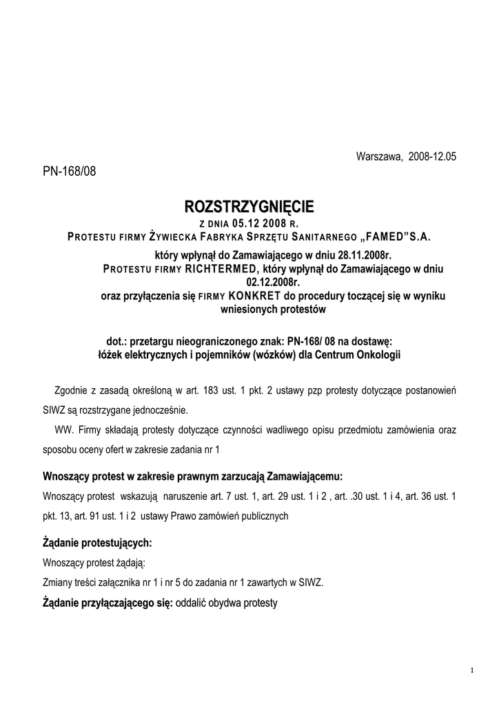 Warszawa, 2008-12.05 PN-168/08 ROZSTRZYGNIĘCIE Z DNIA 05.12 2008 R . P ROTESTU FIRMY Ż YWIECKA F ABRYKA S PRZĘTU S ANITARNEGO „FAMED”S.A. który wpłynął do Zamawiającego w dniu 28.11.2008r. P ROTESTU FIRMY RICHTERMED, który wpłynął do Zamawiającego w dniu 02.12.2008r. oraz przyłączenia się FIRMY KONKRET do procedury toczącej się w wyniku wniesionych protestów dot.: przetargu nieograniczonego znak: PN-168/ 08 na dostawę: łóżek elektrycznych i pojemników (wózków) dla Centrum Onkologii Zgodnie z zasadą określoną w art. 183 ust. 1 pkt. 2 ustawy pzp protesty dotyczące postanowień SIWZ są rozstrzygane jednocześnie. WW. Firmy składają protesty dotyczące czynności wadliwego opisu przedmiotu zamówienia oraz sposobu oceny ofert w zakresie zadania nr 1 Wnoszący protest w zakresie prawnym zarzucają Zamawiającemu: Wnoszący protest wskazują naruszenie art. 7 ust. 1, art. 29 ust. 1 i 2 , art. .30 ust. 1 i 4, art. 36 ust. 1 pkt. 13, art. 91 ust. 1 i 2 ustawy Prawo zamówień publicznych Żądanie protestujących: Wnoszący protest żądają: Zmiany treści załącznika nr 1 i nr 5 do zadania nr 1 zawartych w SIWZ. Żądanie przyłączającego się: oddalić obydwa protesty 1 Zamawiający postanawia: UWZGLĘDNIĆ OBYDWA PROTESTY I DOKONAĆ WNIOSKOWANYCH ZMIAN W ZAŁĄCZNIKACH NR 1 I 5 DO SIWZ. Uzasadnienie: Zamawiający dokonał wnikliwej analizy zarzutów podniesionych w obydwu protestach przede wszystkim pod względem swoich potrzeb klinicznych oraz zasady dopuszczenia do postępowania jak najszerszej konkurencji, stanowiącej gwarancję wyboru oferty najkorzystniejszej. Z tych względów Zamawiający w trybie art. 38 ust. 4 i 6 ustawy pzp dokonał zmiany treści załącznika nr 1 do SIWZ (parametry wymagane) oraz dokonał uzupełnienia załącznika nr 5 do SIWZ (parametry oceniane). W załączeniu ww. załączniki po dokonanych zmianach. Z poważaniem, Z-ca Dyrektora ds. Ekonomiczno-Finansowych Mgr Krzysztof Skiba 2 Załącznik nr 1 do SIWZ PN- 168 /08 Pakiet nr 1 – łóżka w pełni elektryczne -12 szt Model.................................. Producent.......................... Rok produkcji.................... ZESTAWIENIE WYMAGANYCH PARAMETRÓW TECHNICZNYCH LP Parametry Wymagane Warunek 1 Łóżko Podać /model typ^ 1.1 Producent Podać 1.2 Kraj pochodzenia Podać 1.3 Rok produkcji 2008 Tak 1.4 xxxxxxxx xxxxxxx 1.5 wbudowany akumulator do zasilania podczas transportu Tak 1.6 długość zewnętrzna - 2100mm +/-200mm z możliwością przedłużania leża Podać 1.7 szerokość zewnętrzna - maksymalnie 1000mm +/-50rnm Podać 1.8 Leże łóżka 4 - sekcyjne oparte na nowoczesnej konstrukcji kolumnowej łóżka gwarantującej wysoką stabilność oraz łatwiejszą dezynfekcję w porównaniu z rozwiązaniem pentagramowym lub korbowym Tak 1.9 chromowane, składane barierki boczne Tak 1.10 Szczyty łóżka wyjmowane od strony nóg i głowy Tak 1.11 sterowanie elektryczne przy pomocy : - pilota przewodowego - panelu sterowniczego (nie montowanego u szczytu głowy) Tak 1.12 regulacja elektryczna wysokości leża, w zakresie 370 mm do 800 mm +/- 80 mm gwarantująca komfortowe opuszczanie łóżka przez pacjenta /chroniące przed upadkiem i dyskomfortem psychicznym przy „zeskakiwaniu" z leża - niedotykaniem stopami podłogi / Podać Opisać wykreślono 1.13 regulacja elektryczna części plecowej w zakresie 70° +/- 5° Podać 1.14 regulacja elektryczna części nożnej w zakresie 45° +/- 10° Podać 1.15 regulacja elektryczna funkcji autokontur, sterowanie przy pomocy pilota przewodowego lub panelu sterowniczego Tak 1.16 regulacja elektryczna funkcji autoregresji, sterowanie przy pomocy pilota przewodowego lub panelu sterowniczego Tak 1.17 regulacja elektryczna pozycji Trendelenburga 20" +/- 5° - sterowanie z panelu sterowniczego lub pilota przewodowego Podać 1.18 regulacja elektryczna pozycji antyTrendelenburga 20° +/- 5° - sterowanie z panelu sterowniczego lub pilota przewodowego Podać 1.19 regulacja elektryczna do pozycji krzesła kardiologicznego - sterowanie przy pomocy jednego oznaczonego odpowiednim piktogramem przycisku na panelu sterowniczym lub pilota przewodowego Tak 1.20 elektryczna funkcja CPR z każdej pozycji do reanimacji - sterowanie przy pomocy jednego przycisku oznaczonego odpowiednim piktogramem na panelu sterowniczym montowanym na szczycie łóżka od strony nóg Tak 1.21 Elektryczna lub mechaniczna , natychmiastowa pozycja antyszokowa - sterowanie przy pomocy jednego przycisku oznaczonego odpowiednim piktogramem na panelu sterowniczym lub pilota przewodowego Tak 1.22 elektryczna, natychmiastowa pozycja egzaminacyjna - sterowanie przy pomocy jednego przycisku oznaczonego odpowiednim piktogramem na panelu sterowniczym lub pilota przewodowego Tak 1.23 wyłączniki funkcji elektrycznych (na panelu sterowniczym) dla poszczególnych regulacji: - regulacji wysokości - regulacji części plecowej - regulacji części nożnej - regulacji pozycji Trendelenburga i antyTrendelenburga Tak 1.24 Zabezpieczenie przed nieświadomym uruchomieniem funkcji poprzez konieczność wciśnięcia przyciska uruchamiającego dostępność funkcji Tak 1.25 xxxxxxxxxxxxxxx xxxxxxxx 1.26 Przycisk natychmiastowego odłączenie wszystkich funkcji elektrycznych w przypadku wystąpienia zagrożenia dla pacjenta lub personelu również odcinający funkcje w przypadku braku podłączenia do sieci - pracy na akumulatorze Elektryczna i mechaniczna funkcja CPR Tak koła jezdne z systemem sterowania Jazdy na wprost i boki z centralnym systemem hamulcowym Tak 1.27 Tak 1.28 1.29 koła jezdne o średnicy 150mm gwarantujące doskonałą mobilność łóżka Tak 1.30 możliwość obciążenia łóżka do 230kg Tak 1.31 4 kółka odbojowe Tak 1.32 wyposażenie: - Barierki boczne jednoczęściowe 2szt - materac o grubości ok. 120mm wykonany z piany poliuretanowej z pokryciem odpinanym na zamek błyskawiczny, nie przepuszczającym płynów infuzyjnych a przepuszczającym powietr