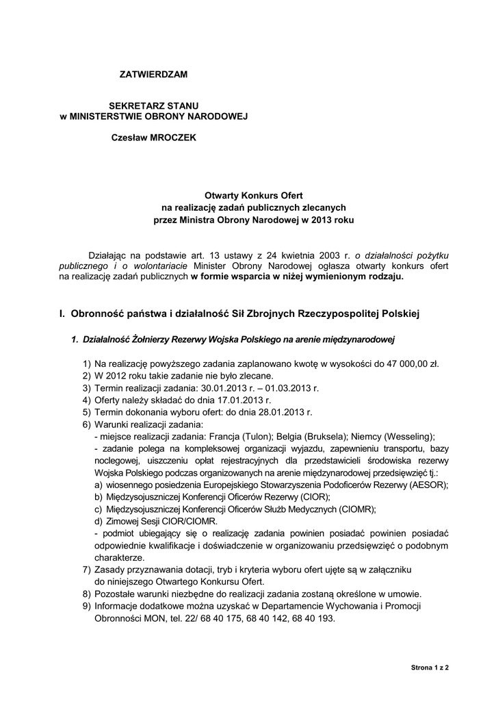 ZATWIERDZAM SEKRETARZ STANU w MINISTERSTWIE OBRONY NARODOWEJ Czesław MROCZEK Otwarty Konkurs Ofert na realizację zadań publicznych zlecanych przez Ministra Obrony Narodowej w 2013 roku Działając na podstawie art. 13 ustawy z 24 kwietnia 2003 r. o działalności pożytku publicznego i o wolontariacie Minister Obrony Narodowej ogłasza otwarty konkurs ofert na realizację zadań publicznych w formie wsparcia w niżej wymienionym rodzaju. I. Obronność państwa i działalność Sił Zbrojnych Rzeczypospolitej Polskiej 1. Działalność Żołnierzy Rezerwy Wojska Polskiego na arenie międzynarodowej Na realizację powyższego zadania zaplanowano kwotę w wysokości do 47 000,00 zł. W 2012 roku takie zadanie nie było zlecane. Termin realizacji zadania: 30.01.2013 r. – 01.03.2013 r. Oferty należy składać do dnia 17.01.2013 r. Termin dokonania wyboru ofert: do dnia 28.01.2013 r. Warunki realizacji zadania: - miejsce realizacji zadania: Francja (Tulon); Belgia (Bruksela); Niemcy (Wesseling); - zadanie polega na kompleksowej organizacji wyjazdu, zapewnieniu transportu, bazy noclegowej, uiszczeniu opłat rejestracyjnych dla przedstawicieli środowiska rezerwy Wojska Polskiego podczas organizowanych na arenie międzynarodowej przedsięwzięć tj.: a) wiosennego posiedzenia Europejskiego Stowarzyszenia Podoficerów Rezerwy (AESOR); b) Międzysojuszniczej Konferencji Oficerów Rezerwy (CIOR); c) Międzysojuszniczej Konferencji Oficerów Służb Medycznych (CIOMR); d) Zimowej Sesji CIOR/CIOMR. - podmiot ubiegający się o realizację zadania powinien posiadać powinien posiadać odpowiednie kwalifikacje i doświadczenie w organizowaniu przedsięwzięć o podobnym charakterze. 7) Zasady przyznawania dotacji, tryb i kryteria wyboru ofert ujęte są w załączniku do niniejszego Otwartego Konkursu Ofert. 8) Pozostałe warunki niezbędne do realizacji zadania zostaną określone w umowie. 9) Informacje dodatkowe można uzyskać w Departamencie Wychowania i Promocji Obronności MON, tel. 22/ 68 40 175, 68 40 142, 68 40 193. 1) 2) 3) 4) 5) 6) Strona 1 z 2 II. Warunki składania ofert: 1. 2. 3. 4. 5. 6. 7. Oferty należy składać wyłącznie na obowiązujących drukach, które stanowią załącznik do rozporządzenia Ministra Pracy i Polityki Społecznej z dnia 15 grudnia 2010 roku w sprawie wzoru oferty i ramowego wzoru umowy dotyczących realizacji zadania publicznego oraz wzoru sprawozdania z wykonania tego zadania (Dz. U. Nr 6, poz. 25). Wzór oferty jest dostępny także na stronie internetowej www.wojsko-polskie.pl (patrz współpraca wojska ze społeczeństwem). Do dnia 18.01.2013 r. zostanie umieszczony w Biuletynie Informacji Publicznej MON oraz na stronie internetowej www.wojsko-polskie.pl wykaz ofert niespełniających warunków formalnych. Oferty należy przesyłać na adres: Dyrektor Departamentu Wychowania i Promocji Obronności MON, al. Niepodległości 218, 00-911 Warszawa. Rozpatrywane będą oferty, które wpłyną do kancelarii ogólnej DWiPO w terminie do 17.01.2013 r. (włącznie). Za datę złożenia oferty uważa się datę zarejestrowania jej w kancelarii. Złożenie oferty nie jest równoznaczne z zapewnieniem przyznania dotacji lub przyznaniem dotacji w oczekiwanej wysokości. Tryb i kryteria stosowane przy dokonywaniu oceny ofert objętych konkursem określone są w Zasadach przyznawania i rozliczania przez Ministra Obrony Narodowej dotacji na realizację zadań publicznych w zakresie obronności organizacjom pozarządowym 2013, które stanowią integralną część ogłoszenia zamieszczonego w Biuletynie Informacji Publicznej MON oraz na stronie internetowej www.wojsko-polskie.pl. Oferty zostaną ocenione pod względem formalnym przez Departament Wychowania i Promocji Obronności MON, natomiast pod względem merytorycznym przez Komisję ds. Zlecania Zadań w Zakresie Obronności. Posiedzenia Komisji odbywać się będą w siedzibie Departamentu Wychowania i Promocji Obronności do dnia 28.01.2013 r. Wyniki otwartego konkursu ofert zostaną zamieszczone w Biuletynie Informacji Publicznej MON oraz na stronie internetowej www.wojsko-polskie.pl, po 29.01.2013 r. III. Termin i warunki szczegółowe realizacji zadań. 1. 2. Termin oraz szczegółowe warunki realizacji, finansowania i rozliczenia zadania regulować będzie umowa o wsparcie lub o powierzenie realizacji zadania publicznego. Dodatkowe informacje można uzyskać w Departamencie Wychowania i Promocji Obronności MON pod nr telefonu: 22/ 68 40 175, 68 40 142, 68 40 193, od poniedziałku do piątku w godz.: 10:00-14:00. DYREKTOR DEPARTAMENTU WYCHOWANIA i PROMOCJI OBRONNOŚCI wz. płk Jerzy NĘDZI Strona 2 z 2