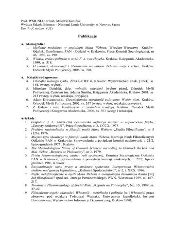 Prof. WSB-NLU dr hab. Miłowit Kuniński Wyższa Szkoła Biznesu – National Louis University w Nowym Sączu Em. Prof. nadzw. (UJ) Publikacje A. Monografie: 1. Myślenie modelowe w socjologii Maxa Webera, Wrocław-Warszawa -KrakówGdańsk: Ossolineum, PAN - Oddział w Krakowie, Prace Komisji Socjologicznej, nr 46, 1980, ss. 190. 2. Wiedza, etyka i polityka w myśli F. A. von Hayeka, Kraków: Księgarnia Akademicka, 1999, ss. 318. 3. O cnotach, demokracji i liberalizmie rozumnym. Zebrane eseje i szkice, Kraków: Ośrodek Myśli Politycznej, 2006, ss. 398. A. Książki redagowane: 4. Filozofia wolnego rynku, ZNAK-IDEE 6, Kraków: Wydawnictwo Znak, [1994], ss. 164, (wstęp, wybór). 5. Mirosław Dzielski, Bóg, wolność, własność [wybór pism], Ośrodek Myśli Politycznej, Centrum im. Adama Smitha, Księgarnia Akademicka, Kraków 2001, ss. 213 (wstęp, wybór, redakcja, przypisy). 6. Adam Krzyżanowski, Chrześcijańska moralność polityczna. Wybór pism, Kraków: Ośrodek Myśli Politycznej, 2002, ss. 357 (wstęp, wybór, redakcja, przypisy). 7. Z. Balazs i inni, Totalitaryzm a zachodnia tradycja, Kraków: Ośrodek Myśli Politycznej i Księgarnia Akademicka, 2006, ss. 303 (wstęp i redakcja). Artykuły: 1. (wspólnie z Z. Guzikiem) Leninowska definicja materii a współczesna fizyka, „Zeszyty naukowe UJ”, Prace filozoficzne, z. 3, CCCX, 1973. 2. Problem racjonalności w filozofii nauki Maxa Webera, „Studia Filozoficzne”, nr 5 (126), 1976. 3. Miejsce typu idealnego w filozofii nauki Maxa Webera, Komisja Nauk Filozoficznych Oddziału PAN w Krakowie, Sprawozdania z posiedzeń komisji naukowych, t. 21/2, lipiec-grudzień 1977 , Kraków. 4. The Methodological Status of Cultural Sciences according to Heinrich Rickert and Max Weber, „Reports on Philosophy”, nr 3, 1979. 5. Próba fenomenologicznej analizy roli społecznej, Komisja Socjologiczna Oddziału PAN w Krakowie, Sprawozdania z posiedzeń komisji naukowych, t. 27/2, lipiecgrudzień 1983, Kraków. 6. Racjonalizacja etosu pracy a struktura społeczna. Interpretacja Weberowskich studiów nad genezą kapitalizmu, „Kultura i Społeczeństwo”, nr 2, t. XXX, 1986. 7. Wątki metafilozoficzne w myśli Maxa Webera a metafilozofia Immanuela Kanta [w:] Jak filozofować? (pod red. Jerzego Perzanowskiego), PWN, Warszawa 1989, ss. 187217. 8. Towards a Phenomenology of Social Role, „Reports on Philosophy”, No. 13, 1989, ss. 37-49. 9. Filozoficzny aspekt własności. Własność - metafizyka i polityka [w:] Własność, praca zbiorowa pod redakcją Tadeusza) Wawaka, Uniwersytet Jagielloński, Instytut Ekonomiczny, Wydawnictwo Informacji Ekonomicznej, Kraków 1990. 10. Rozwój intelektu i moralności we wspólnocie akademickiej, [w:] Etyka zawodowa ludzi nauki (praca zbiorowa pod redakcją J. Goćkowskiego i K. Pigonia), WrocławWarszawa-Kraków, Zakład Narodowy im. Ossolińskich, Wydawnictwo Polskiej Akademii Nauk, 1991, ss. 7-14. 11. Rozumienie a wyjaśnianie typu niewidzialna ręka w teorii ładu spontanicznego Friedricha A. von Hayeka, „Prakseologia”, nr 1-2 (110-111) 1991. 12. Filozofia kultury czy filozofia nauk o kulturze? [w:] Etnografia wśród nauk humanistycznych, pod red. Cz. Robotyckiego, „Prace Etnograficzne”, z. 28, „Zeszyty Naukowe Uniwersytetu Jagiellońskiego”, MXVI, nakładem Uniwersytetu Jagiellońskiego, Kraków 1991. 13. Morals in Post-Communist Societies. The Case of Poland [w:] Morality and Religion in Liberal Democratic Societies, ed. by Gordon L. Anderson and Morton Kaplan, PWPA, Paragon House, New York 1992, ss. 303-327. 14. Hayek's Theory of Spontaneous Order. Between 'Verstehen' and 'Invisible Hand Explanation' [w:] Praxiologies and the Philosophy of Economics. The International Annual of Practical Philosophy and Methodology, ed. by Josiah Lee Auspitz, W. W. Gasparski, M. K. Mlicki and K. Szaniawski, Transaction Publishers, New Brunswick and London, vol. 1, 1992, ss. 347-367. 15. Historiozofia żywiołowa a upadek komunizmu [w:] J. Baszkiewicz i inni Czy historia może się cofnąć? pod red. B. Łagowskiego, Wydawnictwo i drukarnia „Secesja”, Kraków 1993 ss. 9-25. 16. Hasło „F. A. von Hayek (1899-1992), The Constitution of Liberty” [w:] Przewodnik po literaturze filozoficznej XX wieku, pod red. B. Skargi przy współpracy S. Borzyma i H. Floryńskiej-Lalewicz, Wydawnictwo Naukowe PWN, Warszawa 1994, ss. 151158. 17. Z chaosu ład. O samorzutnym powstawaniu porządku społecznego - wstęp do wyboru artykułów Filozofia wolnego rynku, ZNAK-IDEE 6, Kraków [1994], wyboru dokonał i tłumaczenie przejrzał M. Kuniński, ss. 3-18. 18. Etyczne podstawy kompromisu politycznego. O liberalizmie chrześcijańskim Mirosława Dzielskiego, [w:] Kołakowski i inni, praca zbiorowa pod redakcją Jana Skoczyńskiego, Księgarnia Akademicka, Kraków 1995, ss. 107-116. 18a. Etyczne i religijne podstawy liberalizmu Mirosława Dzielskiego, wstęp do: M. Dzielski, Odrodzenie ducha - budowa wolności. Pisma zebrane, KTP - ZNAK, Kraków 1995, ss. 15-27 (rozszerzona i zmieniona wersja 18). 19. Głos w debacie Etyka w polityce, temat „Systemy wartości a praktyka polityczna” [w:] Etyka w polityce, TAiWPN Universitas, Kraków 1997, ss. 48-51. 20. Ewolucjonistyczna koncepcja cywilizacji w ujęciu F.A. von Hayeka, [w:] Rozważania o tradycji i ethosie, red. J. Baradziej i J. Goćkowski, Wydawnictwo Baran i Suszczyński, Kraków 1998, ss. 116-131 21. Liberalism in Poland: What is Left?, [w:] Studies in East European Thought, 49, 1997, Kluwer Academic Publishers, ss. 241-257. 22. Dwa pojęcia własności, [w:] Prawo własności w konstytucji, Zeszyty Fundacji „Międzynarodowe Centrum Rozwoju Demokracji”, Zeszyt 18, Ośrodek Studiów Społeczno-Ekonomicznych, Kraków, 11 maja 1997, ss. 8-12. 22a. Dwa pojęcia własności, „Ad Meritum”, półrocznik Fundacji Centrum Rozwoju Demokracji, nr 5, r. III, jesień-zima 1997, ss. 130-134. 23. Miejsce przymusu w doktrynie liberalnej [w:] Oblicza liberalizmu, 