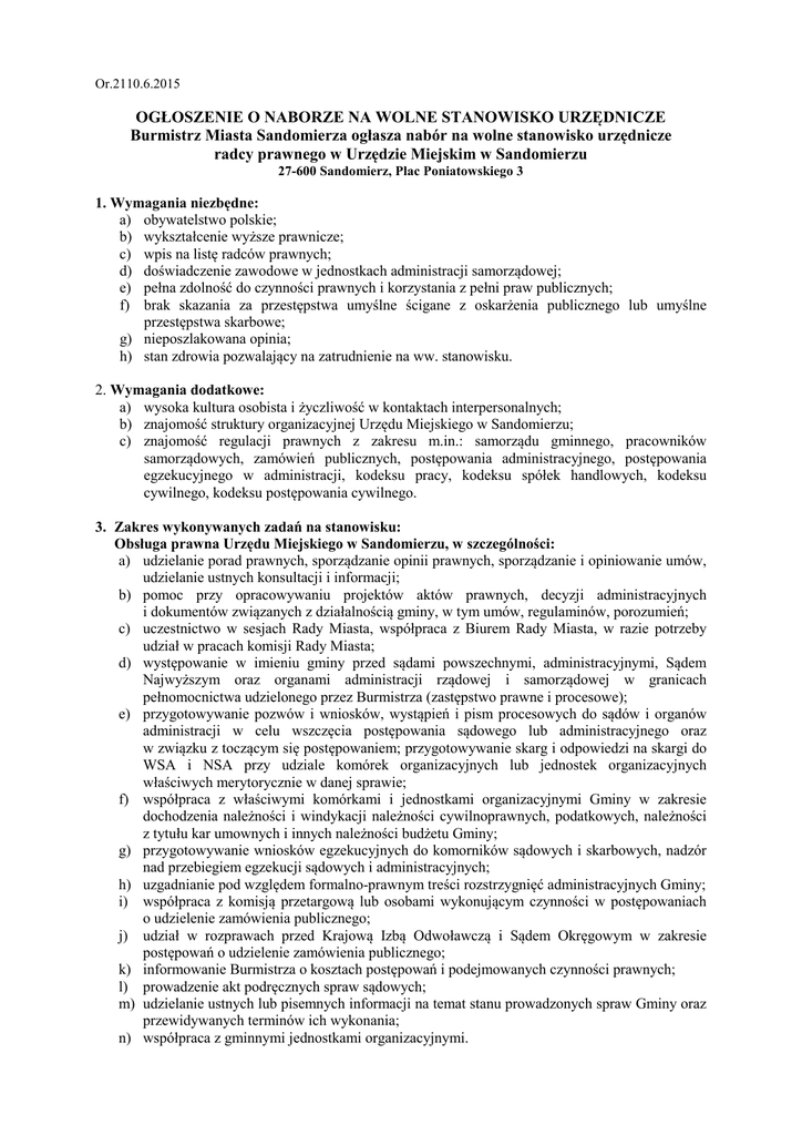 Or.2110.6.2015 OGŁOSZENIE O NABORZE NA WOLNE STANOWISKO URZĘDNICZE Burmistrz Miasta Sandomierza ogłasza nabór na wolne stanowisko urzędnicze radcy prawnego w Urzędzie Miejskim w Sandomierzu 27-600 Sandomierz, Plac Poniatowskiego 3 1. Wymagania niezbędne: a) obywatelstwo polskie; b) wykształcenie wyższe prawnicze; c) wpis na listę radców prawnych; d) doświadczenie zawodowe w jednostkach administracji samorządowej; e) pełna zdolność do czynności prawnych i korzystania z pełni praw publicznych; f) brak skazania za przestępstwa umyślne ścigane z oskarżenia publicznego lub umyślne przestępstwa skarbowe; g) nieposzlakowana opinia; h) stan zdrowia pozwalający na zatrudnienie na ww. stanowisku. 2. Wymagania dodatkowe: a) wysoka kultura osobista i życzliwość w kontaktach interpersonalnych; b) znajomość struktury organizacyjnej Urzędu Miejskiego w Sandomierzu; c) znajomość regulacji prawnych z zakresu m.in.: samorządu gminnego, pracowników samorządowych, zamówień publicznych, postępowania administracyjnego, postępowania egzekucyjnego w administracji, kodeksu pracy, kodeksu spółek handlowych, kodeksu cywilnego, kodeksu postępowania cywilnego. 3. Zakres wykonywanych zadań na stanowisku: Obsługa prawna Urzędu Miejskiego w Sandomierzu, w szczególności: a) udzielanie porad prawnych, sporządzanie opinii prawnych, sporządzanie i opiniowanie umów, udzielanie ustnych konsultacji i informacji; b) pomoc przy opracowywaniu projektów aktów prawnych, decyzji administracyjnych i dokumentów związanych z działalnością gminy, w tym umów, regulaminów, porozumień; c) uczestnictwo w sesjach Rady Miasta, współpraca z Biurem Rady Miasta, w razie potrzeby udział w pracach komisji Rady Miasta; d) występowanie w imieniu gminy przed sądami powszechnymi, administracyjnymi, Sądem Najwyższym oraz organami administracji rządowej i samorządowej w granicach pełnomocnictwa udzielonego przez Burmistrza (zastępstwo prawne i procesowe); e) przygotowywanie pozwów i wniosków, wystąpień i pism procesowych do sądów i organów administracji w celu wszczęcia postępowania sądowego lub administracyjnego oraz w związku z toczącym się postępowaniem; przygotowywanie skarg i odpowiedzi na skargi do WSA i NSA przy udziale komórek organizacyjnych lub jednostek organizacyjnych właściwych merytorycznie w danej sprawie; f) współpraca z właściwymi komórkami i jednostkami organizacyjnymi Gminy w zakresie dochodzenia należności i windykacji należności cywilnoprawnych, podatkowych, należności z tytułu kar umownych i innych należności budżetu Gminy; g) przygotowywanie wniosków egzekucyjnych do komorników sądowych i skarbowych, nadzór nad przebiegiem egzekucji sądowych i administracyjnych; h) uzgadnianie pod względem formalno-prawnym treści rozstrzygnięć administracyjnych Gminy; i) współpraca z komisją przetargową lub osobami wykonującym czynności w postępowaniach o udzielenie zamówienia publicznego; j) udział w rozprawach przed Krajową Izbą Odwoławczą i Sądem Okręgowym w zakresie postępowań o udzielenie zamówienia publicznego; k) informowanie Burmistrza o kosztach postępowań i podejmowanych czynności prawnych; l) prowadzenie akt podręcznych spraw sądowych; m) udzielanie ustnych lub pisemnych informacji na temat stanu prowadzonych spraw Gminy oraz przewidywanych terminów ich wykonania; n) współpraca z gminnymi jednostkami organizacyjnymi. 4. Warunki zatrudnienia na stanowisku: a) praca będzie się odbywać w Urzędzie Miejskim w Sandomierzu; b) praca będzie miała charakter administracyjno – biurowy (m.in. praca przy monitorze ekranowym powyżej 4 godzin); c) podstawa nawiązania stosunku pracy – umowa o pracę; d) wymiar czasu pracy – 1/1 etatu, 8 godzin dziennie i 40 godz. tygodniowo; e) praca w siedzibie jednostki w dniach i godzinach: od poniedziałku do piątku w godz. 8.00 – 15.00. 5. W miesiącu poprzedzającym upublicznienie ogłoszenia wskaźnik zatrudnienia osób niepełnosprawnych w Urzędzie, w rozumieniu przepisów ustawy o rehabilitacji zawodowej i społecznej oraz zatrudnianiu osób niepełnosprawnych, wyniósł powyżej 6%. 6. Wymagane dokumenty: a) list motywacyjny; b) życiorys zawodowy (CV) – z opisem przebiegu pracy zawodowej wraz z informacją o zakresie obowiązków związanych z zajmowanymi stanowiskami i pełnionymi funkcjami; List motywacyjny i życiorys zawodowy CV powinny być opatrzone własnoręcznie podpisaną klauzulą: „Wyrażam zgodę na przetwarzanie moich danych osobowych na potrzeby niniejszego postępowania konkursowego zgodnie z ustawą z dnia 29 sierpnia 1997 roku o ochronie danych osobowych (tekst jedn.: Dz.U. z 2014 r. poz. 1182 z późn. zm.) oraz ustawą z dnia 21 listopada 2008 roku o pracownikach samorządowych (tekst jedn.: Dz.U. z 2014 r. poz. 1202)”; c) kwestionariusz osobowy kandydata (można pobrać ze strony http://bip.um.sandomierz.pl); d) kopie dokumentów potwierdzających posiadane wykształcenie, kwalifikacje i staż pracy; e) kserokopie zaświadczeń o ukończonych kursach, szkoleniach, osiągnięciach zawodowych; f) aktualne zaświadczenia lekarskie o braku przeciwwskazań zdrowotnych do wykonywania pracy na stanowisku radcy prawnego; g) oświadczenie o posiadaniu pełnej zdolności do czynności prawnych i korzystaniu w pełni z praw publicznych; h) oświadczenie kandydata, że nie był karany za przestępstwo lub przestępstwo skarbowe i nie jest prowadzone przeciwko niemu postępowanie o przestępstwo ścigane z oskarżenia publicznego lub przestępstwo skarbowe; i) oświadczenie kandydata od kiedy może podjąć zatrudnienie. Kandydat wyłoniony w drodze naboru, przed zawarciem umowy o pracę zobowiązany będzie przedłożyć zaświadczenie o niekaralności uzyskane z KRK na własny koszt. Wszystkie oświadczenia, list motywacyjny, CV, kwestionariusz osoby powinny być własnoręcznie podpisane, pod rygorem nieuzyskania pozytywnej oceny formal