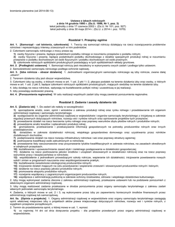 brzmienie pierwotne (od 2014-08-13) Ustawa o izbach rolniczych z dnia 14 grudnia 1995 r. (Dz.U. 1996, Nr 1, poz. 3) tekst jednolity z dnia 17 czerwca 2002 r. (Dz.U. Nr 101, poz. 927) tekst jednolity z dnia 30 maja 2014 r. (Dz.U. z 2014 r. poz. 1079) Rozdział 1. Przepisy ogólne Art. 1. [Samorząd - cel istnienia, członkowie] 1. Tworzy się samorząd rolniczy działający na rzecz rozwiązywania problemów rolnictwa i reprezentujący interesy zrzeszonych w nim podmiotów. 2. Członkami samorządu rolniczego z mocy prawa są: 1) osoby fizyczne i prawne, będące podatnikami podatku rolnego w rozumieniu przepisów o podatku rolnym; 2) osoby fizyczne i prawne, będące podatnikami podatku dochodowego z działów specjalnych produkcji rolnej w rozumieniu przepisów o podatku dochodowym od osób fizycznych i podatku dochodowym od osób prawnych; 3) członkowie rolniczych spółdzielni produkcyjnych posiadający w tych spółdzielniach wkłady gruntowe. Art. 2. [Podległość ustawom] 1. Samorząd rolniczy jest niezależny w wykonywaniu swych zadań i podlega tylko ustawom. 2. Samodzielność samorządu rolniczego podlega ochronie sądowej. Art. 3. [Izba rolnicza - obszar działania] 1. Jednostkami organizacyjnymi samorządu rolniczego są izby rolnicze, zwane dalej „izbami”. 2. Terenem działania izby jest obszar województwa. 3. Członkami izby są osoby, o których mowa w art. 1 ust. 2 pkt 1 i 2, płacące podatek na terenie działania izby oraz osoby, o których mowa w art. 1 ust. 2 pkt 3, będące członkami rolniczych spółdzielni produkcyjnych, mających siedzibę na terenie działania izby. 4. Izby działają na rzecz rolnictwa, wpływają na kształtowanie polityki rolnej i uczestniczą w jej realizacji. 5. Izby posiadają osobowość prawną. Art. 4. [Porozumienia regionalne] W celu realizacji wspólnych zadań izby mogą zawierać porozumienia regionalne. Rozdział 2. Zadania i zasady działania izb Art. 5. [Zadania izb] 1. Do zadań izb należy w szczególności: 1) sporządzanie analiz, ocen, opinii i wniosków z zakresu produkcji rolnej oraz rynku rolnego i przedstawianie ich organom administracji rządowej i samorządu terytorialnego; 2) występowanie do organów administracji rządowej w województwie i organów samorządu terytorialnego z inicjatywą w zakresie regulacji prawnych dotyczących rolnictwa, rozwoju wsi i rynków rolnych oraz opiniowanie projektów tych przepisów; 3) prowadzenie działań na rzecz tworzenia rynku rolnego oraz poprawy warunków zbytu płodów rolnych i produktów rolnych; 4) prowadzenie analiz kosztów i opłacalności produkcji rolnej; 5) gromadzenie, przetwarzanie i przekazywanie informacji gospodarczych na potrzeby producentów rolnych oraz innych przedsiębiorców; 6) doradztwo w zakresie działalności rolniczej, wiejskiego gospodarstwa domowego oraz uzyskiwania przez rolników dodatkowych dochodów; 7) podejmowanie działań na rzecz rozwoju infrastruktury rolnictwa i wsi oraz poprawy struktury agrarnej; 8) podnoszenie kwalifikacji osób zatrudnionych w rolnictwie; 9) prowadzenie listy rzeczoznawców oraz przyznawanie tytułów kwalifikacyjnych w zakresie rolnictwa, na zasadach określonych w odrębnych przepisach; 10) kształtowanie i upowszechnianie zasad etyki i rzetelnego postępowania w działalności gospodarczej; 11) działanie na rzecz podnoszenia jakości środków i urządzeń stosowanych w działalności rolniczej oraz na rzecz poprawy warunków pracy i bezpieczeństwa w rolnictwie; 12) współdziałanie z jednostkami prowadzącymi szkoły rolnicze, wspieranie ich działalności, inicjowanie powstawania nowych szkół i zmian w programach nauczania oraz współorganizowanie praktyk; 13) kształtowanie świadomości ekologicznej producentów rolnych; 14) inicjowanie działań mających na celu powoływanie i wspieranie zrzeszeń i stowarzyszeń producentów rolnych i leśnych; 15) działanie na rzecz poprawy jakości produktów rolnych; 16) promowanie eksportu produktów rolnych; 17) rozwijanie współpracy z zagranicznymi organizacjami producentów rolnych; 18) współpraca z administracją publiczną w zakresie ochrony środowiska, zdrowia i wiejskiego dziedzictwa kulturowego. 2. Izby mogą wykonywać zadania zlecone z zakresu administracji rządowej, przekazane ustawami lub na podstawie porozumień z właściwymi organami administracji rządowej. 3. Izby mogą realizować zadania przekazane w drodze porozumienia przez organy samorządu terytorialnego z zakresu zadań własnych jednostek samorządu terytorialnego. 4. Zadania, o których mowa w ust. 2 i 3, są wykonywane przez izby po zapewnieniu koniecznych środków finansowych przez administrację rządową lub samorządową. Art. 5a. [Opinia o projekcie] 1. Organy administracji rządowej w województwie oraz organy samorządu terytorialnego zasięgają opinii właściwej miejscowo izby o projektach aktów prawa miejscowego dotyczących rolnictwa, rozwoju wsi i rynków rolnych, z wyjątkiem przepisów porządkowych. 2. Termin do przedstawienia opinii, o której mowa w ust. 1, wynosi: 1) co najmniej 14 dni od dnia doręczenia projektu - dla projektów przesłanych przez organy administracji rządowej w województwie; 2) 14 dni od dnia doręczenia projektu - dla projektów przesłanych przez organy samorządu terytorialnego. 3. Nieprzedstawienie przez izbę stanowiska w wyznaczonym terminie uważa się za akceptację przedłożonego projektu. Art. 6. [Tryb postępowania administracyjnego] 1. Sprawy indywidualne z zakresu administracji rządowej oraz wynikające z zakresu zadań własnych jednostek samorządu terytorialnego załatwiane są przez izbę w trybie postępowania administracyjnego. 2. Decyzje administracyjne w sprawach z zakresu, o którym mowa w ust. 1, wydaje prezes izby. 3. Prezes izby może upoważnić w formie pisemnej wiceprezesa izby lub innych członków zarządu, a także przewodniczących rad powiatowych izby, o których mowa w art. 9 ust. 1 pkt 4, do wyd