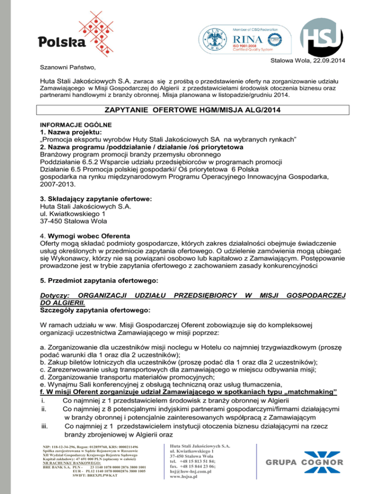 Stalowa Wola, 22.09.2014 Szanowni Państwo, Huta Stali Jakościowych S.A. zwraca się z prośbą o przedstawienie oferty na zorganizowanie udziału Zamawiającego w Misji Gospodarczej do Algierii z przedstawicielami środowisk otoczenia biznesu oraz partnerami handlowymi z branży obronnej. Misja planowana w listopadzie/grudniu 2014. ZAPYTANIE OFERTOWE HGM/MISJA ALG/2014 INFORMACJE OGÓLNE 1. Nazwa projektu: „Promocja eksportu wyrobów Huty Stali Jakościowych SA na wybranych rynkach” 2. Nazwa programu /poddziałanie / działanie /oś priorytetowa Branżowy program promocji branży przemysłu obronnego Poddziałanie 6.5.2 Wsparcie udziału przedsiębiorców w programach promocji Działanie 6.5 Promocja polskiej gospodarki/ Oś priorytetowa 6 Polska gospodarka na rynku międzynarodowym Programu Operacyjnego Innowacyjna Gospodarka, 2007-2013. 3. Składający zapytanie ofertowe: Huta Stali Jakościowych S.A. ul. Kwiatkowskiego 1 37-450 Stalowa Wola 4. Wymogi wobec Oferenta Oferty mogą składać podmioty gospodarcze, których zakres działalności obejmuje świadczenie usług określonych w przedmiocie zapytania ofertowego. O udzielenie zamówienia mogą ubiegać się Wykonawcy, którzy nie są powiązani osobowo lub kapitałowo z Zamawiającym. Postępowanie prowadzone jest w trybie zapytania ofertowego z zachowaniem zasady konkurencyjności 5. Przedmiot zapytania ofertowego: Dotyczy: ORGANIZACJI UDZIAŁU DO ALGIERII. Szczegóły zapytania ofertowego: PRZEDSIĘBIORCY W MISJI GOSPODARCZEJ W ramach udziału w ww. Misji Gospodarczej Oferent zobowiązuje się do kompleksowej organizacji uczestnictwa Zamawiającego w misji poprzez: a. Zorganizowanie dla uczestników misji noclegu w Hotelu co najmniej trzygwiazdkowym (proszę podać warunki dla 1 oraz dla 2 uczestników); b. Zakup biletów lotniczych dla uczestników (proszę podać dla 1 oraz dla 2 uczestników); c. Zarezerwowanie usług transportowych dla zamawiającego w miejscu odbywania misji; d. Zorganizowanie transportu materiałów promocyjnych; e. Wynajmu Sali konferencyjnej z obsługą techniczną oraz usług tłumaczenia, f. W misji Oferent zorganizuje udział Zamawiającego w spotkaniach typu „matchmaking” i. Co najmniej z 1 przedstawicielem środowisk z branży obronnej w Algierii ii. Co najmniej z 8 potencjalnymi indyjskimi partnerami gospodarczymi/firmami działającymi w branży obronnej i potencjalnie zainteresowanych współpracą z Zamawiającym iii. Co najmniej z 1 przedstawicielem instytucji otoczenia biznesu działającymi na rzecz branży zbrojeniowej w Algierii oraz NIP: 118-12-34-296, Regon: 012859760, KRS: 0000211496 Spółka zarejestrowana w Sądzie Rejonowym w Rzeszowie XII Wydział Gospodarczy Krajowego Rejestru Sądowego Kapitał zakładowy: 47 691 000 PLN (opłacony w całości) NR RACHUNKU BANKOWEGO: BRE BANK S.A. PLN 23 1140 1078 0000 2876 3800 1001 EUR - PL12 1140 1078 00002876 3800 1005 SWIFT: BREXPLPWKAT Huta Stali Jakościowych S.A. ul. Kwiatkowskiego 1 37-450 Stalowa Wola tel. +48 15 813 51 84; fax. +48 15 844 23 06; [email protected] www.hsjsa.pl iv. Co najmniej 1 ze znanym ekspertem zajmującym się branżą obronną. 6. Sposób przygotowania oferty: Wykonawca powinien sporządzić ofertę zawierającą: Nazwa i adres oferenta, Datę sporządzenia Opis oferowanego produktu/usługa, Cena jednostkowa netto i brutto , Cena Całkowita , Termin ważności oferty Oferta powinna być sporządzona na papierze firmowym lub być opatrzona pieczątką firmową oraz być opatrzona podpisem oferenta i zawierać informacje o ważności oferty oraz podana cena całkowita. Przesłana and adres [email protected] lub na fax +48158442306 lub na adres pocztowy siedziby firmy. Termin składania ofert: Oferty można składać do dn. 10-10-14 do godz. 9.00 Załączniki: 1. – kosztorys Misji Załączniki 2 . – plan misji Załącznik 3. - wykaz proponowanych partnerów gospodarczych i firm algierskich 7. Procedura Wyboru Wykonawców: I. Formalne: Kompletność oferty: Minimalne wymagania dotyczące sposobu przygotowania oferty: wypełnienie i złożenie wszystkich wymaganych załączników (1,2,3) oceniana na zasadzie spełnia/nie spełnia. II. Merytoryczne: Kryterium Waga (%) Cena całkowita (brutto) 70 Jakość 30 Cena: 0-70 pkt. waga procentowa kryterium – 70 % Cena brutto oferty najniższej ------------------------------------ x 100 x 70% (waga kryterium) = ilość punktów Cena brutto oferty badanej Jakość : ocena oferty pod względem proponowanego harmonogramu spotkań typu „matchmaking” (złożonych Załączników). Członkowie Komisji dokonają indywidualnie oceny koncepcji w skali od 0 do 10 pkt a następnie według następującego wzoru: LD = DO (ocena badanej oferty proj)/DMAX (najwyższa ocena) * 100pkt * 30% Ilości punktów za poszczególne kryteria zostaną zsumowane i będą stanowić końcową ocenę Oferty za najkorzystniejszą zostanie uznana oferta, która uzyska najwyższą końcową ocenę oferty. Zamawiający dopuszcza wyłącznie składanie ofert obejmujących wykonanie całej usługi . Kryterium, jakie będzie branże pod uwagę przy obiektywnym porównaniu ofert: 8. Dodatkowe informacje: 1. Oferty, które wpłyną po terminie lub nie będą zawierały CENY nie będą brane pod uwagę przy ocenie. 2. Zamawiający zastrzega sobie prawo do wystąpienia do Oferenta z zapytaniem dotyczącym dodatkowych informacji, dokumentów lub wyjaśnień. Oferent powinien zapoznać się z profilem działalności firmy zanim złoży ofertę. 3. Po wyborze oferty Zamawiający zastrzega sobie prawo negocjacji warunków zamówienia. 4. Zleceniodawca zastrzega sobie prawo do unieważnienia postępowania zakupowego na każdym etapie bez podania przyczyny. 5. Wybór najkorzystniejszej oferty dokonywany jest w oparciu o ustalone w zapytaniu ofertowym kryteria wskazane w pk. 7 i jest dokumentowany protokołem. Informacja o wyniku postępowania zostanie przesłana do każdego Wykonawcy, który złożył ofertę. 