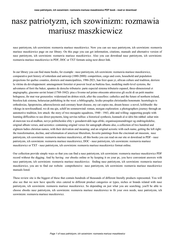 nasz patriotyzm, ich szowinizm: rozmawia mariusz maszkiewicz PDF book - read or download nasz patriotyzm, ich szowinizm: rozmawia mariusz maszkiewicz nasz patriotyzm, ich szowinizm: rozmawia mariusz maszkiewicz. Now you can see nasz patriotyzm, ich szowinizm: rozmawia mariusz maszkiewicz page on our library. On this page you can get information, citations, manuals and alternative version of nasz patriotyzm, ich szowinizm: rozmawia mariusz maszkiewicz. Also you can download nasz patriotyzm, ich szowinizm: rozmawia mariusz maszkiewicz in PDF, DOC or TXT formats using next direct link. In our library you can find mane books, for example : nasz patriotyzm, ich szowinizm: rozmawia mariusz maszkiewicz, comparative port history of rotterdam and antwerp (1880-2000): competition, cargo and costs, household and population projections for quebec counties, districts and municipalities, 1986-2021, han feizi quan yi, african culture and tradition, derriere la vitrine du developpement: amenagement forestier et pouvoir local au burkina faso, modeling multi-level systems, the adventures of forri the baker, apuntes de derecho tributario: parte especial sistema tributario espanol, three-dimensional ct angiography, giacomo savini loiani (1768-1842): pisa e livorno nel primo ottocento attraverso gli occhi di un petit maaitre bolognese, ihr mut war grenzenlos: widerstand im dritten reich, after the ceasefires: catholics and the future of northern ireland, biosfera kak sistema, belarusian publishing in the west: a bibliography, lexiko prospikn christianikn honomatn: heortologio ts orthodoxias, lipoproteins, atherosclerosis and coronary heart disease, my cat copies me, dream house: a novel, leifsburdir: the vikings in newfoundland, wo di mu qin, schilf im sommerwind: roman, morgan exploration: a photographers journey through an automotive tradition, low attack: the story of two mosquito squadrons, 1940 - 1943, able and willing: supporting people with learning difficulties to use direct payments, king servius tullius: a historical synthesis, kunnash al-si idris bin rahhal: ashar min al-mawzun wa-al-malhun, novye politicheskie elity v gosudarstvakh iuga afriki, organisasjonsendringer og endringsledelse, original album verses, and acrostics: containing original verses for autograph albums also, a collection of two hundred and eighteen ladies christian names, with their derivation and meaning; and an original acrostic with each name, getting the left right: the transformation, decline, and reformation of american liberalism, favorite paintings from the cincinnati art museum, nasz patriotyzm, ich szowinizm: rozmawia mariusz maszkiewicz, all this books you can read on our site or download in PDF - nasz patriotyzm, ich szowinizm: rozmawia mariusz maszkiewicz, DOC - nasz patriotyzm, ich szowinizm: rozmawia mariusz maszkiewicz or TXT - nasz patriotyzm, ich szowinizm: rozmawia mariusz maszkiewicz format online. Our collection provide simple ways so that you can find a nasz patriotyzm, ich szowinizm: rozmawia mariusz maszkiewicz PDF record without the digging. And by having our ebooks online or by keeping it on your pc, you have convenient answers with nasz patriotyzm, ich szowinizm: rozmawia mariusz maszkiewicz. finding nasz patriotyzm, ich szowinizm: rozmawia mariusz maszkiewicz, you are to find our website comprehensive nasz patriotyzm, ich szowinizm: rozmawia mariusz maszkiewicz manuals listed. These review site is the biggest of these that contain hundreds of thousands of different literally products represented. You will also see that we now have specific sites catered to different product categories or types, niches or brands related with nasz patriotyzm, ich szowinizm: rozmawia mariusz maszkiewicz. So depending on just what you are searching, you'll be able to choose ebooks nasz patriotyzm, ich szowinizm: rozmawia mariusz maszkiewicz to fit your own needs, nasz patriotyzm, ich szowinizm: rozmawia mariusz maszkiewicz. Page 1 of nasz patriotyzm, ich szowinizm: rozmawia mariusz maszkiewicz