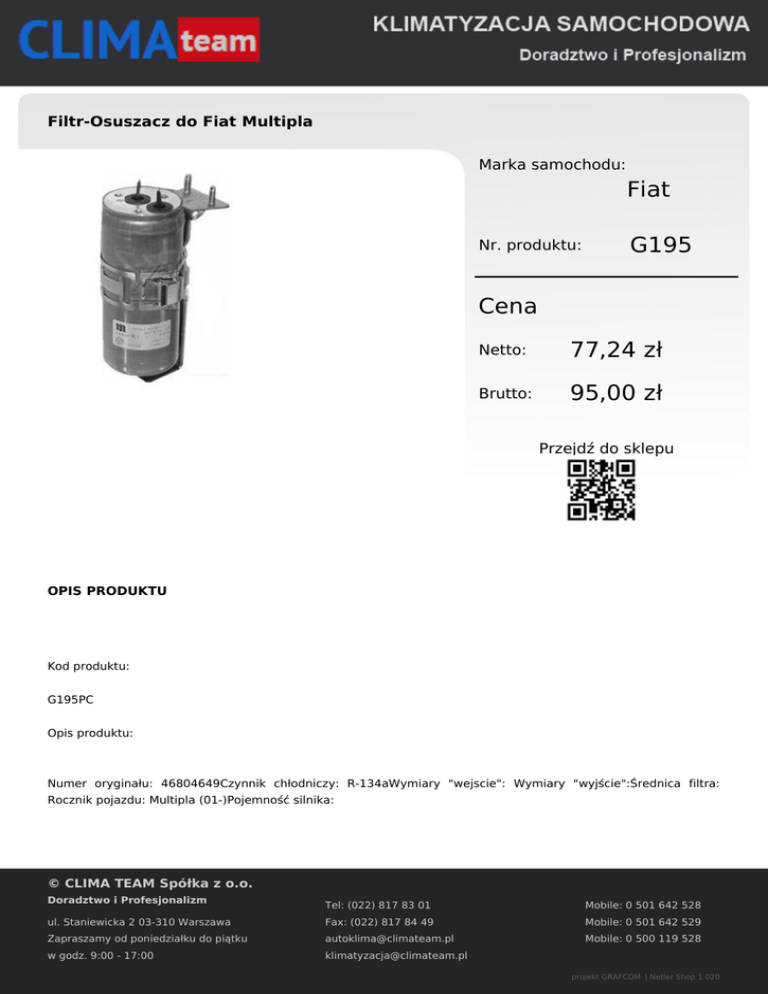 Filtr-Osuszacz do Fiat Multipla Marka samochodu: Fiat Nr. produktu: G195 Cena Netto: 77,24 zł Brutto: 95,00 zł Przejdź do sklepu OPIS PRODUKTU Kod produktu: G195PC Opis produktu: Numer oryginału: 46804649Czynnik chłodniczy: R-134aWymiary "wejscie": Wymiary "wyjście":Średnica filtra: Rocznik pojazdu: Multipla (01-)Pojemność silnika: © CLIMA TEAM Spółka z o.o. Doradztwo i Profesjonalizm Tel: (022) 817 83 01 Mobile: 0 501 642 528 ul. Staniewicka 2 03-310 Warszawa Fax: (022) 817 84 49 Mobile: 0 501 642 529 Zapraszamy od poniedziałku do piątku [email protected] Mobile: 0 500 119 528 w godz. 9:00 - 17:00 [email protected] projekt GRAFCOM | Netler Shop 1.020
