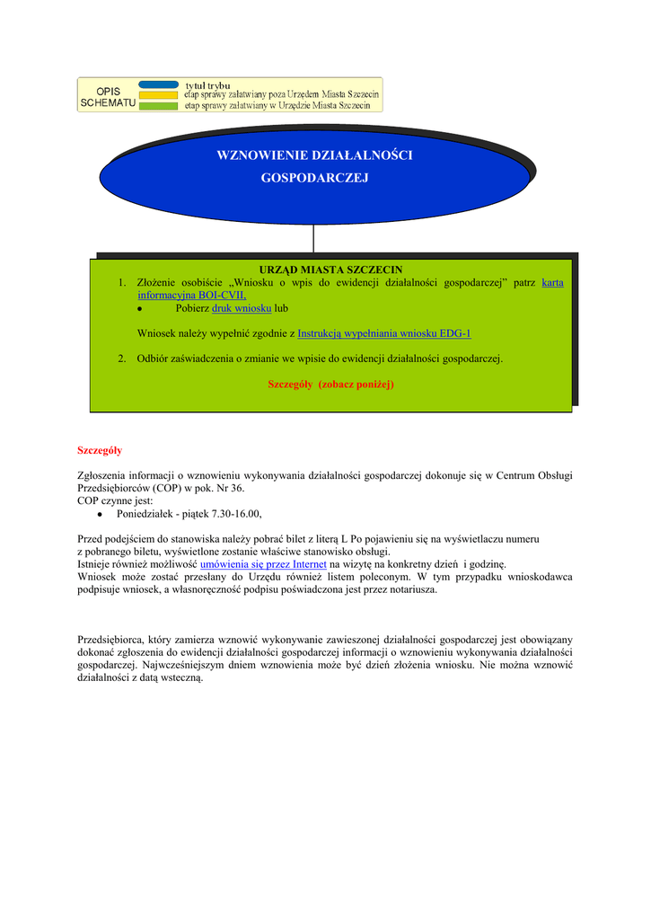 WZNOWIENIE DZIAŁALNOŚCI GOSPODARCZEJ URZĄD MIASTA SZCZECIN 1. Złożenie osobiście „Wniosku o wpis do ewidencji działalności gospodarczej” patrz karta informacyjna BOI-CVII, Pobierz druk wniosku lub Wniosek należy wypełnić zgodnie z Instrukcją wypełniania wniosku EDG-1 2. Odbiór zaświadczenia o zmianie we wpisie do ewidencji działalności gospodarczej. Szczegóły (zobacz poniżej) Szczegóły Zgłoszenia informacji o wznowieniu wykonywania działalności gospodarczej dokonuje się w Centrum Obsługi Przedsiębiorców (COP) w pok. Nr 36. COP czynne jest: Poniedziałek - piątek 7.30-16.00, Przed podejściem do stanowiska należy pobrać bilet z literą L Po pojawieniu się na wyświetlaczu numeru z pobranego biletu, wyświetlone zostanie właściwe stanowisko obsługi. Istnieje również możliwość umówienia się przez Internet na wizytę na konkretny dzień i godzinę. Wniosek może zostać przesłany do Urzędu również listem poleconym. W tym przypadku wnioskodawca podpisuje wniosek, a własnoręczność podpisu poświadczona jest przez notariusza. Przedsiębiorca, który zamierza wznowić wykonywanie zawieszonej działalności gospodarczej jest obowiązany dokonać zgłoszenia do ewidencji działalności gospodarczej informacji o wznowieniu wykonywania działalności gospodarczej. Najwcześniejszym dniem wznowienia może być dzień złożenia wniosku. Nie można wznowić działalności z datą wsteczną.