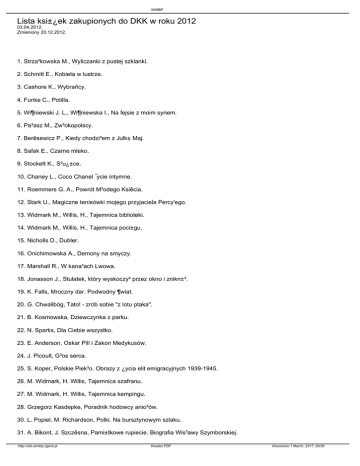 WiMBP Lista ksi±¿ek zakupionych do DKK w roku 2012 03.04.2012. Zmieniony 20.12.2012. 1. Strza³kowska M., Wyliczanki z pustej szklanki. 2. Schmitt E., Kobieta w lustrze. 3. Cashore K., Wybrañcy. 4. Funke C., Potilla. 5. Wi¶niewski J. L., Wi¶niewska I., Na fejsie z moim synem. 6. Pa³asz M., Zw³okopolscy. 7. Berêsewicz P., Kiedy chodzi³em z Julk± Maj. 8. Safak E., Czarne mleko. 9. Stockett K., S³u¿±ce. 10. Chaney L., Coco Chanel ¯ycie intymne. 11. Roemmers G. A., Powrót M³odego Ksiêcia. 12. Stark U., Magiczne tenisówki mojego przyjaciela Percy'ego. 13. Widmark M., Willis, H., Tajemnica biblioteki. 14. Widmark M., Willis, H., Tajemnica poci±gu. 15. Nicholls D., Dubler. 16. Onichimowska A., Demony na smyczy. 17. Marshall R., W kana³ach Lwowa. 18. Jonasson J., Stulatek, który wyskoczy³ przez okno i znikn±³. 19. K. Falls, Mroczny dar. Podwodny ¶wiat. 20. G. Chwalibóg, Tato! - zrób sobie "z lotu ptaka". 21. B. Kosmowska, Dziewczynka z parku. 22. N. Sparks, Dla Ciebie wszystko. 23. E. Anderson, Oskar Pill i Zakon Medykusów. 24. J. Picoult, G³os serca. 25. S. Koper, Polskie Piek³o. Obrazy z ¿ycia elit emigracyjnych 1939-1945. 26. M. Widmark, H. Willis, Tajemnica szafranu. 27. M. Widmark, H. Willis, Tajemnica kempingu. 28. Grzegorz Kasdepke, Poradnik hodowcy anio³ów. 30. L. Popiel, M. Richardson, Polki. Na bursztynowym szlaku. 31. A. Bikont, J. Szczêsna, Pami±tkowe rupiecie. Biografia Wis³awy Szymborskiej. http://old.wimbp.zgora.pl Kreator PDF Utworzono 7 March, 2017, 09:50 WiMBP 32. S. J. Watson, Zanim zasnê. 33. D. Ducret, Kobiety dyktatorów. Prawdziwe historie. 34. S. Mehta, Bombaj. Maximum city. 35. B. Pawlikowska, Teoria bezwzglêdno¶ci, czyli jak unikn±æ koñca ¶wiata. 36. James E. L., Piêædziesi±t twarzy Greya. 37. Kucówna Z., Szara godzina. 38. Jagie³³o J., Kawa z kardamonem. 39. Kret J., Polska wed³ug Kreta. 40. Chbosky S., Charlie. 41. Mones N., Ostatni kucharz chiñski. 42. Vicks B., Opowie¶ci dubajskie. 43. Lokko L., Pamiêtne lato. 44. Ficner-Ogonowska A., Alibi na szczê¶cie. 45. Michalski D., Kalina Jêdrusik. 46. Hofmann C., Afryka, moja mi³o¶æ. 47. Widmark M., Willis, H., Tajemnica mi³o¶ci. 48. Prewêcka K., Stanis³awa Celiñska. Niejedno przesz³am. 49. Stachniak E., Katarzyna Wielka. Gra o w³adzê. 50. Gawryluk B., Baltic. 51. Moriarty R., Pie¶ñ Aboryganki. 52. Badkhen A., Ka³asznikow kebab. 53. Pa³asz M., Sposób na elfa. 54. Hoffman-Jêdruch E. K., ¦lady na piasku. 55. Bieñczyk M., Ksi±¿ka Twarzy. 56. Gawryluk B., Dziewczyna z fotografii. 57. Kasdepke G., W moim brzuch mieszka jakie¶ zwierz±tko. 58. Gawryluk B., Kolczyki Selmy. 59. Widmark M., Willis, H., Tajemnica galopu. 60. Onichimowska A., Dziesiêæ stron ¶wiata. 61. Maciejewski £., Aktorki. 62. Ficner-Ogonowska A., Krok do szczê¶cia. 63. Hollinghurst A., Obce dziecko. 64. Ostrowska B., Jest taka historia. Opowie¶æ o J. Korczaku. http://old.wimbp.zgora.pl Kreator PDF Utworzono 7 March, 2017, 09:50 WiMBP 65. Borêsewicz P., Wszystkie lajki Marczuka. 66. Fr±czek A., Kocham Ciê. 67. Trace M., To, co najbardziej lubiê... W przedszkolu. 68. Trace M., To, co najbardziej lubiê... Przyjaciele. 69. Trace M., To, co najbardziej lubiê - W sobie samym. 70. Trace M., To, co najbardziej lubiê - Gdy idê spaæ. 71. Bourgeois P., Franklin i gwiezdna podró¿. 72. Bourgeois P., Franklin i kó³ko przyrodnicze. 73. Bourgeois P., Franklin i statek kosmiczny. 74. Bourgeois P., Franklin i zaginiony kotek. 75. Bourgeois P., Franklin bawi siê z nami. 76. Bourgeois P., Franklin poznaje ¶wiat. 77. Bourgeois P., Franklin i przyjêcie u cioci. 78. Bourgeois P., Franklin pomaga pokonaæ tremê. 79. Bourgeois P., Franklin chce mieæ przydomek. 80. Bourgeois P., Franklin i ja. 81. Nowak E., Drzazga. 82. Picoult J., Pó³ ¿ycia. 83. James E. L., Ciemniejsza strona Greya. 84. Onichimowska A., Czas meteorów. 85. Foenkinos D., Delikatno¶æ. 86. Fitoussi M., Helena Rubinstein. 87. Wi¶niewski J. L., Wownenko I., Mi³o¶æ oraz inne dysonanse. 88. Sekielski T., Sejf. 89. Patchett A., Stan zdumienia. 90. Tennessee W., Tramwaj zwany po¿±daniem i inne dramaty. 91. Mendoza E., Walka kotów. 92. Tokarczuk B., ¯ywe cienie. 93. Ligocka R., Dobre dziecko. 94. Chyliñska A., Zezia i Giler. 95. Evans R., Papierowe marzenia. 96. Wa³kuski M., Wa³kowanie Ameryki. http://old.wimbp.zgora.pl Kreator PDF Utworzono 7 March, 2017, 09:50 WiMBP 97. Irving J., W jednej osobie. 98. Mitchell D., Atlas chmur. 99. Shafak E., Czterdzie¶ci zasad mi³o¶ci. 100. Federico C. Draga S., W krainie ognistego kwiatu. 101. Janicki K., Pierwsze Damy II Rzeczpospolitej. http://old.wimbp.zgora.pl Kreator PDF Utworzono 7 March, 2017, 09:50