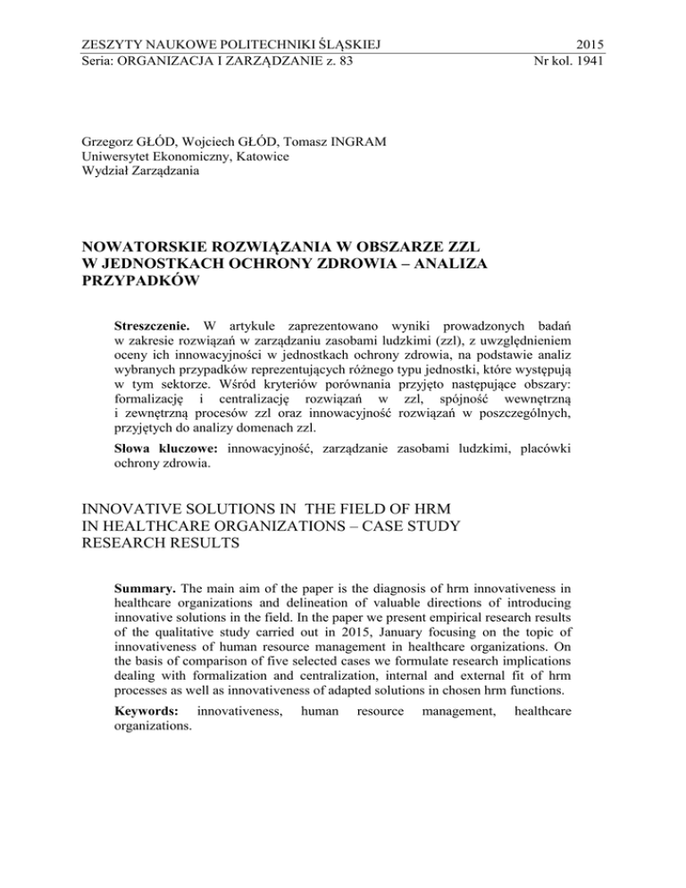 ZESZYTY NAUKOWE POLITECHNIKI ŚLĄSKIEJ Seria: ORGANIZACJA I ZARZĄDZANIE z. 83 2015 Nr kol. 1941 Grzegorz GŁÓD, Wojciech GŁÓD, Tomasz INGRAM Uniwersytet Ekonomiczny, Katowice Wydział Zarządzania NOWATORSKIE ROZWIĄZANIA W OBSZARZE ZZL W JEDNOSTKACH OCHRONY ZDROWIA – ANALIZA PRZYPADKÓW Streszczenie. W artykule zaprezentowano wyniki prowadzonych badań w zakresie rozwiązań w zarządzaniu zasobami ludzkimi (zzl), z uwzględnieniem oceny ich innowacyjności w jednostkach ochrony zdrowia, na podstawie analiz wybranych przypadków reprezentujących różnego typu jednostki, które występują w tym sektorze. Wśród kryteriów porównania przyjęto następujące obszary: formalizację i centralizację rozwiązań w zzl, spójność wewnętrzną i zewnętrzną procesów zzl oraz innowacyjność rozwiązań w poszczególnych, przyjętych do analizy domenach zzl. Słowa kluczowe: innowacyjność, zarządzanie zasobami ludzkimi, placówki ochrony zdrowia. INNOVATIVE SOLUTIONS IN THE FIELD OF HRM IN HEALTHCARE ORGANIZATIONS – CASE STUDY RESEARCH RESULTS Summary. The main aim of the paper is the diagnosis of hrm innovativeness in healthcare organizations and delineation of valuable directions of introducing innovative solutions in the field. In the paper we present empirical research results of the qualitative study carried out in 2015, January focusing on the topic of innovativeness of human resource management in healthcare organizations. On the basis of comparison of five selected cases we formulate research implications dealing with formalization and centralization, internal and external fit of hrm processes as well as innovativeness of adapted solutions in chosen hrm functions. Keywords: innovativeness, organizations. human resource management, healthcare 178 G. Głód, W. Głód, T. Ingram 1. Wprowadzenie Następujące zmiany w sektorze ochrony zdrowia, funkcjonowanie podmiotów w nowych realiach rynkowych wymuszają szukanie nowych sposobów zarządzania organizacjami tego sektora. Takie zmiany mogą przynieść działania o charakterze przedsiębiorczym, ale obecnie bez koniecznych przeobrażeń w obszarze kultury organizacyjnej czy w sferze szeroko pojętego zarządzania zasobami ludzkimi jest to raczej niemożliwe. Jednostki ochrony zdrowia stoją w obliczu głębokich zmian organizacyjnych, a także własnościowych. Niezbędne kierunki zmian, które pozwolą rozwiązać problemy w tym obszarze powinny objąć m.in. wprowadzanie adekwatnie modyfikowanych do specyfiki jednostek ochrony zdrowia instrumentów zarządzania dotąd stosowanych w organizacjach sektora prywatnego. Z punktu widzenia jakości świadczonych usług zmiany te powinny dotyczyć przede wszystkim obszaru zarządzania zasobami ludzkimi (zzl). Zasadniczym celem niniejszego artykułu jest diagnoza innowacyjności w obszarze zarządzania zasobami ludzkimi w wybranych podmiotach ochrony zdrowia oraz nakreślenie potencjalnych kierunków wspomagania organizacji w zakresie wprowadzania innowacyjnych rozwiązań, dotyczących funkcji personalnej. 2. Innowacyjność w zarządzaniu zasobami ludzkimi (z uwzględnieniem specyfiki sektora ochrony zdrowia) Innowacyjność współczesnych organizacji znajduje się w kręgu zainteresowania zarówno praktyków, jak i teoretyków zarządzania. Innowacyjność jest postrzegana jako źródło długoterminowej przewagi konkurencyjnej przedsiębiorstwa oraz poprawy efektywności jego działań [6]. Rosnąca konkurencja pomiędzy podmiotami ochrony zdrowia i stale zmieniające się warunki funkcjonowania tychże podmiotów czynią innowacje podstawowym warunkiem nie tylko wzrostu i sukcesu, ale również (przede wszystkim) jej przetrwania. Ponadto, trzeba podkreślić, że istotą innowacyjności jest w szczególności kreowanie innowacji o charakterze strategicznym – nowych modeli biznesu, co nie znajduje dostatecznego miejsca w najbardziej popularnych dziś podejściach do innowacyjności organizacji [4]. Innowacyjność w zakresie zarządzania zasobami ludzkimi definiować można jako ideę, politykę, program, praktykę lub system odnoszące się do funkcji zarządzania zasobami ludzkimi, pod warunkiem że są one nowe dla adaptującej ją organizacji [9]. Choć samemu zarządzaniu zasobami ludzkimi w jednostkach ochrony zdrowia poświęcono wiele uwagi, to już problematyka rozwoju zarządzania zasobami ludzkimi w jednostkach ochrony zdrowia nie była do tej pory przedmiotem szerszych badań naukowych [1]. Nowatorskie rozwiązania w obszarze ZZL… 179 W praktyce innowacyjność w podejściu do problematyki zarządzania zasobami ludzkimi może oznaczać odejście od koncepcji klasycznych, które koncentrują się na realizacji podstawowych funkcji personalnych przedsiębiorstwa, takich jak: pozyskiwanie, rozwijanie, motywowanie i kontrolowanie ludzi. Nowatorskie spojrzenia na dotychczasową realizację funkcji personalnej prezentują B. Dale i C. Cooper [2]. Autorzy ci wskazują na sześć podstawowych elementów, niezbędnych do uzyskania innowacyjnego podejścia w realizacji funkcji personalnej w organizacji. Są to: – wsparcie ze strony kierownictwa przedsiębiorstw, – kształtowanie kultury organizacyjnej, – planowanie i struktura, – edukacja i szkolenia, – pomiar osiąganych wyników – zaangażowanie uczestników organizacji [2]. Nowe podejście do zarządzania zasobami ludzkimi wymusza na organizacji większe zaangażowanie pracowników. Aby osiągnąć ten cel, firmy muszą realizować nową politykę rozwoju pracowników, kładącą nacisk na większe delegowanie odpowiedzialności oraz większy udział pracowników w podejmowaniu decyzji. Praktyki te powinny objąć również troskę o szkolenie pracowników i nowatorskie spojrzenie na proces rekrutacji. Celem tych praktyk jest osiągnięcie wyższej wartości zasobów ludzkich nie tylko przez wybranie i utrzymanie najbardziej utalentowanych osób, ale także przez większą motywację obecnych pracown