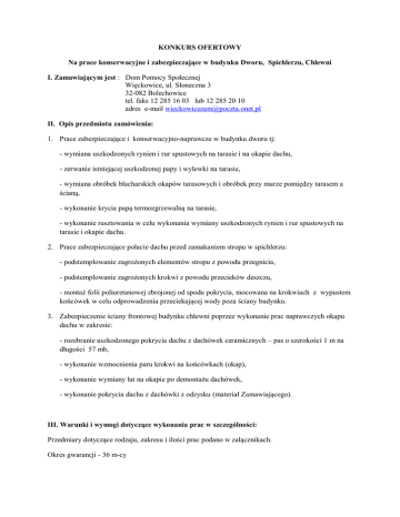 KONKURS OFERTOWY Na prace konserwacyjne i zabezpieczające w budynku Dworu, Spichlerzu, Chlewni I. Zamawiającym jest : Dom Pomocy Społecznej Więckowice, ul. Słoneczna 3 32-082 Bolechowice tel. faks 12 285 16 03 lub 12 285 20 10 adres e-mail [email protected] II. Opis przedmiotu zamówienia: 1. Prace zabezpieczające i konserwacyjno-naprawcze w budynku dworu tj: - wymiana uszkodzonych rynien i rur spustowych na tarasie i na okapie dachu, - zerwanie istniejącej uszkodzonej papy i wylewki na tarasie, - wymiana obróbek blacharskich okapów tarasowych i obróbek przy murze pomiędzy tarasem a ścianą, - wykonanie krycia papą termozgrzewalną na tarasie, - wykonanie rusztowania w celu wykonania wymiany uszkodzonych rynien i rur spustowych na tarasie i okapie dachu. 2. Prace zabezpieczające połacie dachu przed zamakaniem stropu w spichlerzu: - podstemplowanie zagrożonych elementów stropu z powodu przegnicia, - podstemplowanie zagrożonych krokwi z powodu przecieków deszczu, - montaż folii poliuretanowej zbrojonej od spodu pokrycia, mocowana na krokwiach z wypustem końcówek w celu odprowadzenia przeciekającej wody poza ściany budynku. 3. Zabezpieczenie ściany frontowej budynku chlewni poprzez wykonanie prac naprawczych okapu dachu w zakresie: - rozebranie uszkodzonego pokrycia dachu z dachówek ceramicznych – pas o szerokości 1 m na długości 57 mb, - wykonanie wzmocnienia paru krokwi na końcówkach (okap), - wykonanie wymiany łat na okapie po demontażu dachówek, - wykonanie pokrycia dachu z dachówki z odzysku (materiał Zamawiającego). III. Warunki i wymogi dotyczące wykonania prac w szczególności: Przedmiary dotyczące rodzaju, zakresu i ilości prac podano w załącznikach. Okres gwarancji - 36 m-cy 2 IV. Warunki, wymagane od Wykonawcy 1. Prowadzenie działalności gospodarczej obejmującej zakres jw., niezbędne doświadczenie Wykonawcy w prowadzeniu prac tego rodzaju w budynkach zabytkowych. Dysponowanie osobami posiadającymi umiejętność wykonania prac. Dysponowanie osobą która, będzie odpowiedzialna za zachowanie bezpieczeństwa przy wykonywaniu prac. V. Oferta: Ofertę należy sporządzić pisemnie. Winna zawierać wycenę prac każdego z obiektów: 1. Cenę całości, którą należy obliczyć w następujący sposób: wartość netto, podatek VAT 23%, cena brutto. 2. Wykonawca winien wykazać doświadczenie poprzez podanie rodzaju i terminu prac, nazwy i adresu (telefonu) inwestorów, dla których wykonał prace tego rodzaju. Z obowiązku tego zwolnieni są wykonawcy, którzy wykonywali podobne usługi u Zamawiającego. 3. Ofertę należy dostarczyć do DPS do dnia 18.09.2015r. do godz. 11.00 do Działu AdministracyjnoGospodarczego DPS ( w pawilonie D) lub w tym terminie za pośrednictwem poczty, firm kurierskich z dopiskiem: - oferta na prace konserwacyjne i zabezpieczające w budynkach: Dworu, Spichlerza i Chlewni VI. Konkurs zostanie rozstrzygnięty do 7 dni roboczych od dnia złożenia oferty, o czym wykonawcy zostaną poinformowani pocztą mejlową, telefonicznie lub faksem. Z wykonawcą, którego oferta zostanie wybrana zostanie niezwłocznie podpisana umowa zgodna z warunkami niniejszego postępowania. Podpisanie umowy i rozpoczęcie prac przewiduje się niezwłocznie, nie później niż do czternastu dni następujących po dniu powiadomienia Wykonawcy o przyjęciu oferty. Kryteria wyboru oferty : Najniższa cena. Zamawiający weźmie pod uwagę wykazane doświadczenie zwłaszcza przy niewielkich różnicach cenowych. Termin wykonania zamówienia 31.10.2015r.: Warunki płatności: przelew do 21 dni od dnia otrzymania faktury sporządzonej na podstawie protokołu ostatecznego odbioru prac dla poszczególnych zadań określonych w pkt II. VII. Kontakt w sprawie zamówienia, pocztą e-mail lub telefonicznie: Dorota Dąbrowska, nr wewn. 4 w godz. 8.00 – 15.00, poniedziałek - czwartek, wykonawcy proszeni są o dokonanie wizji obiektu. VIII.1. Konkurs niniejszy podlega unieważnieniu w przypadku, jeżeli oferta o najniższej cenie będzie wyższa niż kwota jaką Zamawiający przeznaczył na wykonanie zamówienia. 2. Zamiast unieważnienia konkursu Zamawiający zastrzega sobie prawo zmniejszenia zakresu prac w umowie. 3. Zamawiający zastrzega sobie prawo przedstawienia dodatkowych warunków w przypadku nałożenia takich warunków przez Małopolskiego Konserwatora Zabytków, o czym wykonawcy będą mogli dowiedzieć się z informacji zamieszczanych na stronie internetowej pod niniejszym konkursem. 3 IX. Konkurs niniejszy jest prowadzony na postawie Regulaminu udzielania zamówień publicznych o wartości nie wyższej niż 30 000 euro w DPS w Więckowicach, regulamin dostępny jest na stronie www.dpswieckowice.pl w zakładce zamówienia publiczne. Załączniki: - przedmiary robót 3 szt - projekt umowy Do wglądu na miejscu budynki w dni powszednie 8.00 -15.00. Więckowice, dnia 10.09.2015r. Sporządził: Dyrektor DPS: