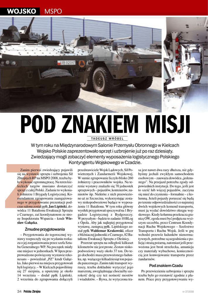 WOJSKO MSPO POD ZNAKIEM MISJI TA D E U S Z W RÓ B E L W tym roku na Międzynarodowym Salonie Przemysłu Obronnego w Kielcach Wojsko Polskie zaprezentowało sprzęt i uzbrojenie już po raz dziesiąty. Zwiedzający mogli zobaczyć elementy wyposażenia logistycznego Polskiego Kontyngentu Wojskowego w Czadzie. Zanim pierwsi zwiedzający pojawili się na wystawie sprzętu i uzbrojenia Sił Zbrojnych RP na MSPO 2008, trzeba było wykonać ogromną pracę. Na teren kieleckich targów musiano dostarczyć sprzęt z całej Polski. Zadanie to wykonali żołnierze 1 Brygady Logistycznej. Komendantem zgrupowania zaangażowanego w przygotowanie prezentacji podczas salonu został ppłk Jan Lipiński, dowódca 11 Batalionu Ewakuacji Sprzętu z Czarnego, zaś koordynatorem ze strony Inspektoratu Wsparcia – kmdr Wiesław Gałązka. Żmudne przygotowania – Przygotowania do tegorocznej wystawy rozpoczęły się po wydaniu rozkazu o jej zorganizowaniu przez szefa Sztabu Generalnego WP. Na początek miały one miejsce w jednostkach. W lipcu przeprowadzono poświęcony wystawie rekonesans – powiedział „PZ” kmdr Gałązka. Jako pierwsi na miejscu przygotowań byli logistycy. – W Kielcach pojawiliśmy się 27 sierpnia, a opuścimy je około 14 września – dodał ppłk Lipiński. 2 września do zgrupowania dołączyli 34 Polska Zbrojna przedstawiciele Wojsk Lądowych, Sił Powietrznych i Żandarmerii Wojskowej. W sumie zgrupowanie liczyło blisko 260 żołnierzy i pracowników wojska. Na terenie wystawy znalazło się 70 jednostek sprzętowych – pojazdów, kontenerów, namiotów itp. Niektóre z nich przewieziono aż ze Szczecina, wykorzystując zestawy niskopodwoziowe będące w wyposażeniu 11 Batalionu. W tym roku główny wysiłek przygotowań spoczywał na 1 Brygadzie Logistycznej z Bydgoszczy. W przyszłym – będzie to zadanie 10 BLog z Opola. Aby jak najlepiej przygotować wystawę, zastępcą ppłk. Lipińskiego został ppłk Waldemar Krakowski, oficer z bliźniaczej jednostki z Czarnego, 82 Batalionu Ewakuacji Sprzętu z Oleśnicy. Przerzut sprzętu na odległość kilkuset kilometrów nie jest proste. Zestaw niskopodwoziowy waży około 37 ton. Do tego dochodzi masa przewożonego ładunku, np. ważącego kilkadziesiąt ton pojazdu pancernego. Zanim taki transport wyruszy, trzeba dokładnie wytyczyć jego marszrutę, uwzględniając chociażby szerokość dróg czy też nośność mostów i wiaduktów. – Bywa, że wytyczona tra- sa jest nawet dwa razy dłuższa, niż gdybyśmy jechali zwykłym samochodem osobowym – zauważa dowódca „jedenastego”. Na przejazd potrzeba zgody odpowiednich instytucji. Do tego, jeśli jest to sześć lub więcej pojazdów, zaczyna się mieć do czynienia – formalnie – z kolumną. Jeżeli pojazdy poruszać się będą po terenie odpowiedzialności co najmniej dwóch wojskowych komend transportu, musi ją wydać dowództwo okręgu wojskowego. Kiedy kolumna przekracza granicę OW, zgoda musi być podjęta na wyższym szczeblu, przez Centrum Koordynacji Ruchu Wojskowego – Szefostwo Transportu i Ruchu Wojsk. Jeśli w grę wchodzi przewóz ładunków nienormatywnych, potrzebne są uzgodnienia z policją i strażą pożarną, natomiast jeśli przewożona jest broń strzelecka, amunicja czy materiały wybuchowe, koniecznością jest konwojowanie transportu przez żandarmów. Pod znakiem Czadu Po przewiezieniu uzbrojenia i sprzętu trzeba było go rozstawić zgodnie z planem. Prace przy przygotowywaniu wynr 37/2008 | | | | | | | | | | | ZAPIS FORUM NA CELOWNIKU WOJSKO KULISY PORADY PO SŁUŻBIE HISTORIA MILITARIA PRASA ŚWIAT TO I OWO FLESZ LESZNO. 1 września świętowali TADEUSZ WRÓBEL (3) przeciwlotnicy 69 Leszczyńskiego Pułku Przeciwlotniczego im. gen. dyw. Stefana Roweckiego „Grota”. W tym dniu odbyły się obchody rocznicy wybuchu II wojny światowej, Święta Wojsk Obrony Przeciwlotniczej oraz podpisano porozumienia pomiędzy resortem obrony narodowej a Stowarzyszeniem Oficerów Rezerwy 69 pplot i Garnizonu Leszno. Główna ceremonia miała miejsce przed pomnikiem Żołnierzy Garnizonu Leszczyńskiego, gdzie odczytano apel Pamięci Oręża Polskiego. Dowódca pułku płk Marek Śmietana uhonorował najaktywniejszych oficerów rezerwy listem gratulacyjnym. stawy trwały często do godziny 21. Głównym jej elementem była prezentacja fragmentu bazy operacyjnej PKW Czad. Można było zobaczyć takie same kontenery mieszkalne i sanitarne jak te, które rozstawiono w Iribie. Była również nowoczesna kuchnia polowa KPŻ-170. Ustawiono wieżę obserwacyjną, jak też pompowane namioty z klimatyzacją, w których na początku mieszkali przygotowujący bazę polscy żołnierze. Warto też dodać, że bardzo podobały się one naszym francuskim sojusznikom. Do Czadu trafiły też kontenery magazynowo-techniczne, z których dwa zaprezentowano w Kielcach. Regulowane półki pozwalają umieszczać w nim części i podzespoły o różnych gabarytach. Kontener został wyposażony w moduł dynamicznego osuszania zapewniający utrzymanie stałej wilgotności. – Zdecydowały o tym doświadczenia irackie, kiedy z powodu różnic temperatur między dniem i nocą, powodujących duże zmiany wilgotności, przechowywane w zwykłych kontenerach części zaczęły korodować – wyjaśnił mjr Krzysztof Klin, zastępca dowódcy 52 Batalionu Remontowego w Czarnem. Na kieleckiej wystawie był też prototyp kontenerowego warsztatu remontowego. – Ma on służyć do remontu pojazdów kołowych i gąsienicowych, a jego załoga składać się będzie z trzech osób – opisał nowy sprzęt st. sierż. Stanisław Pilawa, podoficer zaopatrzeniowy z 52 brem. W przyszłości oba kontenery, magazynowy i remontowy, mają stanowić zestaw. Inną ciekawostką z obszaru logistyki prezentowaną przez IW SZ podczas MSPO był rurociąg stalowy. Jeden zestaw ma długość 10 km. Przy czym, jak nr 37/2008 powiedział prezentujący go mł. chor. sztab. Andrzej Wajer z 1 Bat