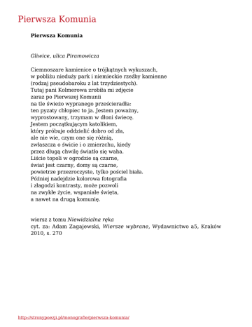Pierwsza Komunia Pierwsza Komunia Gliwice, ulica Piramowicza Ciemnoszare kamienice o trójkątnych wykuszach, w pobliżu nieduży park i niemieckie rzeźby kamienne (rodzaj pseudobaroku z lat trzydziestych). Tutaj pani Kolmerowa zrobiła mi zdjęcie zaraz po Pierwszej Komunii na tle świeżo wypranego prześcieradła: ten pyzaty chłopiec to ja. Jestem poważny, wyprostowany, trzymam w dłoni świecę. Jestem początkującym katolikiem, który próbuje oddzielić dobro od zła, ale nie wie, czym one się różnią, zwłaszcza o świcie i o zmierzchu, kiedy przez długą chwilę światło się waha. Liście topoli w ogrodzie są czarne, świat jest czarny, domy są czarne, powietrze przezroczyste, tylko pościel biała. Później nadejdzie kolorowa fotografia i złagodzi kontrasty, może pozwoli na zwykłe życie, wspaniałe święta, a nawet na drugą komunię. wiersz z tomu Niewidzialna ręka cyt. za: Adam Zagajewski, Wiersze wybrane, Wydawnictwo a5, Kraków 2010, s. 270 http://stronypoezji.pl/monografie/pierwsza-komunia/