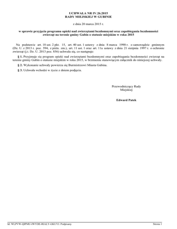 UCHWAŁA NR IV.26.2015 RADY MIEJSKIEJ W GUBINIE z dnia 20 marca 2015 r. w sprawie przyjęcia programu opieki nad zwierzętami bezdomnymi oraz zapobiegania bezdomności zwierząt na terenie gminy Gubin o statusie miejskim w roku 2015 Na podstawie art. 18 ust. 2 pkt. 15, art. 40 ust. 1 ustawy z dnia 8 marca 1990 r. o samorządzie gminnym (Dz. U. z 2013 r. poz. 594, z późn. zm.), art. 11 ust. 1 oraz art. 11a ustawy z dnia 21 sierpnia 1997 r. o ochronie zwierząt (j.t. Dz. U. 2013 poz. 856) uchwala się, co następuje: § 1. Przyjmuje się program opieki nad zwierzętami bezdomnymi oraz zapobiegania bezdomności zwierząt na terenie gminy Gubin o statusie miejskim w roku 2015, w brzmieniu stanowiącym załącznik do niniejszej uchwały. § 2. Wykonanie uchwały powierza się Burmistrzowi Miasta Gubina. § 3. Uchwała wchodzi w życie z dniem podjęcia. Przewodniczący Rady Miejskiej Edward Patek Id: WLPVW-QIPMU-IWYDE-RIALY-GKUYJ. Podpisany Strona 1 Załącznik do Uchwały Nr IV.26.2015 Rady Miejskiej w Gubinie z dnia 20 marca 2015 r. Program opieki nad zwierzętami bezdomnymi oraz zapobiegania bezdomności zwierząt na terenie gminy Gubin o statusie miejskim w roku 2015 CEL PROGRAMU Program walki z bezdomnością zwierząt, zwany dalej programem, ma na celu ograniczenie zjawiska bezdomności zwierząt domowych na terenie gminy Gubin o statusie miejskim, oraz zapewnienie właściwej opieki bezdomnym zwierzętom domowym i gospodarskim, przebywającym w granicach administracyjnych gminy. WYKONAWCY PROGRAMU Gmina Gubin o statusie miejskim , schronisko dla bezdomnych zwierząt na podstawie zlecenia gminy oraz organizacje społeczne , których celem działania jest przeciwdziałanie bezdomności zwierząt, we współpracy z organami gminy. Funkcję koordynatora działań podejmowanych w ramach Programu pełni Wydział Komunalny i Inwestycji Urzędu Miejskiego w Gubinie , w porozumieniu z Komendą Straży Miejskiej w Gubinie. ZAPEWNIENIE BEZDOMNYM ZWIERZĘTOM DOMOWYM MIEJSCA W SCHRONISKU LUB W TYMCZASOWYM PUNKCIE PRZETRZYMYWANIA BEZDOMNYCH ZWIERZĄT Zapewnienie bezdomnym zwierzętom domowym miejsc w schronisku dla bezdomnych zwierząt realizowane jest każdorazowo na podstawie zlecenia gminy. Zapewnienie zwierzętom miejsca w tymczasowym punkcie przetrzymywania bezdomnych zwierząt realizowane jest przez Wydział Komunalny i Inwestycji Urzędu Miejskiego w Gubinie oraz Straż miejską w Gubinie. OPIEKA NAD WOLNO ŻYJĄCYMI KOTAMI Opieka nad wolno żyjącymi kotami jest realizowana przez: 1. Podejmowanie interwencji w sprawach kotów wolno żyjących. 2. Podejmowanie działań mających na celu dokarmianie kotów wolno żyjących. 3. Współpracę ze społecznymi opiekunami kotów wolno żyjących, wpisanymi do rejestru społecznych opiekunów kotów, prowadzonego przez Wydział Komunalny i Inwestycji, poprzez udzielenie im wszelkiej pomocy oraz prowadzenie edukacji w zakresie odpowiedniego dożywiania zwierząt. ODŁAWIANIE BEZDOMNYCH ZWIERZĄT Na terenie gminy Gubin o statusie miejskim wprowadza się interwencyjne wyłapywanie bezdomnych zwierząt. Wyłapywaniem będą objęte bezdomne , pozostawione bez opieki zwierzęta, w stosunku do których nie ma możliwości ustalenia ich właściciela lub innej osoby, pod opieką której dotychczas pozostawały, a w szczególności zwierzęta chore lub zagrażające życiu, zdrowiu i bezpieczeństwu ludzi. Wyłapywanie bezdomnych zwierząt prowadzone będzie wyłącznie przy użyciu specjalistycznego sprzętu przeznaczonego do wyłapywania zwierząt, który nie stwarza zagrożenia dla życia i zdrowia zwierząt, a także nie będzie zadawał im cierpienia. Wyłapane zwierzęta zostaną niezwłocznie przewiezione do tymczasowego punktu przetrzymywania bezdomnych zwierząt. OBLIGATORYJNA STERYLIZACJA LUB KASTRACJA ZWIERZĄT W SCHRONISKACH DLA ZWIERZĄT Id: WLPVW-QIPMU-IWYDE-RIALY-GKUYJ. Podpisany Strona 1 Gmina realizuje obligatoryjną sterylizację lub kastrację zwierząt w schroniskach do których na podstawie zlecenia gminy przekazywane są wyłapywane interwencyjnie zwierzęta na zasadach ustalonych z jednostką prowadzącą schronisko. Zabiegom sterylizacji lub kastracji , z uwagi na możliwość zgłoszenia się właściciela lub opiekuna, nie podlegają zwierzęta w okresie 14 dni od umieszczenia w schronisku oraz przeznaczone do adopcji – w terminie określonym w ogłoszeniu o poszukiwaniu nowych właścicieli oraz zwierzęta , u których istnieją przeciwwskazania do wykonania tych zabiegów , z uwagi na ich stan i/lub wiek. Gmina zleci dokonanie sterylizacji lub kastracji na żądanie osoby adoptującej zwierzę z tymczasowego punktu przetrzymywania bezdomnych zwierząt. POSZUKIWANIE WŁAŚCICIELI DLA BEZDOMNYCH ZWIERZĄT Poszukiwanie właścicieli dla bezdomnych zwierząt realizowane jest poprzez: 1. Informację o możliwości adopcji zwierząt bezdomnych na miejskiej stronie internetowej i w prasie lokalnej. 2. Współdziałanie w tym zakresie z organizacjami społecznymi, których statutowym celem działania jest ochrona zwierząt. USYPIANIE ŚLEPYCH MIOTÓW Usypianie ślepych miotów może zostać wykonane nieodpłatnie przez lekarza weterynarii na podstawie zlecenia gminy , pod warunkiem natychmiastowej sterylizacji suki lub kotki na koszt właściciela. WSKAZANIE GOSPODARSTWA ZWIERZĄT GOSPODARSKICH ROLNEGO W CELU ZAPEWNIENIA MIEJSCA DLA W celu zapewnienia miejsca dla zwierząt gospodarskich wskazuje się gospodarstwo rolne położone w Gubinie przy ul. Jedności Robotniczej 4. ZAPEWNIENIE CAŁODOBOWEJ OPIEKI WETERYNARYJNEJ W PRZYPADKACH ZDARZEŃ DROGOWYCH Z UDZIAŁEM ZWIERZĄT Zwierzętom rannym w wyniku zdarzeń drogowych zapewnia się całodobową opiekę weterynaryjną, realizowaną przez lekarza weterynarii mającego możliwość świadczenia usług całodobowo, na podstawie zleceń. ŹRÓDŁA FINANSOWANIA PROGRAMU Program będzie realizowany ze środków budżetu Gminy Gubin o statusie miejskim na rok 2015 w kwocie 15.000,00 zł z 