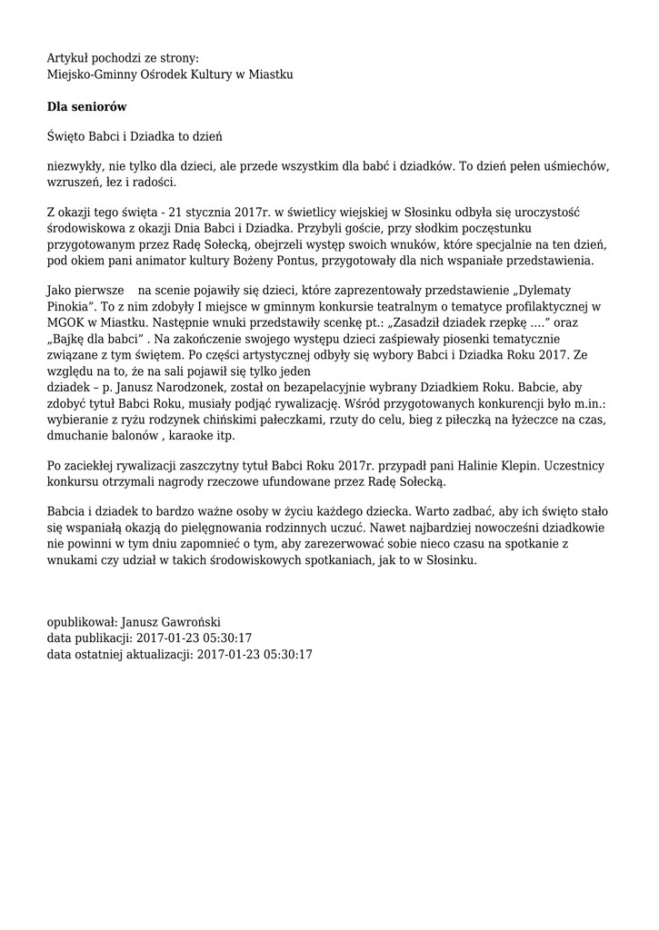 Artykuł pochodzi ze strony: Miejsko-Gminny Ośrodek Kultury w Miastku Dla seniorów Święto Babci i Dziadka to dzień niezwykły, nie tylko dla dzieci, ale przede wszystkim dla babć i dziadków. To dzień pełen uśmiechów, wzruszeń, łez i radości. Z okazji tego święta - 21 stycznia 2017r. w świetlicy wiejskiej w Słosinku odbyła się uroczystość środowiskowa z okazji Dnia Babci i Dziadka. Przybyli goście, przy słodkim poczęstunku przygotowanym przez Radę Sołecką, obejrzeli występ swoich wnuków, które specjalnie na ten dzień, pod okiem pani animator kultury Bożeny Pontus, przygotowały dla nich wspaniałe przedstawienia. Jako pierwsze na scenie pojawiły się dzieci, które zaprezentowały przedstawienie „Dylematy Pinokia”. To z nim zdobyły I miejsce w gminnym konkursie teatralnym o tematyce profilaktycznej w MGOK w Miastku. Następnie wnuki przedstawiły scenkę pt.: „Zasadził dziadek rzepkę ….” oraz „Bajkę dla babci” . Na zakończenie swojego występu dzieci zaśpiewały piosenki tematycznie związane z tym świętem. Po części artystycznej odbyły się wybory Babci i Dziadka Roku 2017. Ze względu na to, że na sali pojawił się tylko jeden dziadek – p. Janusz Narodzonek, został on bezapelacyjnie wybrany Dziadkiem Roku. Babcie, aby zdobyć tytuł Babci Roku, musiały podjąć rywalizację. Wśród przygotowanych konkurencji było m.in.: wybieranie z ryżu rodzynek chińskimi pałeczkami, rzuty do celu, bieg z piłeczką na łyżeczce na czas, dmuchanie balonów , karaoke itp. Po zaciekłej rywalizacji zaszczytny tytuł Babci Roku 2017r. przypadł pani Halinie Klepin. Uczestnicy konkursu otrzymali nagrody rzeczowe ufundowane przez Radę Sołecką. Babcia i dziadek to bardzo ważne osoby w życiu każdego dziecka. Warto zadbać, aby ich święto stało się wspaniałą okazją do pielęgnowania rodzinnych uczuć. Nawet najbardziej nowocześni dziadkowie nie powinni w tym dniu zapomnieć o tym, aby zarezerwować sobie nieco czasu na spotkanie z wnukami czy udział w takich środowiskowych spotkaniach, jak to w Słosinku. opublikował: Janusz Gawroński data publikacji: 2017-01-23 05:30:17 data ostatniej aktualizacji: 2017-01-23 05:30:17