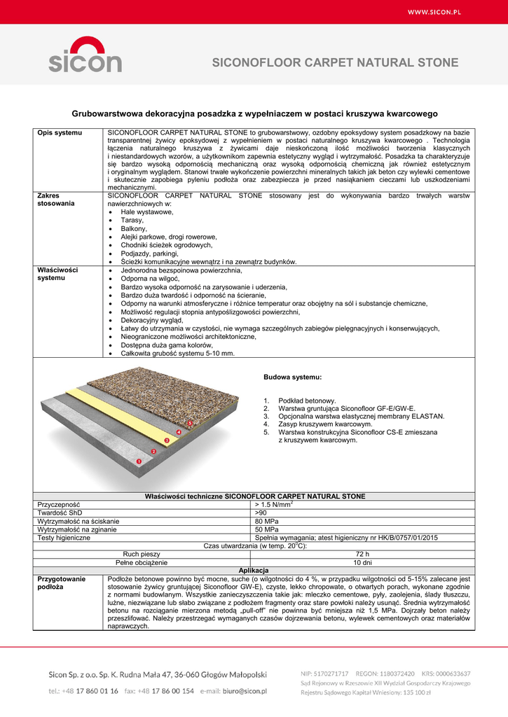SICONOFLOOR CARPET NATURAL STONE Grubowarstwowa dekoracyjna posadzka z wypełniaczem w postaci kruszywa kwarcowego Opis systemu Zakres stosowania Właściwości systemu SICONOFLOOR CARPET NATURAL STONE to grubowarstwowy, ozdobny epoksydowy system posadzkowy na bazie transparentnej żywicy epoksydowej z wypełnieniem w postaci naturalnego kruszywa kwarcowego . Technologia łączenia naturalnego kruszywa z żywicami daje nieskończoną ilość możliwości tworzenia klasycznych i niestandardowych wzorów, a użytkownikom zapewnia estetyczny wygląd i wytrzymałość. Posadzka ta charakteryzuje się bardzo wysoką odpornością mechaniczną oraz wysoką odpornością chemiczną jak również estetycznym i oryginalnym wyglądem. Stanowi trwałe wykończenie powierzchni mineralnych takich jak beton czy wylewki cementowe i skutecznie zapobiega pyleniu podłoża oraz zabezpiecza je przed nasiąkaniem cieczami lub uszkodzeniami mechanicznymi. SICONOFLOOR CARPET NATURAL STONE stosowany jest do wykonywania bardzo trwałych warstw nawierzchniowych w: Hale wystawowe, Tarasy, Balkony, Alejki parkowe, drogi rowerowe, Chodniki ścieżek ogrodowych, Podjazdy, parkingi, Ścieżki komunikacyjne wewnątrz i na zewnątrz budynków. Jednorodna bezspoinowa powierzchnia, Odporna na wilgoć, Bardzo wysoka odporność na zarysowanie i uderzenia, Bardzo duża twardość i odporność na ścieranie, Odporny na warunki atmosferyczne i różnice temperatur oraz obojętny na sól i substancje chemiczne, Możliwość regulacji stopnia antypoślizgowości powierzchni, Dekoracyjny wygląd, Łatwy do utrzymania w czystości, nie wymaga szczególnych zabiegów pielęgnacyjnych i konserwujących, Nieograniczone możliwości architektoniczne, Dostępna duża gama kolorów, Całkowita grubość systemu 5-10 mm. Budowa systemu: 1. 2. 3. 4. 5. Właściwości techniczne SICONOFLOOR CARPET NATURAL STONE > 1.5 N/mm2 >90 80 MPa 50 MPa Spełnia wymagania; atest higieniczny nr HK/B/0757/01/2015 Czas utwardzania (w temp. 200C): Ruch pieszy 72 h Pełne obciążenie 10 dni Aplikacja Podłoże betonowe powinno być mocne, suche (o wilgotności do 4 %, w przypadku wilgotności od 5-15% zalecane jest stosowanie żywicy gruntującej Siconofloor GW-E), czyste, lekko chropowate, o otwartych porach, wykonane zgodnie z normami budowlanym. Wszystkie zanieczyszczenia takie jak: mleczko cementowe, pyły, zaolejenia, ślady tłuszczu, luźne, niezwiązane lub słabo związane z podłożem fragmenty oraz stare powłoki należy usunąć. Średnia wytrzymałość betonu na rozciąganie mierzona metodą „pull-off” nie powinna być mniejsza niż 1,5 MPa. Dojrzały beton należy przeszlifować. Należy przestrzegać wymaganych czasów dojrzewania betonu, wylewek cementowych oraz materiałów naprawczych. Przyczepność Twardość ShD Wytrzymałość na ściskanie Wytrzymałość na zginanie Testy higieniczne Przygotowanie podłoża Podkład betonowy. Warstwa gruntująca Siconofloor GF-E/GW-E. Opcjonalna warstwa elastycznej membrany ELASTAN. Zasyp kruszywem kwarcowym. Warstwa konstrukcyjna Siconofloor CS-E zmieszana z kruszywem kwarcowym. SICONOFLOOR CARPET NATURAL STONE Poszczególne materiały, wchodzące w skład systemu SICONOFLOOR CARPET NATURAL STONE, należy przygotować do aplikacji zgodnie z danymi zawartymi w ich Kartach Technicznych. Warunki aplikacji SICONOFLOOR CARPET NATURAL STONE Temperatura podłoża musi być wyższa o min. 3°C od temperatury punktu rosy. Minimalna temperatura otoczenia +100C Minimalna temperatura podłoża +100C Maksymalna temperatura otoczenia +500C Maksymalna wilgotność względna 80% Dane aplikacyjne Kolejność Ilość warstw Rodzaj warstwy Nazwa materiału nakładania Siconofloor GF - E; opcjonalnieSiconofloor GW-E (dodatkowo opcjonalnie 1 2 Grunt możliwość zastosowania membrany wodoszczelnej, elastycznej) 2 1 Kruszywo kwarcowe Suszony ogniowo piasek kwarcowy frakcji 2,0-3,0 mm Siconofloor CS - E wypełniony kruszywem granulacji 5-12 mm lub 3 1 Warstwa właściwa o innym uziarnieniu Warstwa zamykająca4 1 Siconofloor CS - E opcjonalnie Sposób Podłoże betonowe należy zagruntować zgodnie z instrukcją zawartą w Karcie Technicznej materiału gruntującego nakładania Siconofloor GF-E/GW-E. Bezpośrednio po ułożeniu, materiał gruntujący należy zasypać suszonym ogniowo piaskiem i zużycie kwarcowym frakcji 2,0÷3,0 mm, w ilości ok. 0,5 kg/m 2. Po utwardzeniu warstwy gruntującej nadmiar piasku usunąć. Materiał Siconofloor CS-E należy przygotować zgodnie z instrukcją zawartą w Karcie Technicznej produktu - po wymieszaniu składników A i B materiał wymieszać z suszonym ogniowo piaskiem kwarcowym frakcji 5-12÷ mm, a następnie przygotowaną mieszaninę wylewać porcjami na zagruntowane podłoże betonowe i rozprowadzać równomiernie przy pomocy pacy metalowej. Zużycie mieszanki żywiczno-mineralnej wynosi ok. 20 kg/m 2/10 mm grubości posadzki. Rozłożoną zaprawę należy wyrównać pacami lub zacieraczką mechaniczną (20-90 obrotów/min) z łopatkami pokrytymi materiałem chemoodpornym. Warstwę pozostawić do utwardzenia przez co najmniej 24 godzin (w temperaturze +20°C). Opcjonalna warstwa zamykająca - przygotowana zgodnie z Kartą Techniczną materiału Siconofloor CS-E. Materiał należy wylewać porcjami na utwardzoną i przygotowaną warstwę żywiczną z posypką kwarcową. Ilością warstw powłoki zamykającej można regulować docelową szorstkość posadzki. Po nałożeniu ostatniej warstwy należy utrzymywać temperaturę schnięcia powyżej +15 °C przez co najmniej 24 godzin. Uwagi i zalecenia Przygotowanie materiałów Warunki BHP Warunki przechowywania komponentów systemu Pomoc techniczna Uwagi końcowe Materiały, wchodzące w skład systemu, powinny być stosowane przez przeszkolone ekipy wykonawcze. W czasie prac należy stosować sprzęt zabezpieczający oczy, drogi oddechowe oraz skórę. Podczas pracy w zamkniętych pomieszczeniach oraz w czasie wysychania, na