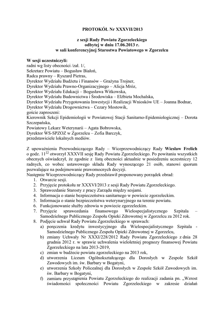 PROTOKÓŁ Nr XXXVII/2013 z sesji Rady Powiatu Zgorzeleckiego odbytej w dniu 17.06.2013 r. w sali konferencyjnej Starostwa Powiatowego w Zgorzelcu W sesji uczestniczyli: radni wg listy obecności /zał. 1/, Sekretarz Powiatu – Bogusław Białoń, Radca prawny – Ryszard Pietras, Dyrektor Wydziału Budżetu i Finansów – Grażyna Trojner, Dyrektor Wydziału Prawno-Organizacyjnego – Alicja Mróz, Dyrektor Wydziału Edukacji – Bogusława Witkowska, Dyrektor Wydziału Budownictwa i Środowiska – Elżbieta Mochalska, Dyrektor Wydziału Przygotowania Inwestycji i Realizacji Wniosków UE – Joanna Bodnar, Dyrektor Wydziału Drogownictwa – Cezary Mostowik, goście zaproszeni: Kierownik Sekcji Epidemiologii w Powiatowej Stacji Sanitarno-Epidemiologicznej – Dorota Szczepańska, Powiatowy Lekarz Weterynarii – Agata Bobrowska, Dyrektor WS-SPZOZ w Zgorzelcu – Zofia Barczyk, przedstawiciele lokalnych mediów. Z upoważnienia Przewodniczącego Rady – Wiceprzewodniczący Rady Wiesław Frelich o godz. 1113 otworzył XXXVII sesję Rady Powiatu Zgorzeleckiego. Po powitaniu wszystkich obecnych oświadczył, że zgodnie z listą obecności aktualnie w posiedzeniu uczestniczy 12 radnych, co wobec ustawowego składu Rady wynoszącego 21 osób, stanowi quorum pozwalające na podejmowanie prawomocnych decyzji. Następnie Wiceprzewodniczący Rady przedstawił proponowany porządek obrad: 1. Otwarcie sesji. 2. Przyjęcie protokołu nr XXXVI/2013 z sesji Rady Powiatu Zgorzeleckiego. 3. Sprawozdanie Starosty z pracy Zarządu między sesjami. 4. Informacja o stanie bezpieczeństwa sanitarnego w powiecie zgorzeleckim. 5. Informacja o stanie bezpieczeństwa weterynaryjnego na terenie powiatu. 6. Funkcjonowanie służby zdrowia w powiecie zgorzeleckim. 7. Przyjęcie sprawozdania finansowego Wielospecjalistycznego Szpitala – Samodzielnego Publicznego Zespołu Opieki Zdrowotnej w Zgorzelcu za 2012 rok. 8. Podjęcie uchwał Rady Powiatu Zgorzeleckiego w sprawach: a) poręczenia kredytu inwestycyjnego dla Wielospecjalistycznego Szpitala Samodzielnego Publicznego Zespołu Opieki Zdrowotnej w Zgorzelcu, b) zmiany Uchwały Nr XXXI/228/2012 Rady Powiatu Zgorzeleckiego z dnia 28 grudnia 2012 r. w sprawie uchwalenia wieloletniej prognozy finansowej Powiatu Zgorzeleckiego na lata 2013-2019, c) zmian w budżecie powiatu zgorzeleckiego na 2013 rok, d) utworzenia Liceum Ogólnokształcącego dla Dorosłych w Zespole Szkół Zawodowych im. św. Barbary w Bogatyni, e) utworzenia Szkoły Policealnej dla Dorosłych w Zespole Szkół Zawodowych im. św. Barbary w Bogatyni, f) zamiaru przystąpienia Powiatu Zgorzeleckiego do realizacji zadania pn. „Wzrost świadomości społeczności Powiatu Zgorzeleckiego w zakresie działań terapeutyczno-opiekuńczych osób z zaburzeniami psychicznymi” zgłaszanego do współfinansowania w ramach środków Mechanizmu Finansowego EOG i Norweskiego Mechanizmu Finansowego oraz budżetu państwa oraz zasad jego finansowania. 9. Interpelacje i zapytania radnych. 10. Sprawy organizacyjne. 11. Zamknięcie sesji. Wobec braku uwag do przedstawionego porządku obrad Wiceprzewodniczący Rady Wiesław Frelich poddał pod głosowanie wniosek o jego przyjęcie. W obecności 12 radnych, w głosowaniu: /za-12, przeciw-0, wstrzymujących się-0/ - Rada Powiatu jednogłośnie przyjęła ww. porządek obrad. Ad. 2. Przyjęcie protokołu nr XXXVI/2013 z sesji Rady Powiatu Zgorzeleckiego. Wobec braku uwag do protokołu nr XXXVI/2013 z sesji Rady Powiatu Zgorzeleckiego z dnia 29.05.2013 r., Wiceprzewodniczący Rady Wiesław Frelich poddał pod głosowanie wniosek o jego przyjęcie. W obecności 12 radnych, w głosowaniu: /za-12, przeciw-0, wstrzymujących się-0/ - Rada Powiatu jednogłośnie zatwierdziła ww. protokół. Ad. 3. Sprawozdanie Starosty z pracy Zarządu między sesjami. Wobec braku uwag dotyczących sprawozdania Starosty z pracy Zarządu między sesjami, Wiceprzewodniczący Rady Wiesław Frelich poddał pod głosowanie wniosek o jego przyjęcie. W obecności 12 radnych, w głosowaniu: /za-12, przeciw-0, wstrzymujących się-0/ - Rada Powiatu jednogłośnie przyjęła ww. sprawozdanie. /Sprawozdanie stanowi załącznik nr 2 do niniejszego protokołu/. Ad. 4. Informacja o stanie bezpieczeństwa sanitarnego w powiecie zgorzeleckim. Kierownik Sekcji Epidemiologii w Powiatowej Stacji Sanitarno-Epidemiologicznej – Dorota Szczepańska przedstawiła informację o stanie bezpieczeństwa sanitarnego w powiecie zgorzeleckim. Wobec braku uwag dotyczących informacji o stanie bezpieczeństwa sanitarnego w powiecie zgorzeleckim, Wiceprzewodniczący Rady Wiesław Frelich poddał pod głosowanie wniosek o jej przyjęcie. W obecności 12 radnych, w głosowaniu: /za-12, przeciw-0, wstrzymujących się-0/ - Rada Powiatu jednogłośnie przyjęła ww. informację. /Informacja stanowi załącznik nr 3 do niniejszego protokołu/. Ad. 5. Informacja o stanie bezpieczeństwa weterynaryjnego na terenie powiatu. 2 Powiatowy Lekarz Weterynarii Agata Bobrowska uzupełniając pisemną informację przedłożoną na sesję, poinformowała, że pobranych zostało 15 prób miodu na obecność sulfonamidów, z uwagi na zwiększenie nadzoru spowodowane wystąpieniem dodatniej próby. Dzisiaj też będą pobierane próby krwi od kóz, a w czerwcu będzie pobierana krew w kierunku choroby Aujeszkyego od świń. Powiat jest wolny od tej choroby i dążymy do tego, aby UE uznała nas za region urzędowo wolny od choroby Aujeszkyego, stąd też zwiększona ilość kontroli, aby nie dopuścić do wprowadzenia na teren powiatu zwierząt nieprzebadanych lub nieposiadających świadectwa zdrowia. Ponadto cały czas prowadzona jest akcja „Zero tolerancji”. Radny Marian Matyjasik poprosił o udzielenie informacji czy ubojnie znajdujące się na terenie naszego powiatu będą mogły normalnie funkcjonować, czy też rolnicy będą musieli wozić świnie do innych ubojni poza powiatem. Pani Agata Bobrowska poinformowała, że 
