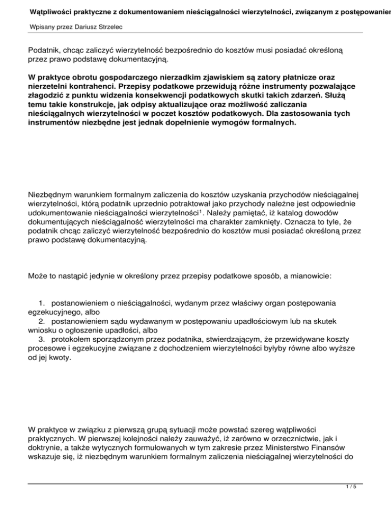 Wątpliwości praktyczne z dokumentowaniem nieściągalności wierzytelności, związanym z postępowaniem Wpisany przez Dariusz Strzelec Podatnik, chcąc zaliczyć wierzytelność bezpośrednio do kosztów musi posiadać określoną przez prawo podstawę dokumentacyjną. W praktyce obrotu gospodarczego nierzadkim zjawiskiem są zatory płatnicze oraz nierzetelni kontrahenci. Przepisy podatkowe przewidują różne instrumenty pozwalające złagodzić z punktu widzenia konsekwencji podatkowych skutki takich zdarzeń. Służą temu takie konstrukcje, jak odpisy aktualizujące oraz możliwość zaliczania nieściągalnych wierzytelności w poczet kosztów podatkowych. Dla zastosowania tych instrumentów niezbędne jest jednak dopełnienie wymogów formalnych. Niezbędnym warunkiem formalnym zaliczenia do kosztów uzyskania przychodów nieściągalnej wierzytelności, którą podatnik uprzednio potraktował jako przychody należne jest odpowiednie udokumentowanie nieściągalności wierzytelności 1 . Należy pamiętać, iż katalog dowodów dokumentujących nieściągalność wierzytelności ma charakter zamknięty. Oznacza to tyle, że podatnik chcąc zaliczyć wierzytelność bezpośrednio do kosztów musi posiadać określoną przez prawo podstawę dokumentacyjną. Może to nastąpić jedynie w określony przez przepisy podatkowe sposób, a mianowicie: 1. postanowieniem o nieściągalności, wydanym przez właściwy organ postępowania egzekucyjnego, albo 2. postanowieniem sądu wydawanym w postępowaniu upadłościowym lub na skutek wniosku o ogłoszenie upadłości, albo 3. protokołem sporządzonym przez podatnika, stwierdzającym, że przewidywane koszty procesowe i egzekucyjne związane z dochodzeniem wierzytelności byłyby równe albo wyższe od jej kwoty. W praktyce w związku z pierwszą grupą sytuacji może powstać szereg wątpliwości praktycznych. W pierwszej kolejności należy zauważyć, iż zarówno w orzecznictwie, jak i doktrynie, a także wytycznych formułowanych w tym zakresie przez Ministerstwo Finansów wskazuje się, iż niezbędnym warunkiem formalnym zaliczenia nieściągalnej wierzytelności do 1/5 Wątpliwości praktyczne z dokumentowaniem nieściągalności wierzytelności, związanym z postępowaniem Wpisany przez Dariusz Strzelec kosztów podatkowych jest postanowienie, z którego treści jasno wynika, iż przyczyną umorzenia postępowania egzekucyjnego jest brak majątku, z którego egzekucja może być prowadzona 2 . W takiej sytuacji z treści postanowienia organu egzekucyjnego wynika fakt braku majątku dłużnika na zaspokojenie określonej wierzytelności i pośrednio uznanie jej za nieściągalną. Jeżeli egzekucja została umorzona na podstawie art. 824 § 1 pkt 3 kodeksu postępowania cywilnego z uwagi na fakt, iż jest oczywiste, że z egzekucji nie uzyska się sumy wyższej od kosztów egzekucyjnych, to takie postanowienie świadczy o nieściągalności wierzytelności. Skoro nie zostaną pokryte koszty egzekucyjne, to tym bardziej nie uda się 3. wyegzekwować samej wierzytelności Przepisy kodeksu postępowania cywilnego, czyli ustawy normującej zasady prowadzenia egzekucji należności cywilnoprawnych nie posługują się terminologią właściwą dla ustaw o podatkach dochodowych. W przepisach procedury cywilnej nie ma formalnej podstawy do wydania postanowienia o nieściągalności wierzytelności, jest jednak podstawa do umorzenie prowadzonego postępowania egzekucyjnego. Ta na pierwszy rzut oka mało istotna rozbieżność w praktyce powoduje pewne komplikacje 4 . Posłużenie się przez ustawodawcę w art. 16 ust. 2 pkt 1 ustawy z dnia 15 lutego 1992 r. o podatku dochodowym od osób prawnych (tekst jedn.: Dz. U. z 2000 r. Nr 54, poz. 654 z późn. zm.) - u.p.d.o.p., terminem „postanowienie o nieściągalności" nie może być utożsamiane z postanowieniem o umorzeniu egzekucji, którym posługują się przepisy kodeksu postępowania cywilnego. Sytuacje, w których może być wydane postanowienie o umorzeniu postępowania egzekucyjnego określone w art. 824 k.p.c dotyczą w wielu wypadkach uchybień formalnoprawnych, jak np. braku zdolności sądowej dłużnika, czy niemożności stosowania egzekucji sądowej. Nie zawsze nawiązują one bezpośrednio do sytuacji majątkowej dłużnika, która to okoliczność ma decydujące znaczenie dla uznania danej wierzytelności za nieściągalną z punktu widzenia przepisów podatkowych. Podstawą do zaliczenia w ciężar kosztów uzyskania przychodów wierzytelności nieściągalnej nie może być postanowienie o umorzeniu postępowania, jak i inne postanowienia organów egzekucyjnych, z treści których nie wynika jednoznacznie, iż podstawą nieściągalności wierzytelności był brak majątku dłużnika. 2/5 Wątpliwości praktyczne z dokumentowaniem nieściągalności wierzytelności, związanym z postępowaniem Wpisany przez Dariusz Strzelec Jednocześnie przepis wskazuje, iż nieściągalność wierzytelności jest udowodniona, gdy zostanie wydane stosowne postanowienie przez organ egzekucyjny, które zostanie uznane przez wierzyciela jako odpowiadające stanowi faktycznemu. W tym znaczeniu przepisy pozostawiły podatnikowi będącemu wierzycielem swobodę oceny stanu faktycznego dotyczącego tego majątku, uznając, iż jeśli ten powziąłby wiadomości o składnikach majątku dłużnika innych niż te, z których prowadzona jest egzekucja, względy ekonomiczne spowodowałyby zakwestionowanie ustaleń poczynionych przez organ egzekucyjny przykładowo w drodze zażalenia na postanowienie tegoż organu. Tym samym brak byłoby podstaw do uznania takiej wierzytelności jako kosztu uzyskania przychodów. Niekiedy w trakcie postępowania egzekucyjnego możemy się spotkać z innymi sytuacjami, które na pozór mogą wywołać mylne wrażenie, iż mamy do czynienia z bezskutecznością egzekucji, a więc możemy wywodzić z tego określone konsekwencje podatkowe. Podstawą dokumentacyjną d