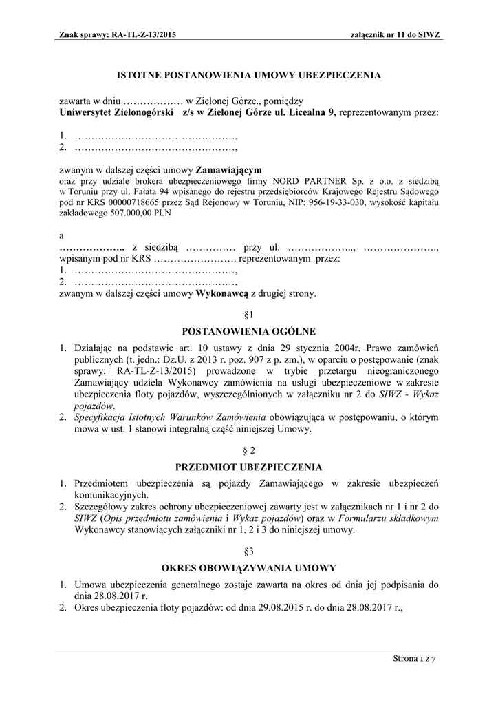 Znak sprawy: RA-TL-Z-13/2015 załącznik nr 11 do SIWZ ISTOTNE POSTANOWIENIA UMOWY UBEZPIECZENIA zawarta w dniu ……………… w Zielonej Górze., pomiędzy Uniwersytet Zielonogórski z/s w Zielonej Górze ul. Licealna 9, reprezentowanym przez: 1. …………………………………………, 2. …………………………………………, zwanym w dalszej części umowy Zamawiającym oraz przy udziale brokera ubezpieczeniowego firmy NORD PARTNER Sp. z o.o. z siedzibą w Toruniu przy ul. Fałata 94 wpisanego do rejestru przedsiębiorców Krajowego Rejestru Sądowego pod nr KRS 00000718665 przez Sąd Rejonowy w Toruniu, NIP: 956-19-33-030, wysokość kapitału zakładowego 507.000,00 PLN a ……………….. z siedzibą …………… przy ul. ……………….., …………………., wpisanym pod nr KRS ……………………. reprezentowanym przez: 1. …………………………………………, 2. …………………………………………, zwanym w dalszej części umowy Wykonawcą z drugiej strony. §1 POSTANOWIENIA OGÓLNE 1. Działając na podstawie art. 10 ustawy z dnia 29 stycznia 2004r. Prawo zamówień publicznych (t. jedn.: Dz.U. z 2013 r. poz. 907 z p. zm.), w oparciu o postępowanie (znak sprawy: RA-TL-Z-13/2015) prowadzone w trybie przetargu nieograniczonego Zamawiający udziela Wykonawcy zamówienia na usługi ubezpieczeniowe w zakresie ubezpieczenia floty pojazdów, wyszczególnionych w załączniku nr 2 do SIWZ - Wykaz pojazdów. 2. Specyfikacja Istotnych Warunków Zamówienia obowiązująca w postępowaniu, o którym mowa w ust. 1 stanowi integralną część niniejszej Umowy. §2 PRZEDMIOT UBEZPIECZENIA 1. Przedmiotem ubezpieczenia są pojazdy Zamawiającego w zakresie ubezpieczeń komunikacyjnych. 2. Szczegółowy zakres ochrony ubezpieczeniowej zawarty jest w załącznikach nr 1 i nr 2 do SIWZ (Opis przedmiotu zamówienia i Wykaz pojazdów) oraz w Formularzu składkowym Wykonawcy stanowiących załączniki nr 1, 2 i 3 do niniejszej umowy. §3 OKRES OBOWIĄZYWANIA UMOWY 1. Umowa ubezpieczenia generalnego zostaje zawarta na okres od dnia jej podpisania do dnia 28.08.2017 r. 2. Okres ubezpieczenia floty pojazdów: od dnia 29.08.2015 r. do dnia 28.08.2017 r., Strona 1 z 7 Znak sprawy: RA-TL-Z-13/2015 załącznik nr 11 do SIWZ §4 ZASADY UBEZPIECZENIA 1. Wykonawca zobowiązuje się do wystawienia dokumentów poświadczających udzielenie ochrony ubezpieczeniowej i dokumentów określających wysokość składek odrębnie na każdy pojazd w terminie do 14 dni przed rozpoczęciem okresu ubezpieczenia i dostarczenia nie później niż na 7 dni przed rozpoczęciem okresu ubezpieczenia, z wyłączeniem pojazdów doubezpieczanych dla których dokument ubezpieczenia będzie wystawiony w dniu zgłoszenia do ubezpieczenia, pod warunkiem że zgłoszenie nastąpiło w godzinach pracy Wykonawcy. 2. Wykonawca zobowiązany będzie, w terminie do 14 dni przed każdym następnym okresem ubezpieczenia, do wystawiania polis ubezpieczenia na kolejny 12 miesięczny okres ochrony ubezpieczeniowej. 3. Początek okresu obowiązywania umów indywidualnych (polis) jest tożsamy z początkiem okresu odpowiedzialności. §5 NIEZMIENNOŚĆ UMOWY 1. W przypadku sprzeczności Ogólnych Warunków Ubezpieczenia z treścią Specyfikacji Istotnych Warunków Zamówienia, decyduje treść Specyfikacji Istotnych Warunków Zamówienia oraz oferta Wykonawcy. 2. W okresie obowiązywania Umowy warunki ubezpieczenia nie mogą zostać zmienione w stosunku do treści oferty, chyba że zmiana będzie korzystna dla Zamawiającego i/lub została przewidziana. 3. W przypadku sprzeczności pomiędzy treścią niniejszej Umowy ubezpieczenia generalnego, a treścią umów indywidualnych (polis) lub ogólnych warunków ubezpieczenia, decyduje treść Umowy. §6 SKŁADKI 1. Wartość wynagrodzenia należnego Wykonawcy z tytułu realizacji całej umowy nie może przekroczyć kwoty brutto: ……………. zł (słownie brutto: ………………… złote 00/100 zł) 2. Stawki ubezpieczeniowe określone w ofercie Wykonawcy nie mogą ulec zmianie przez cały okres obowiązywania umowy z zastrzeżeniem §5 ust. 2. 3. Faktyczna wartość wynagrodzenia należnego Wykonawcy z tytułu realizacji niniejszej umowy będzie wynikała z naliczania składek za okres faktycznej ochrony ubezpieczeniowej dla każdego z pojazdów (okresy te wynikają z informacji zawartych w załączniku nr 2 do umowy – Wykaz pojazdów) w oparciu o stawki i składki ubezpieczeniowe podane przez Wykonawcę w Formularzu składkowym (tab. nr 1 i 2) stanowiącym załącznik nr 3 do niniejszej umowy. Faktyczne składki będą naliczane zgodnie z zasadami określonymi w SIWZ wraz z załącznikami. 4. Płatność składki dokonana zostanie na konto Wykonawcy wskazane w dokumentach ubezpieczeniowych. 5. Składki będą płatne w każdym 12 miesięcznym okresie ubezpieczenia – jednorazowo. Każda z rat płatna w terminie 21 dni od daty wystawienia polis. 6. Wykonawca nie ma prawa cesji praw i/lub obowiązków wynikających z niniejszej umowy na rzecz osób trzecich z zastrzeżeniem ust. 7. Strona 2 z 7 Znak sprawy: RA-TL-Z-13/2015 załącznik nr 11 do SIWZ 7. Przelew wierzytelności Wykonawcy wynikających z niniejszej umowy wymaga dla swej ważności uprzedniej pisemnej zgody Zamawiającego. §7 KONTAKTY MIĘDZY STRONAMI 1. Stałe kontakty w ramach realizacji niniejszej umowy, w tym dokonywanie uzgodnień organizacyjnych we wszystkich sprawach dotyczących prawidłowego wykonania umowy, prowadzone będą telefonicznie, faksem lub za pomocą poczty elektronicznej. 2. Osobami upoważnionymi do stałych kontaktów w ramach wykonania niniejszej umowy, tj. uprawnionymi do dokonywania uzgodnień organizacyjnych we wszystkich sprawach dotyczących prawidłowego wykonania umowy są: 1) ze strony Wykonawcy: ..............., - nr tel. i nr faksu: ………………., - adres e-mail: ……………….; 2) ze strony Zamawiającego: ......