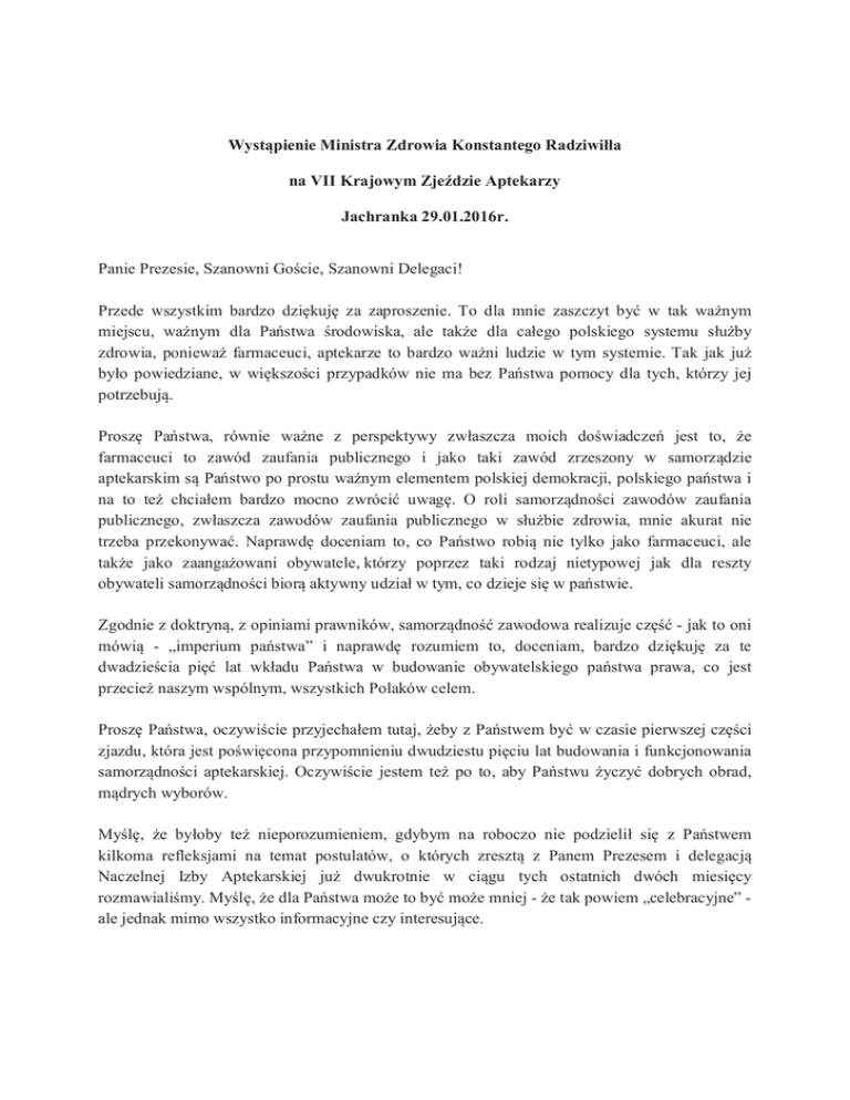 Wyst pienie Ministra Zdrowia Konstantego Radziwi a na VII Krajowym Zje dzie Aptekarzy Jachranka 29.01.2016r. Panie Prezesie, Szanowni Go cie, Szanowni Delegaci! Przede wszystkim miejscu, wa nym zdrowia, poniewa by o powiedziane, potrzebuj . bardzo dzi kuj za zaproszenie. To dla mnie zaszczyt by w tak wa nym dla Pa stwa rodowiska, ale tak e dla ca ego polskiego systemu s by farmaceuci, aptekarze to bardzo wa ni ludzie w tym systemie. Tak jak ju w wi kszo ci przypadków nie ma bez Pa stwa pomocy dla tych, którzy jej Prosz Pa stwa, równie wa ne z perspektywy zw aszcza moich do wiadcze jest to, e farmaceuci to zawód zaufania publicznego i jako taki zawód zrzeszony w samorz dzie aptekarskim s Pa stwo po prostu wa nym elementem polskiej demokracji, polskiego pa stwa i na to te chcia em bardzo mocno zwróci uwag . O roli samorz dno ci zawodów zaufania publicznego, zw aszcza zawodów zaufania publicznego w s bie zdrowia, mnie akurat nie trzeba przekonywa . Naprawd doceniam to, co Pa stwo robi nie tylko jako farmaceuci, ale tak e jako zaanga owani obywatele, którzy poprzez taki rodzaj nietypowej jak dla reszty obywateli samorz dno ci bior aktywny udzia w tym, co dzieje si w pa stwie. Zgodnie z doktryn , z opiniami prawników, samorz dno zawodowa realizuje cz - jak to oni mówi - „imperium pa stwa” i naprawd rozumiem to, doceniam, bardzo dzi kuj za te dwadzie cia pi lat wk adu Pa stwa w budowanie obywatelskiego pa stwa prawa, co jest przecie naszym wspólnym, wszystkich Polaków celem. Prosz Pa stwa, oczywi cie przyjecha em tutaj, eby z Pa stwem by w czasie pierwszej cz ci zjazdu, która jest po wi cona przypomnieniu dwudziestu pi ciu lat budowania i funkcjonowania samorz dno ci aptekarskiej. Oczywi cie jestem te po to, aby Pa stwu yczy dobrych obrad, drych wyborów. My , e by oby te nieporozumieniem, gdybym na roboczo nie podzieli si z Pa stwem kilkoma refleksjami na temat postulatów, o których zreszt z Panem Prezesem i delegacj Naczelnej Izby Aptekarskiej ju dwukrotnie w ci gu tych ostatnich dwóch miesi cy rozmawiali my. My , e dla Pa stwa mo e to by mo e mniej - e tak powiem „celebracyjne” ale jednak mimo wszystko informacyjne czy interesuj ce. Prosz Pa stwa, wiem o ca ej li cie Pa stwa postulatów, oczywi cie nie b o nich wszystkich mówi . Chcia bym powiedzie przede wszystkim, e w Ministerstwie Zdrowia w tej chwili odpowiedzialnym za wi kszo spraw, którymi Pa stwo si zajmuj jest Pan minister anda, któremu kaza em zosta w Warszawie. Jest bardzo du o pracy i mimo e wybiera si tutaj i zamierza ze mn przyjecha prosi em, eby robi to, co musi, bo niestety obowi zki takie towarzysko-jubileuszowe czasami bardzo zaburzaj proces pracy na Miodowej 15. Przekazuj od niego bardzo serdeczne pozdrowienia. Prosz Pa stwa planujemy w Ministerstwie tak kompleksow reform mo na powiedzie obszaru w którym Pa stwo funkcjonuj . To b dzie po pierwsze du a nowelizacja Ustawy Prawo Farmaceutyczne, to b dzie du a nowelizacja Ustawy Refundacyjnej. Planujemy tak e i to jest jeden z Pa stwa postulatów, opracowanie nowej Ustawy o Zawodzie Farmaceuty, która b dzie regulowa a nie przy okazji, tylko niezale nie od tamtych regulacji obszar Pa stwa zawodu i Pa stwa samorz du. To jest wa na informacja, szczególnie tutaj na zje dzie samorz du. Prosz Pa stwa, z takich rzeczy mniej czy bardziej szczegó owych, ale zdaj sobie spraw jak bardzo zajmuj cych Pa stwa, cz sto przera aj cych, naruszaj cych powiedzia bym Pa stwa przysz czy wizj przysz ci, czy pewno przysz ci Pa stwa prowadz cych apteki jest kwestia równego dost pu aptek do leków. Nie chc wchodzi w szczegó y, ale chcia bym powiedzie , e jest to obszar, którym interesujemy si i w którym chcemy uregulowa te sprawy tak, eby rzeczywi cie odbywa o si to w sposób, który nale oby nazwa sprawiedliwym. Druga kwestia to sprawa, kto mo e prowadzi aptek . I tutaj ws uchuj c si w ró ne g osy, nie chc zapowiada ju konkretnych rozwi za , ale sk aniamy si do tego aby pój w kierunku takim, e aptek mo e posiada aptekarz b spó ka, któr aptekarze kontroluj . To jest taki kompromis. Oczywi cie, prosz Pa stwa, generalnym kierunkiem, w którym b dziemy zmierza w reformowaniu regulacji, z którymi mamy do czynienia w tej chwili jest pogodzenie dobrych tradycji aptekarskich z zasadami wolno ci czy swobody gospodarczej, ale maj c zawsze na uwadze przede wszystkim jedno – e najwa niejsi s pacjenci, ci którzy korzystaj z tego, co Pa stwo robi . Jak wspomnia em, planujemy opracowa now ustaw i oczywi cie tutaj bardzo licz na nowe adze samorz du – Ustaw o Zawodzie Farmaceuty. Ustaw , która b dzie kompleksowo regulowa sprawy Pa stwa zawodu i samorz du bo tak jak wspomnia em wcze niej wydaje si , e te inne ustawy maj inny cel – to nie mo e by regulowane przy okazji. Tu adnej rewolucji bym si nie spodziewa , aczkolwiek b dziemy bardzo uwa nie nas uchiwa postulatów z Pa stwa strony. Nast pnie kwestia obrotu pozaaptecznego lekami. Prosz Pa stwa, tutaj te trzeba po prostu zdrowego rozs dku. Ja bym powiedzia tak: kierunek b dzie na ograniczenie tego obrotu. To nie jest kwestia wyeliminowania, ale ograniczenia tego obrotu. Ograniczenia, zarówno co do asortymentu mo liwego do sprzeda y poza aptekami, jak te co do wielko ci opakowa . Aby by y to minimalne opakowania, by z jednej strony nie nara ludzi na bezmy ln ich konsumpcj a z drugiej strony, by da mo liwo korzystania z tych leków, które mo na ludziom oferowa w takich warunkach dla ich wygody i bezpiecze stwa. Prosz Pa stwa, z wielu ró nych innych spraw chcia bym równie wspomnie o kwestii, która jest niezwykle gor cym problemem. Jest to kwestia koncentracji aptek. Chcia bym powiedzie , e w tym zakresie nie podj li my jeszcze do ko ca decyzji. Z ca pewno ci chc zapewni , e poprzez Inspekcj Farmaceutyczn , której chcieliby my przywróci tzw. struktur pionow , tak, by Minister Zdrowia i G ówny Inspektor Farmaceutyczny mieli wi cej kontroli nad tym co inspekcja robi, chcemy krótko mówi c przestrzega prawa. Przestrze