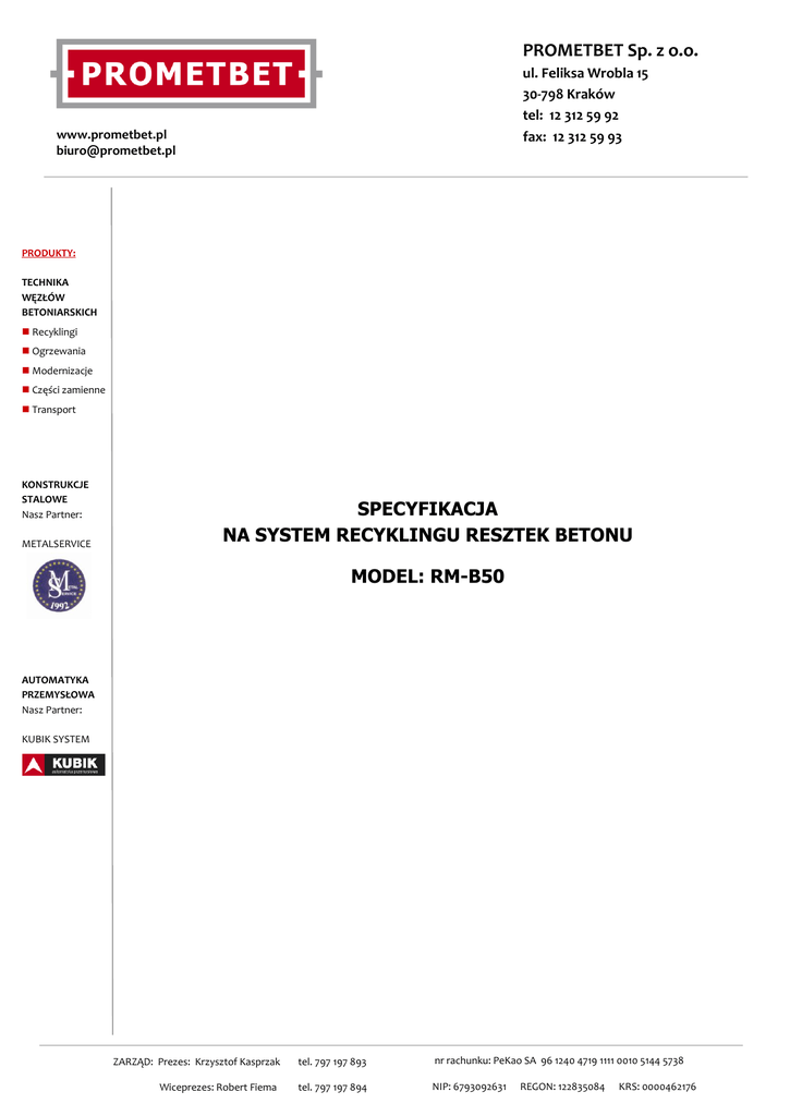 PROMETBET Sp. z o.o. ul. Feliksa Wrobla 15 30-798 Kraków tel: 12 312 59 92 fax: 12 312 59 93 www.prometbet.pl [email protected] PRODUKTY: TECHNIKA WĘZŁÓW BETONIARSKICH Recyklingi Ogrzewania Modernizacje Części zamienne Transport KONSTRUKCJE STALOWE Nasz Partner: METALSERVICE SPECYFIKACJA NA SYSTEM RECYKLINGU RESZTEK BETONU MODEL: RM-B50 AUTOMATYKA PRZEMYSŁOWA Nasz Partner: KUBIK SYSTEM ZARZĄD: Prezes: Krzysztof Kasprzak Wiceprezes: Robert Fiema tel. 797 197 893 nr rachunku: PeKao SA 96 1240 4719 1111 0010 5144 5738 tel. 797 197 894 NIP: 6793092631 REGON: 122835084 KRS: 0000462176 PROMETBET Sp. z o.o. ul. Feliksa Wrobla 15 30-798 Kraków tel: 12 312 59 92 fax: 12 312 59 93 www.prometbet.pl [email protected] Podstawowe parametry systemu recyklingu: wydajność separatora: 12÷15m³/h separowane frakcje kruszyw: 02÷32mm PRODUKTY: pojemność zbiornika popłuczyn: 50m³ (stalowy beczka) TECHNIKA WĘZŁÓW BETONIARSKICH zasilanie elektryczne: 3 x 400V AC moc silnika napędu separatora: 5,5 kW moc silnika napędu mieszadła: 7,5 kW Ogrzewania moc pomp szlamowych zatapialnych: 2 x 2,2 kW ; 1 x 3,0 kW Modernizacje sterowanie systemem recyklingu: własne, oparte na modułach logicznych Recyklingi Części zamienne Transport Wyposażenie systemu recyklingu: Separator S 606 KONSTRUKCJE STALOWE Nasz Partner: METALSERVICE - łożyskowanie ślimaka oporowo-toczne część górna, - zespół łożyskowy ,ślizgowy z pakietem uszczelniającym – część dolna, - smarowanie łożyskowań centralne, ręczne umiejscowione w jednym punkcie dla łatwiejszej obsługi, - wszystkie włazy i pokrywy zabezpieczone blokadami i wyłącznikami krańcowymi, - połączenie napędu ze ślimakiem poprzez motoreduktor i sprzęgło elastyczne kłowe, - przewody smarownicze i elektryczne zamontowane w rurach osłonowych, - kompletna instalacja wodna, elektryczna oraz sygnalizacyjna, - wanna do płukania betonomieszarek przystosowana do rozładunku ładowarek z resztek betonu o szerokości łyżki do 3,2m. AUTOMATYKA PRZEMYSŁOWA Nasz Partner: KUBIK SYSTEM Zbiornik popłuczyn stalowy beczka B50 - jedno mieszadło wewnątrz zbiornika w celu zminimalizowania osadzania się cząstek stałych na dnie zbiornika oraz utrzymania jednorodnej zawiesiny popłuczyn, - podwójne łożyskowanie wału mieszadła zabezpieczone przed zanurzeniem w popłuczynach, - podesty stalowe z blachy ryflowanej zamontowane na zbiorniku popłuczyn, - cztery pokrywy zabezpieczające dostęp do pomp i wnętrza zbiornika, - barierki ochronne zgodne z przepisami BHP, - drabina wejściowa na zbiornik z pałąkiem ochronnym zgodna z przepisami BHP, - jedna pompa szlamowa zatapialna do mycia betonomieszarek, - jedna pompa szlamowa zatapialna dozująca popłuczyny do wagi wody, Zbiornik pośredni - pokrywa zabezpieczająca dostęp do wnętrza zbiornika popłuczyn, - izolacja zbiornika wełną mineralną 50mm zabezpieczona blachą ocynkowaną gładką, - żurawik z wciągarką ręczną umożliwiającą wyjęcie pompy szlamowej do obsługi serwisowej, - jedna pompa szlamowa zatapialna służąca do transportu popłuczyn do zbiornika głównego. ZARZĄD: Prezes: Krzysztof Kasprzak Wiceprezes: Robert Fiema tel. 797 197 893 nr rachunku: PeKao SA 96 1240 4719 1111 0010 5144 5738 tel. 797 197 894 NIP: 6793092631 REGON: 122835084 KRS: 0000462176 PROMETBET Sp. z o.o. ul. Feliksa Wrobla 15 30-798 Kraków tel: 12 312 59 92 fax: 12 312 59 93 www.prometbet.pl [email protected] Sterowanie systemem recyklingu Wyświetlacz LCD zamontowany w pomieszczeniu operatora informujący o pracy całego systemu recyklingu wraz z wizualizacją. PRODUKTY: System pracuje w następujących cyklach: TECHNIKA WĘZŁÓW BETONIARSKICH - ręcznym (manualne) Recyklingi - automatycznym (sterownik) - zimowym Ogrzewania - letnim Modernizacje - sterowanie umieszczone jest w szafie metalowej hermetycznej, umiejscowionej obok zbiornika popłuczyn, Części zamienne - w pomieszczeniu operatora jest zamontowany sygnalizator prawidłowej pracy i awarii systemu. Transport Zabezpieczenie antykorozyjne Konstrukcja oczyszczana metodą strumieniowo-ścierną a następnie malowana. Powierzchnia zewnętrzna konstrukcji KONSTRUKCJE STALOWE Nasz Partner: stalowej malowana farbą poliuretanową, powierzchnia wewnętrzna konstrukcji stalowej (wnętrze zbiorników, wewnętrzna część koryta separatora) farba podkładową, całkowita grubość powłoki antykorozyjnej podkładowej i nawierzchniowej około 150µm. METALSERVICE Opcje - Wyświetlacz LCD zamontowany w pomieszczeniu operatora informujący o pracy całego systemu recyklingu wraz z wizualizacją, jest połączony ze sterownikiem i ma wiele funkcji, którymi można kontrolować pracę całego systemu, znacznie ułatwia zdiagnozowanie przyczyny ewentualnej awarii, AUTOMATYKA PRZEMYSŁOWA Nasz Partner: KUBIK SYSTEM - system dolewania czystej wody do zbiornika sterowany elektrozaworem z sondą ultradźwiękową do zarządzania poziomami stanów wody w zbiorniku, zamiast pływaków, - pompa z instalacją do mycia wanny zalewowej, - centralne smarowanie, - izolacja wełna mineralną i blachą ocynkowaną separatora oraz zbiornika popłuczyn, - podgrzewane koryto separatora, - boks na kruszywa, - wanna do mycia pomp. ZARZĄD: Prezes: Krzysztof Kasprzak Wiceprezes: Robert Fiema tel. 797 197 893 nr rachunku: PeKao SA 96 1240 4719 1111 0010 5144 5738 tel. 797 197 894 NIP: 6793092631 REGON: 122835084 KRS: 0000462176