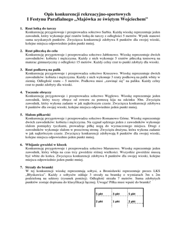 Opis konkurencji rekreacyjno-sportowych I Festynu Parafialnego „Majówka ze świętym Wojciechem” 1. Rzut lotką do tarczy Konkurencję przygotowuje i przeprowadza sołectwo Sarbia. Każdą wioskę reprezentuje jeden zawodnik, który wykonuje pięć rzutów lotką do tarczy z odległości 5 metrów. Wynik stanowi suma uzyskanych punktów. Zwycięzca konkurencji zdobywa 8 punktów dla swojej wioski, kolejne miejsca odpowiednio jeden punkt mniej. 2. Rzut piłeczką do celu Konkurencję przygotowuje i przeprowadza sołectwo Jabłonowo. Wioskę reprezentuje dwóch zawodników: kobieta i mężczyzna. Każdy z nich wykonuje 5 rzutów piłeczką tenisową na materac gimnastyczny z odległości 15 metrów. Każdy celny rzut to punkt zdobyty dla wioski. 3. Rzut podkową na palik Konkurencję przygotowuje i przeprowadza sołectwo Kruszewo. Wioskę reprezentuje dwóch zawodników: kobieta i mężczyzna. Każdy z nich wykonuje 3 rzuty podkową na palik wbity w ziemię. Odległość rzutu – 5 metrów. Podkowa musi „zawinąć się” na paliku. Każdy celny rzut to punkt zdobyty dla wioski. 4. Toczenie obręczy Konkurencję przygotowuje i przeprowadza sołectwo Węglewo. Wioskę reprezentuje jeden zawodnik, który toczy obręcz od roweru za pomocą kija na odcinku 30m. Zwycięża zawodnik, który wykona zadanie w jak najkrótszym czasie. Zwycięzca konkurencji zdobywa 8 punktów dla swojej wioski, kolejne miejsca odpowiednio jeden punkt mniej. 5. Slalom piłkarski Konkurencję przygotowuje i przeprowadza sołectwo Romanowo Górne. Wioskę reprezentuje dwóch zawodników: kobieta i mężczyzna. Na sygnał sędziego jeden z zawodników wykonuje slalom pomiędzy tyczkami, prowadząc piłkę nogą do wyznaczonego miejsca. Drugi z zawodników wykonuje slalom w przeciwną stronę. Zwycięża drużyna, która wykona zadanie w jak najkrótszym czasie. Zwycięzcy konkurencji zdobywają 8 punktów dla swojej wioski, kolejne miejsca odpowiednio jeden punkt mniej. 6. Wbijanie gwoździ w klocek Konkurencję przygotowuje i przeprowadza sołectwo Marunowo. Wioskę reprezentuje jeden zawodnik, który wbija na czas trzy gwoździe różnej wielkości. Wszystkie gwoździe muszą być wbite do końca. Zwycięzca konkurencji zdobywa 8 punktów dla swojej wioski, kolejne miejsca odpowiednio jeden punkt mniej. 7. Strzały do bramki W tej konkurencji wioskę reprezentują sołtysi, a Bronisławki reprezentuje prezes LKS „Błyskawica”. Każdy z sołtysów oddaje 3 strzały na bramkę o wymiarach 3m x 2m podzieloną na sektory (rysunek poniżej). Odległość strzału 7 metrów. Suma zdobytych punktów zostaje dopisana do klasyfikacji łącznej. Uwaga! Piłka musi wpaść do bramki! 5 pkt 3 pkt 5 pkt 2 pkt 1 pkt 2 pkt 8. Bieg w worku Konkurencję przygotowuje i przeprowadza sołectwo Walkowice. Wioskę reprezentuje dwóch zawodników: kobieta i mężczyzna, którzy na czas wspólnie pokonują wyznaczony odcinek, trzymając po jednej nodze w worku. Zwycięża drużyna, która wykona zadanie najszybciej. Zwycięzcy konkurencji zdobywają 8 punktów dla swojej wioski, kolejne miejsca odpowiednio jeden punkt mniej. 9. Rzut jajkiem do patelni Konkurencję przygotowuje i przeprowadza wieś Bronisławki. Wioskę reprezentuje jeden zawodnik, który rzuca 3 jajkami do wiszącej patelni z odległości 5 metrów. Każde trafione jajko to jeden punkt dla wioski. Jeżeli jajko się nie zbije, rzut można powtórzyć. • W przypadku niejasności niektórych punktów w opisie proszę o kontakt telefoniczny (600 382 705); • Za daną konkurencję odpowiada organizator i do niego należy ostateczna interpretacja regulaminu;