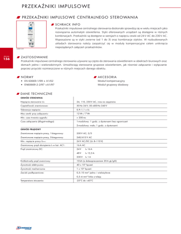 PRZEKAŹNIKI IMPULSOWE W PRZEKAŹNIKI IMPULSOWE CENTRALNEGO STEROWANIA W SCHRACK INFO LQ661230 strona 156 Przekaźniki impulsowe centralnego sterowania doskonale sprawdzą się w wielu miejscach jako rozwiązania automatyki oświetlenia. Styki oferowanych urządzeń są dostępne w różnych kombinacjach. Przekaźniki są dostępne w wersjach o napięciu cewki od 24 V AC do 230 V AC. Wyposażone są w styki zwierne (od 1 do 3) oraz kombinacje styków. W rozbudowanych układach sterowania należy zaopatrzyć się w moduły kompensacyjne celem uniknięcia niepożądanych załączeń przekaźników. W ZASTOSOWANIE Przekaźniki impulsowe centralnego sterowania używane są często do sterowania oświetleniem w obiektach biurowych oraz domach jedno i wielorodzinnych. Umożliwiają sterowanie grupowe oświetleniem, jak również załączanie i wyłączanie poprzez przyciski rozmieszczone w różnych miejscach danego obiektu. W NORMY W AKCESORIA • EN 60669-1/99 + A1/02 • EN60669-2-2/97 +A1/97 Moduł kompensacyjny Moduł grupowy diodowy W DANE TECHNICZNE OBWÓD STEROWNIA Napięcie sterowania Us: 24, 110, 230 V AC, inne na zapytanie Częstotliwość znamionowa: 50 Hz 24 V; 50–400 Hz 240 V Tolerancja napięcia: 0,9–1,1 x Us Moc cewki przy załączaniu 12 VA / 7 VA Min. czas trwania sygnału: > 200 ms Czas załączenia (długotrwałego): 1-modułowy: 1 godz. z dystansami bez ograniczeń 2-modułowy: maks. 1 godz. z dystansami OBWÓD PRĄDOWY Znamionowe napięcie pracy, 1-biegunowy: 250 V AC; 2/3 Znamionowe napięcie pracy, 3-biegunowy: 240/415 V AC Min. napięcie pracy Umin: 24 V AC/DC (Us 8–110 V) Znamionowy prąd obciążenia Iu w kat. AC1: 16 A AC Prąd znamionowy DC: 24 V Ie 16 A 48 V Ie 12,5 A 230 V Ie 1 A Krótkotrwały prąd zwarciowy: 10 kA (z dobezpieczeniem 20 A gL/gG) Żywotność elektryczna: 40 x 102 łączeń Żywotność mechaniczna: 1 x 103 łączeń Zaciski podłączeniowe: 0,5–10 mm2 jedno- i wielożyłowe 0,5–6 mm2 linka z tuleją Temperatura otoczenia: -25°C do +45°C PRZEKAŹNIKI IMPULSOWE W PRZEKAŹNIKI IMPULSOWE CENTRALNEGO STEROWANIA – kontynuacja W WYMIARY 1 MOD. 43xx W PRZYKŁADOWY SCHEMAT PRACY 2 MOD. Schemat pod∏àczenia sterowania centralnego, grupowego i lokalnego D3 D2 D4 modu∏ diodowy ON A1 A2/N 2 OFF przekaênik centr. OFF przekaênik centr. A2/N 2 ZAŁ WYŁ 1 1 ON A1 A2/N 2 OFF sterowanie lokalne D1 A1 sterowanie lokalne 5,5 25,7 44 60 ON 1 sterowanie lokalne przekaênik centr. sterowanie grupowe 1 35 17,5 WYŁ ZAŁ 45 90 90 GRUPA 1 strona 157 sterowanie centralne GRUPA 2 WYŁ ZAŁ WYŁ ZAŁ A2/N 2 OFF 1 ON A1 A2/N 2 OFF sterowanie lokalne D1 OFF ON A1 przekaênik centr. D3 modu∏ diodowy A2/N 2 1 sterowanie lokalne D2 ON A1 sterowanie lokalne sterowanie grupowe 2 D4 1 przekaênik centr. ZA¸. przekaênik centr. WY¸. N L2 W PRZEKAŹNIK CENTRALNEGO STEROWANIA – KOMPENSACJA KOMPENSACJA: Moduł kompensacyjny umożliwia instalację odpowiednio większej ilości przycisków wyposażonych w jarzeniowe podświetlenie w obwodzie przekaźnika impulsowego. W poniższej tabelce pokazano, jaki wpływ na ilość możliwych do zainstalowania w obwodzie przekaźnika przycisków podświetlanych, ma zastosowanie modułu kompensacyjnego. Moduł stosowany wyłącznie na napięcie 230 V AC. Widać też, jakie są bazowe możliwości przekaźnika bez zastosowania modułu kompensacyjnego. Moduł kompensacyjny Przekaźnik impulsowy 1P-2P 3P-4P 0 8* 15* 1 23* X 2 46* 43* Kompensacja przy u¿yciu kondensatora (LQ690001) Modu³ kompensacyjny * liczba przycisków z jarzeniówkami 0,6 mA Maksymalna liczba równoległych przycisków sterowania oświetleniem 230 V 0,85 mA. Przekaźnik impulsowy (LQ6*) Bez kompensacji 3 szt. (1 mod., 2 mod.) Z kompensacją 13 szt. (1 mod.), 6 szt. (2 mod.) Z kompensacją 21 szt. (1 mod.), 12 szt. (2 mod.) n szt. 1 szt. OPIS MODUŁY KOD EAN Przekaźnik centralnego sterowania, 1Z, 24 V AC 1 9004840375152 LQ661024 Przekaźnik centralnego sterowania, 3Z, 110 V AC 1 9004840375329 LQ663110 Przekaźnik centralnego sterowania, 1Z, 230 V AC 1 9004840375145 LQ661230 Przekaźnik centralnego sterowania, 3Z, 230 V AC 2 9004840375312 LQ663230 Przekaźnik centralnego sterowania, 2Z + 1R, 230 V AC 2 9004840375350 LQ665230 Przekaźnik centralnego sterowania, 1Z + 1 R, 230 V AC 2 9004840375336 LQ669230 Diodowy moduł grupowy, 240 V AC 2 9004840394320 LQ690000 Moduł kompensacyjny, 240 V AC – 9004840394313 LQ690001 produkt dostępny z Centrum Logistycznego w Warszawie produkt dostępny z Centrum Dystrybucyjnego w Guntramsdorf produkt dostępny w STORE DOSTĘPNOŚĆ STORE BRAK produkt na zamówienie (warunki realizacji IKONKI wg uzgodnień z Działem Sprzedaży) NR KAT.