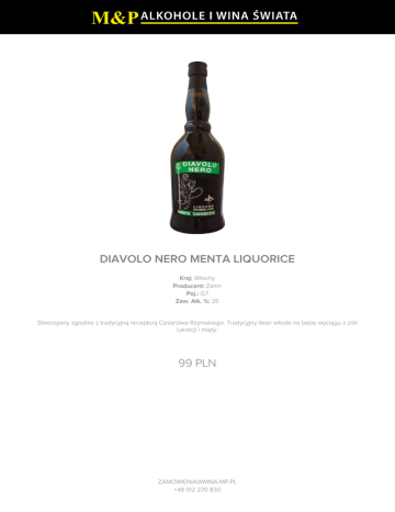 DIAVOLO NERO MENTA LIQUORICE Kraj: Włochy Producent: Zanin Poj.: 0,7 Zaw. Alk. %: 25 Stworzyony zgodnie z tradycyjną recepturą Cesarstwa Rzymskiego. Tradycyjny likier włoski na bazie wyciągu z ziół lukrecji i mięty. 99 PLN [email protected] +48 512 270 830