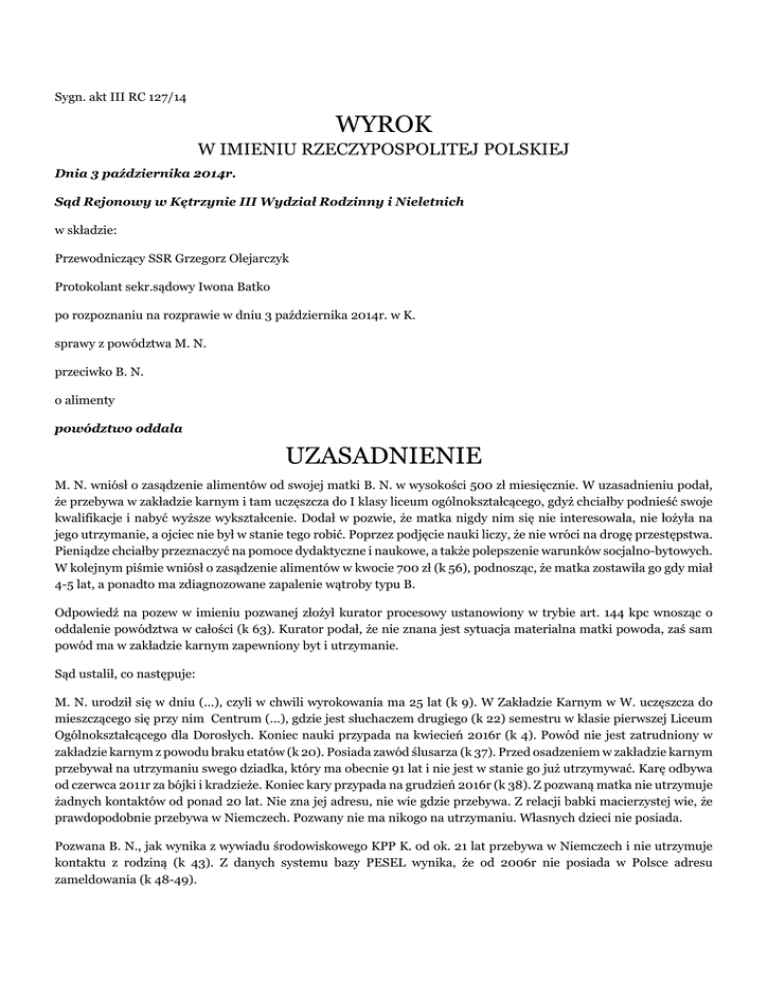 Sygn. akt III RC 127/14 WYROK W IMIENIU RZECZYPOSPOLITEJ POLSKIEJ Dnia 3 października 2014r. Sąd Rejonowy w Kętrzynie III Wydział Rodzinny i Nieletnich w składzie: Przewodniczący SSR Grzegorz Olejarczyk Protokolant sekr.sądowy Iwona Batko po rozpoznaniu na rozprawie w dniu 3 października 2014r. w K. sprawy z powództwa M. N. przeciwko B. N. o alimenty powództwo oddala UZASADNIENIE M. N. wniósł o zasądzenie alimentów od swojej matki B. N. w wysokości 500 zł miesięcznie. W uzasadnieniu podał, że przebywa w zakładzie karnym i tam uczęszcza do I klasy liceum ogólnokształcącego, gdyż chciałby podnieść swoje kwalifikacje i nabyć wyższe wykształcenie. Dodał w pozwie, że matka nigdy nim się nie interesowała, nie łożyła na jego utrzymanie, a ojciec nie był w stanie tego robić. Poprzez podjęcie nauki liczy, że nie wróci na drogę przestępstwa. Pieniądze chciałby przeznaczyć na pomoce dydaktyczne i naukowe, a także polepszenie warunków socjalno-bytowych. W kolejnym piśmie wniósł o zasądzenie alimentów w kwocie 700 zł (k 56), podnosząc, że matka zostawiła go gdy miał 4-5 lat, a ponadto ma zdiagnozowane zapalenie wątroby typu B. Odpowiedź na pozew w imieniu pozwanej złożył kurator procesowy ustanowiony w trybie art. 144 kpc wnosząc o oddalenie powództwa w całości (k 63). Kurator podał, że nie znana jest sytuacja materialna matki powoda, zaś sam powód ma w zakładzie karnym zapewniony byt i utrzymanie. Sąd ustalił, co następuje: M. N. urodził się w dniu (...), czyli w chwili wyrokowania ma 25 lat (k 9). W Zakładzie Karnym w W. uczęszcza do mieszczącego się przy nim Centrum (...), gdzie jest słuchaczem drugiego (k 22) semestru w klasie pierwszej Liceum Ogólnokształcącego dla Dorosłych. Koniec nauki przypada na kwiecień 2016r (k 4). Powód nie jest zatrudniony w zakładzie karnym z powodu braku etatów (k 20). Posiada zawód ślusarza (k 37). Przed osadzeniem w zakładzie karnym przebywał na utrzymaniu swego dziadka, który ma obecnie 91 lat i nie jest w stanie go już utrzymywać. Karę odbywa od czerwca 2011r za bójki i kradzieże. Koniec kary przypada na grudzień 2016r (k 38). Z pozwaną matka nie utrzymuje żadnych kontaktów od ponad 20 lat. Nie zna jej adresu, nie wie gdzie przebywa. Z relacji babki macierzystej wie, że prawdopodobnie przebywa w Niemczech. Pozwany nie ma nikogo na utrzymaniu. Własnych dzieci nie posiada. Pozwana B. N., jak wynika z wywiadu środowiskowego KPP K. od ok. 21 lat przebywa w Niemczech i nie utrzymuje kontaktu z rodziną (k 43). Z danych systemu bazy PESEL wynika, że od 2006r nie posiada w Polsce adresu zameldowania (k 48-49). Powód wytoczył powództwo także przeciwko ojcu G. N. w sprawie III RC 279/12, który jednak na rozprawie w dniu 25.11.2009r cofnął. Sąd zważył, co następuje: Powództwo jest niezasadne. Zgodnie z treścią art. 128 kro obowiązek alimentacyjny polega na dostarczaniu środków utrzymania, a w miarę potrzeby także środków wychowania. Obowiązek ten dotyczy dostarczania środków na bieżące potrzeby. Jednakże wobec faktu izolacji powód ma zapewnione środki na utrzymanie co najmniej do grudnia 2016r tj. do czasu zakończenia odbywania kary w zakładzie karnym. Powód ma zapewnione posiłki oraz dach nad głową. Pozostając na utrzymaniu Skarbu Państwa sam nie ponosi kosztów własnego utrzymania. Ponadto zauważyć należy, że powód naukę w szkole średniej rozpoczyna dopiero w wieku 25 lat. Z treści art. 133§1 kro co prawda można wyprowadzić wniosek, że fakt osiągnięcia pełnoletności nie przesądza sam przez się o wygaśnięciu spoczywającego na rodzicach obowiązku łożenia na utrzymanie i wychowanie dziecka. Obowiązek ten odnosi się bowiem do dziecka rozumianego jako dziecko swoich rodziców. Tym niemniej §3 tego artykułu daje prawo do uchylenia się rodziców od świadczeń alimentacyjnych względem dziecka pełnoletniego, jeżeli m.in. dziecko nie dokłada starań w celu uzyskania możności samodzielnego utrzymania się. Taka sytuacja ma miejsce w niniejszej sprawie. Powód M. N. mając obecnie 25 lat, posiadając wyuczony zawód ślusarza, dopiero w zakładzie karnym rozpoczął kształcenia na etapie szkoły średniej mimo, że w wieku 25 lat winien planowo już kończyć studia wyższe magisterskie. Ten fakt całkowicie przekreśla starania powoda o uzyskanie świadczeń alimentacyjnych. M. N. będąc jeszcze osoba małoletnią miał możliwość podjęcia nauki, z której nie korzystał, gdyż już wówczas wchodził w konflikt z prawem i jako osoba nieletnia w sprawie przed Sądem w Kętrzynie o sygn. III Now 31/01 postanowieniem z dnia 20.02.2002r orzeczono o jego umieszczeniu w placówce resocjalizacyjnej MOW. Można zatem przyjąć bez wątpliwości, że powód postępując w sposób naganny, sprzeczny z prawem sam doprowadził do sytuacji, w której zamiast realizować obowiązek szkolny przed 18 rokiem życia i później, z własnej winy w wyniku pobytu w zakładzie karnym obecnie nie jest w stanie wykorzystywać swoich możliwości zarobkowania i kontynuować naukę w szkole dla dorosłych, bądź zaocznie pracując jednocześnie na wolności. W takiej sytuacji żądanie alimentacji od matki, której w zasadzie nie zna i nie widział od 21 lat jest również sprzeczne z zasadami współżycia społecznego (art. 1441 kro). Kolejną kwestią jest sama możliwość wyegzekwowania alimentów od matki powoda. Pozwana B. N. nie ma w Polsce zameldowania i od 21 lat brak z nią kontaktu. Nie znane jest jej miejsce pobytu. Trzeba przy tym zauważyć, że w Polsce w przypadku łożenia alimentów za pośrednictwem funduszu alimentacyjnego zgodnie z art.10 ust.2. ustawy z dnia 7 września 2007r. o pomocy osobom uprawnionym do alimentów - świadczenia z funduszu alimentacyjnego nie przysługują, jeżeli osoba uprawniona została umieszczona w instytucji zapewniającej całodobowe utrzymanie. Niewątpliwie M. N. prze