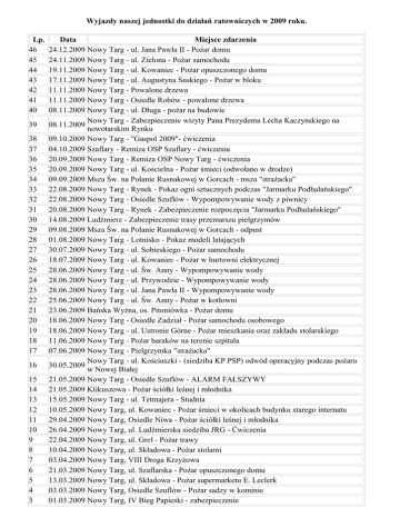 Wyjazdy naszej jednostki do działań ratowniczych w 2009 roku. Lp. 46 45 44 43 42 41 40 39 38 37 36 35 34 33 32 31 30 29 28 27 26 25 24 23 22 21 20 19 18 17 16 15 14 13 12 11 10 9 8 7 6 5 4 3 Data Miejsce zdarzenia 24.12.2009 Nowy Targ - ul. Jana Pawła II - Pożar domu 24.11.2009 Nowy Targ - ul. Zielona - Pożar samochodu 19.11.2009 Nowy Targ - ul. Kowaniec - Pożar opuszczonego domu 17.11.2009 Nowy Targ - ul. Augustyna Suskiego - Pożar w bloku 11.11.2009 Nowy Targ - Powalone drzewa 11.11.2009 Nowy Targ - Osiedle Robów - powalone drzewa 08.11.2009 Nowy Targ - ul. Długa - pożar na budowie Nowy Targ - Zabezpieczenie wizyty Pana Prezydenta Lecha Kaczynskiego na 08.11.2009 nowotarskim Rynku 09.10.2009 Nowy Targ - "Gaspol 2009"- ćwiczenia 04.10.2009 Szaflary - Remiza OSP Szaflary - ćwiczenia 20.09.2009 Nowy Targ - Remiza OSP Nowy Targ - ćwiczenia 20.09.2009 Nowy Targ - ul. Kościelna - Pożar śmieci (odwołano w drodze) 09.09.2009 Msza Św. na Polanie Rusnakowej w Gorcach - msza "strażacka" 22.08.2009 Nowy Targ - Rynek - Pokaz ogni sztucznych podczas "Jarmarku Podhalańskiego" 22.08.2009 Nowy Targ - Osiedle Szuflów - Wypompowywanie wody z piwnicy 20.08.2009 Nowy Targ - Rynek - Zabezpieczenie rozpoczęcia "Jarmarku Podhalańskiego" 14.08.2009 Ludźmierz - Zabezpieczenie trasy przemarszu pielgrzymów 09.08.2009 Msza Św. na Polanie Rusnakowej w Gorcach - odpust 01.08.2009 Nowy Targ - Lotnisko - Pokaz modeli latających 30.07.2009 Nowy Targ - ul. Sobieskiego - Pożar samochodu 18.07.2009 Nowy Targ - ul. Kowaniec - Pożar w hurtowni elektrycznej 28.06.2009 Nowy Targ - ul. Św. Anny - Wypompowywanie wody 28.06.2009 Nowy Targ - ul. Przywodzie - Wypompowywanie wody 28.06.2009 Nowy Targ - ul. Jana Pawła II - Wypompowywanie wody 25.06.2009 Nowy Targ - ul. Św. Anny - Pożar w kotłowni 23.06.2009 Bańska Wyżna, os. Pitoniówka - Pożar domu 18.06.2009 Nowy Targ - Osiedle Zadział - Pożar samochodu osobowego 18.06.2009 Nowy Targ - ul. Ustronie Górne - Pożar mieszkania oraz zakładu stolarskiego 11.06.2009 Nowy Targ - Pożar baraków na terenie szpitala 07.06.2009 Nowy Targ - Pielgrzymka "strażacka" Nowy Targ - ul. Kościuszki - (siedziba KP PSP) odwód operacyjny podczas pożaru 30.05.2009 w Nowej Białej 21.05.2009 Nowy Targ - Osiedle Szuflów - ALARM FAŁSZYWY 21.05.2009 Klikuszowa - Pożar ściółki leśnej i młodnika 15.05.2009 Nowy Targ - ul. Tetmajera - Studnia 10.05.2009 Nowy Targ, ul. Kowaniec - Pożar śmieci w okolicach budynku starego internatu 29.04.2009 Nowy Targ, Osiedle Niwa - Pożar ściółki leśnej i młodnika 26.04.2009 Nowy Targ, ul. Ludźmierska siedziba JRG - Ćwiczenia 22.04.2009 Nowy Targ, ul. Grel - Pożar trawy 10.04.2009 Nowy Targ, ul. Składowa - Pożar stolarni 03.04.2009 Nowy Targ, VIII Droga Krzyżowa 21.03.2009 Nowy Targ, ul. Szaflarska - Pożar opuszczonego domu 13.03.2009 Nowy Targ, ul. Składowa - Pożar supermarketu E. Leclerk 03.03.2009 Nowy Targ, Osiedle Szuflów - Pożar sadzy w kominie 01.03.2009 Nowy Targ, IV Bieg Papieski - zabezpieczenie 2 1 24.01.2009 Nowy Targ, ul. Gen. W. Sikorskiego - Pożar w piwnicy bloku nr 15 17.01.2009 Nowy Targ, ul. Kokoszków - Pożar sadzy w kominie