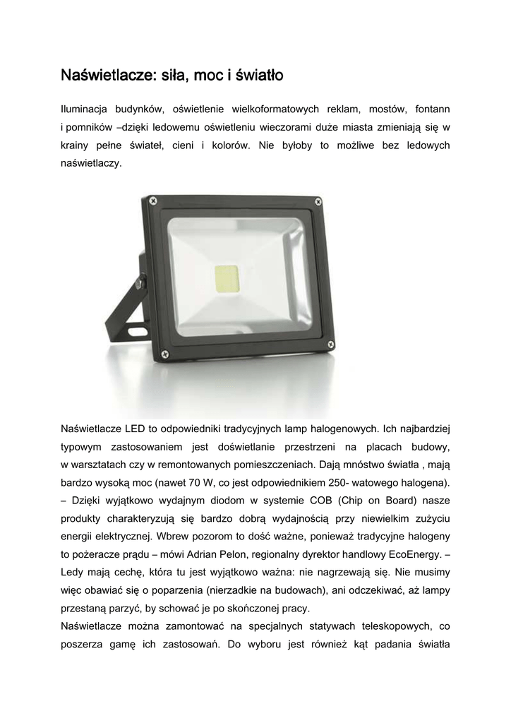 Naświetlacze: siła, moc i światło Iluminacja budynków, oświetlenie wielkoformatowych reklam, mostów, fontann i pomników –dzięki ledowemu oświetleniu wieczorami duże miasta zmieniają się w krainy pełne świateł, cieni i kolorów. Nie byłoby to możliwe bez ledowych naświetlaczy. Naświetlacze LED to odpowiedniki tradycyjnych lamp halogenowych. Ich najbardziej typowym zastosowaniem jest doświetlanie przestrzeni na placach budowy, w warsztatach czy w remontowanych pomieszczeniach. Dają mnóstwo światła , mają bardzo wysoką moc (nawet 70 W, co jest odpowiednikiem 250- watowego halogena). – Dzięki wyjątkowo wydajnym diodom w systemie COB (Chip on Board) nasze produkty charakteryzują się bardzo dobrą wydajnością przy niewielkim zużyciu energii elektrycznej. Wbrew pozorom to dość ważne, ponieważ tradycyjne halogeny to pożeracze prądu – mówi Adrian Pelon, regionalny dyrektor handlowy EcoEnergy. – Ledy mają cechę, która tu jest wyjątkowo ważna: nie nagrzewają się. Nie musimy więc obawiać się o poparzenia (nierzadkie na budowach), ani odczekiwać, aż lampy przestaną parzyć, by schować je po skończonej pracy. Naświetlacze można zamontować na specjalnych statywach teleskopowych, co poszerza gamę ich zastosowań. Do wyboru jest również kąt padania światła – od 90 do 120 stopni, w zależności od potrzeb można więc dobrać halogen oświetlający szerzej lub stosunkowo wąsko. Lampy dostępne są w dwóch wersjach kolorystycznych (obudowa szara i czarna) oraz w dwóch temperaturach barwy światła (biały ciepły i biały zimny). Kolorowe miasto nocą Ledowe naświetlacze coraz częściej wykorzystywane są do uzyskiwania artystycznego efektu przy podświetlaniu budynków. – W zależności od celu, jaki chcemy osiągnąć, montuje się je albo przy podstawie albo w określonym miejscu na elewacji. W ten sposób budynki, które w dzień wyglądają nieciekawie i szaro, w nocy mogą zyskać zaskakująco piękne oblicze – mówi Joanna Budzyńska, projektantka wnętrz i oświetlenia. Naświetlacze produkowane są również w wersji z czujnikami ruchu, pomocnej np. przy oświetleniu wejścia do domu i z uchwytami umożliwiającymi wygodne przenoszenie (idealne dla majsterkowiczów). Królowie outdooru Bez dobrego oświetlenia nie byłoby reklamy. A już na pewno nie tej zewnętrznej. Mocne naświetlacze ledowe są wręcz nieodzownym elementem wyposażenia przy ekspozycji billboardów i każdej formy wielkoformatowej reklamy. I to w bardzo dużej ilości. – Przy wykorzystaniu ich do oświetlenia reklam i budynków w przestrzeni miejskiej bardzo istotny jest czynnik ekonomiczny. Ledy zużywają aż siedmiokrotnie mniej prądu niż tradycyjne halogeny, dlatego nie dziwi tendencja włodarzy miast do przechodzenia na ten właśnie rodzaj oświetlenia – wyjaśnia Marcin Dróżdż, dyrektor handlowy z EcoEnergy. – I mają nieporównywalnie długą wytrzymałość. Nie przepalają się jak zwykłe źródła światła. A przy licznych lampach do zastosowań outdoorowych, umieszczonych wysoko i trudno dostępnych, ta zaleta nabiera szczególnego znaczenia. Postindustrialne wnętrza Rzadko kiedy ledowe naświetlacze wykorzystuje się inaczej niż w typowo przemysłowych zastosowaniach. Wyjątkiem są lofty. – Zdarzają się aranżacje w typowo postprzemysłowych wnętrzach, w których naświetlacze mogą stanowić ciekawy element wystroju wnętrza – mówi Joanna Budzyńska. – W inspirowanym halą fabryczną salonie w nowoczesnym lofcie faktycznie może być to interesujący, choć bardzo odważny pomysł. Ledowe naświetlacze spełniają swoją rolę również w garażach, warsztatach samochodowych czy piwnicach. Nie są polecane jedynie do pracowni artystycznych, w których kluczową rolę odgrywa kolor (np. malarskie, fotograficzne, modowe) – naświetlacze mają bowiem z reguły niskie CRI, czyli współczynnik oddawania kolorów (żeby oświetlane przez nie barwy wyglądały, jak w rzeczywistości, RI musi być na poziomie przynajmniej 80)