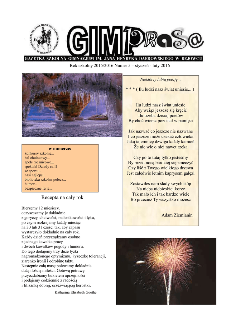 Rok szkolny 2015/2016 Numer 5 – styczeń - luty 2016 Niektórzy lubią poezję... * * * ( Ilu ludzi nasz świat uniesie... ) Ilu ludzi nasz świat uniesie Aby wciąż jeszcze się kręcić Ilu trzeba dzisiaj poetów By choć wiersz pozostał w pamięci w numerze: konkursy szkolne... bal choinkowy... apele rocznicowe... spektakl Dziady cz.II ze sportu... nasi najlepsi... biblioteka szkolna poleca... humor... bezpieczne ferie... Recepta na cały rok Bierzemy 12 miesięcy, oczyszczamy je dokładnie z goryczy, chciwości, małostkowości i lęku, po czym rozkrajamy każdy miesiąc na 30 lub 31 części tak, aby zapasu wystarczyło dokładnie na cały rok. Każdy dzień przyrządzamy osobno z jednego kawałka pracy i dwóch kawałków pogody i humoru. Do tego dodajemy trzy duże łyżki nagromadzonego optymizmu, łyżeczkę tolerancji, ziarenko ironii i odrobinę taktu. Następnie całą masę polewamy dokładnie dużą ilością miłości. Gotową potrawę przyozdabiamy bukietem uprzejmości i podajemy codziennie z radością i filiżanką dobrej, orzeźwiającej herbatki. Katharina Elisabeth Goethe Jak nazwać co jeszcze nie nazwane I co jeszcze może czekać człowieka Jaką tajemnicę dźwiga każdy kamień Że nie wie o niej nawet rzeka Czy po to tutaj tylko jesteśmy By przed nocą bardziej się zmęczyć Czy liść z Twego wielkiego drzewa Jest zaledwie letnim kaprysem gałęzi Zostawiłeś nam ślady swych stóp Na nieba niebieskiej korze Tak mało ich i tak bardzo wiele Bo przecież Ty wszystko możesz Adam Ziemianin KONKURS KARAOKE Dnia 12 stycznia odbył się konkurs karaoke, przygotowany przez p. Tomasza Praczuka. Udział wzięli: Kacper Kiraga, Mikołaj Nizioł, Iwona Kaliszewska, Milena Wasińska, Natalia Kaczor, Michalina Pawlas, Martyna Fabiańczyk, Paulina Pawlas, Weronika Lewczuk oraz Julia Mojsiejuk. Zadaniem uczniów, którzy zgłosili się do wzięcia udziału było zaśpiewanie kolęd w Języku Angielskim. Po występach osoby, które przysłuchiwały się wszystkim „wykonom” mogły wraz z prowadzącymi oddać głos na osobę, która ich zdaniem zaśpiewała najlepiej. Mimo tremy to wszystkim poszło świetnie, niestety trzeba było wybrać tych 'najlepszych'. Wyniki są następujące: 1 miejsce - Weronika Lewczuk i Paulina Pawlas, 2 miejsce - Mikołaj Nizioł, 3 miejsce - Kacper Kiraga KONKURS 100 Greatest Britons zorganizowany dn. 13.01.2016 r przez p.Agnieszkę Dabską. W konkursie wzięli udział uczniowie klas I-III. Były różne konkurencje. Na początku uczniowie rozwiązywali test dotyczący znajomości Brytyjczyków - aktorów, piosenkarzy, sportowców, naukowców oraz ich dzieł. Następnie musieli odgadnąć nazwiska wyświetlonych postaci w prezentacji multimedialnej. Kolejna konkurencja polegała na wysłuchaniu urywków utworów oraz dopasowaniu do nich tytułów i podaniu piosenkarzy bądź nazw zespołów. Ostatnia konkurencja filmowa. Uczniowie oglądali trailery wybranych filmów. Ich zadaniem było podanie jak największej ilości nazwisk Brytyjskich aktorów pojawiających się w oglądanych filmach. Zwyciężyła Wiktoria Kość uczennica klasy 2b. Drugie miejsce zajął Jarosław Sobstyl z klasy 2 c. Trzecie miejsce zajął Marcin Krawczak uczeń klasy 2b. Wszyscy zwycięzcy otrzymali nagrody ufundowane przez wydawnictwo Macmillan oraz przez p. Agnieszkę Dabską. REALIZUJEMY PROJEKT PAMIETAMY POLSKO Dnia 20 stycznia 2016 r w ramach tego projektu klasa IIa wraz z wychowawczynią p. Elżbiety Ciechan przygotowała apel „Powstanie styczniowe w literaturze i malarstwie”. Uczniowie przedstawili prezentację multimedialną o historii powstania i ważnych postaciach z tamtego okresu. Wagę zdarzeń styczniowych uczniowie podkreślili recytacją wierszy na tle pieśni powstańczych oraz wystawą reprodukcji obrazów o powstaniu styczniowym. Dnia 10 lutego realizując ten projekt klasa II b wraz z wychowawczynią p. Agatą Woźniak przypomniała sylwetkę naszego kompozytora Fryderyka Chopina. Na tle muzyki wielkiego romantycznego pianisty uczniowie przedstawili prezentację multimedialna dotycząca jego życia. W drugiej części przypomnieli również ważną rolę żołnierzy – cichociemnych, którzy przeszkoleni w Anglii, działali na terenie okupowanej Polski. Na zakończenie pani Anna Bzikot wręczyła nagrody uczniom klas pierwszych, którzy okazali się najlepsi w układaniu kostki rubika. Gratulujemy. CHOINKA 4 lutego w naszej szkole odbyła się zabawa choinkowa. Jak nigdy do tej pory był to prawdziwy bal, który zaczęliśmyl polonezem, do którego uczniów przygotowali pani Beata Werner – Kość i pan Mirosław Kości. Stroje wieczorowe, piękny układ i muzyka sprawiły, że niejednemu obserwatorowi zakręciła się łezka w oku. Następnie bawiliśmy się przy muzyce i prowadzeniu DJ’a. ENGLISH PROVERBS COMPETITIONA Dnia 09 lutego 2016 roku odbył się szkolny konkurs z języka angielskiego "English proverbs competition” przygotowany przez p. Agnieszkę Dąbską. Trzy osobowe zespoły z klas I-III wzięły udział w różnych konkurencjach, między innymi rozwiązywali test, w którym musieli dokończyć przysłowia, podąć ich polskie i angielskie tłumaczenie, znaleźć i poprawić błędy. Pozostałe konkurencje polegały na pokazaniu, narysowaniu wylosowanego przysłowia. Uczniowie rozwiązywali również krzyżówkę , odgadywali na podstawie rekwizytów przysłowia, oglądali krótkie filmiki. Pierwsze miejsce zajął zespół z klasy 3 a w składzie Karolina Fabiańczyk, Barbara Kociuba, Michalina Jędruszak. Drugie miejsce zespół z klasy 1 a w składzie Zuzanna Batejko , Aleksandra Nachuniak.Trzecie miejsce zajęli uczniowie z klasy 2 c w składzie Paulina Kajdaszuk, Albert Chomątowski oraz Sebastian Jarosz. Gratulacje dla laureatów oraz podziękowania dla wszystkich uczestników. SPEKTAKL DZIADY cz.II W ramach innowacji pedagogicznej dotyczącej omawianych lektur klasa 2 b przygotowała spektakl w oparciu o cz.