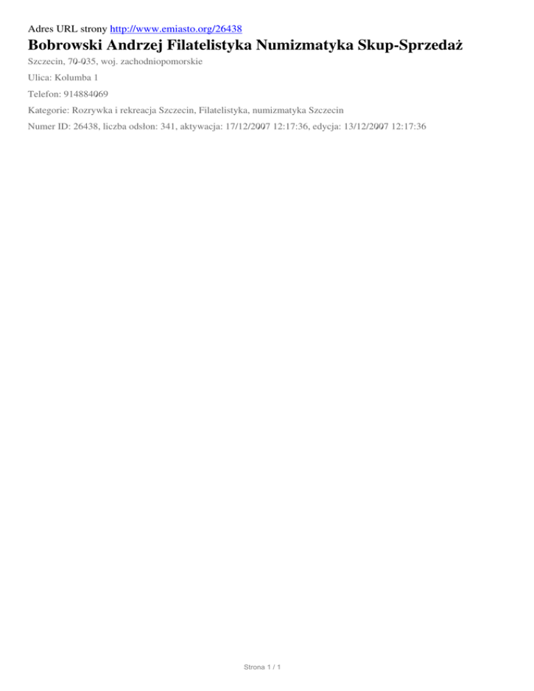 Adres URL strony http://www.emiasto.org/26438 Bobrowski Andrzej Filatelistyka Numizmatyka Skup-Sprzedaż Szczecin, 70-035, woj. zachodniopomorskie Ulica: Kolumba 1 Telefon: 914884069 Kategorie: Rozrywka i rekreacja Szczecin, Filatelistyka, numizmatyka Szczecin Numer ID: 26438, liczba odsłon: 341, aktywacja: 17/12/2007 12:17:36, edycja: 13/12/2007 12:17:36 Strona 1 / 1