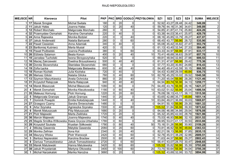 RAJD NIEPODLEGŁOŚCI MIEJSCE NR 1 2 3 4 5 6 7 8 9 10 11 12 13 14 15 16 17 18 19 20 21 22 23 24 25 26 27 28 29 30 31 32 33 34 35 36 37 38 17 11 12 32 24 37 22 23 15 26 10 16 30 19 18 20 13 31 14 4 35 5 7 27 9 6 21 36 25 28 2 29 34 3 8 33 38 1 Kierowca Pilot Marek Śmiglak Jakub Hałas Robert Morchało Przemysław Osmański Anna Rajewska Jakub Anderwald Paweł Ciesielski Bartłomiej Kuśnierz Paweł Podbielski Elżbieta Salamon Jarosław Tucholski Maciej Zakrzewski Dorota Skowrońska Zofia Łęcka Roman Kiciński Mariusz Gilicki Szymon Mazurkiewicz Krzysztof Ratajczak Marek Błaszczak Marek Domański Mateusz Hornung Małgorzata Granops Dominik Powęzki Grzegorz Czarny Artur Szynaka Marek Matuszczak Piotr Majewski Marcin Majewski Magda Smółka-Witkowska Krzysztof Szukała Mikołaj Gawenda Monika Zefirian Maurycy Włoka Bartosz Napieralski Dariusz Tomaszkiewicz Marek Matulewski Jakub Przystaniak Michał Narzekalski Michał Świtała Joanna Hałas Małgorzata Morchało Karolina Osmańska Monika Bzdziel Natalia Bańcerek Anna Adamiak Marta Musiał Joanna Podbielska Beata Konon Iwona Skrzypczyńska Ewelina Brzuszkiewicz Stanisław Skowroński Małgorzata Bielawska Julia Kicińska Natalia Gilicka Aneta Ochnicka Marta Ratajczak Michał Błaszczak Monika Kleczkowska Piotr Hornung Jakub Granops Emilia Kołodziejczak Sandra Śmierzchała Agnieszka Szynaka Filip Matuszczak Marta Zielińska Joanna Majewska Kasia Grycza-Urbańska Krystian Sółkowski Matylda Gawenda Ilona Kot Piotr Waroczyk Karolina Bracław Jakub Tomaszkiewicz Hanna Matulewska Martyna Olkowska Marika Narożna PKP PKC BRD GODŁO PRZYSŁOWIA 180 120 260 220 220 280 340 420 380 400 520 500 660 600 720 760 860 940 1080 1180 1220 1440 1440 1480 1500 1680 1720 1740 1780 1780 2060 2340 2420 2500 2720 3420 3400 3660 0 20 0 20 0 0 0 40 0 0 0 0 0 40 0 0 0 0 0 20 0 0 0 40 0 0 0 40 0 40 0 40 0 20 0 40 0 80 0 60 0 20 0 20 0 0 0 0 0 40 0 20 0 20 0 40 0 60 0 80 0 20 0 20 0 40 0 60 0 0 0 60 0 100 0 20 0 40 0 0 40 60 0 0 60 40 0 40 0 40 0 60 40 40 0 40 60 0 40 0 80 0 0 40 0 40 60 40 60 40 60 60 60 0 SZ1 SZ2 SZ3 SZ4 0 52,92 43,27 28,48 24,42 0 59,76 44,16 31,36 34,61 0 54,85 41,87 41,74 25,80 0 63,38 44,03 36,41 25,97 0 68,16 45,85 33,79 29,27 0 66,45 43,77 56,96 28,72 0 65,08 45,42 35,82 27,47 0 61,13 43,40 32,54 27,33 0 63,33 44,97 56,96 27,91 10 70,41 48,69 38,63 29,97 0 69,81 48,94 32,80 27,98 0 61,31 47,67 56,96 29,42 0 57,77 43,20 30,80 24,66 0 64,40 49,41 42,59 30,15 0 54,43 43,89 29,59 48,84 10 62,79 45,25 33,02 29,52 0 71,20 45,04 56,96 28,26 0 64,94 83,74 56,96 34,13 70 64,49 43,76 56,96 26,16 10 63,02 51,52 56,96 25,04 0 76,09 58,13 43,17 38,11 0 63,65 42,88 35,77 48,84 10 63,84 49,01 36,99 30,03 0 64,91 50,10 56,96 29,35 0 105,52 51,84 56,96 39,30 0 64,58 46,98 34,98 29,54 0 65,32 45,85 42,00 28,79 0 75,53 46,93 56,96 32,10 0 68,95 53,01 41,17 30,53 50 70,16 51,26 56,96 30,90 0 70,81 46,92 56,96 48,84 0 82,21 58,13 56,96 37,85 0 52,76 45,51 38,28 32,96 0 71,63 44,57 56,96 29,27 10 56,41 43,07 28,70 30,47 0 105,52 55,82 56,96 35,39 20 73,75 50,64 56,96 34,04 0 105,52 43,69 32,06 33,72 SUMA 349,09 349,89 424,26 429,79 437,07 535,90 553,79 584,40 633,17 657,70 699,53 775,36 816,43 866,55 936,75 1040,58 1121,46 1259,77 1421,37 1486,54 1515,50 1651,14 1669,87 1681,32 1873,62 1876,08 1921,96 2031,52 2033,66 2159,28 2363,53 2635,15 2689,51 2802,43 2948,65 3793,69 3795,39 3894,99 MIEJSCE 1 2 3 4 5 6 7 8 9 10 11 12 13 14 15 16 17 18 19 20 21 22 23 24 25 26 27 28 29 30 31 32 33 34 35 36 37 38