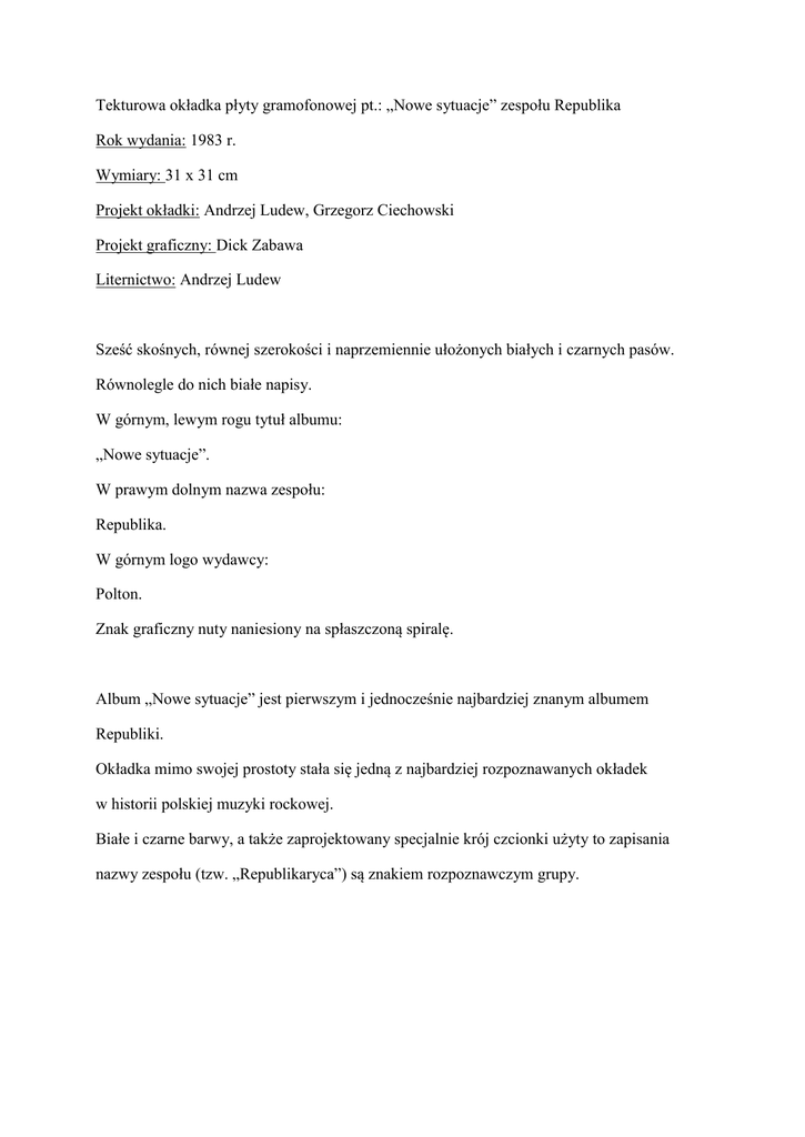 Tekturowa okładka płyty gramofonowej pt.: „Nowe sytuacje” zespołu Republika Rok wydania: 1983 r. Wymiary: 31 x 31 cm Projekt okładki: Andrzej Ludew, Grzegorz Ciechowski Projekt graficzny: Dick Zabawa Liternictwo: Andrzej Ludew Sześć skośnych, równej szerokości i naprzemiennie ułożonych białych i czarnych pasów. Równolegle do nich białe napisy. W górnym, lewym rogu tytuł albumu: „Nowe sytuacje”. W prawym dolnym nazwa zespołu: Republika. W górnym logo wydawcy: Polton. Znak graficzny nuty naniesiony na spłaszczoną spiralę. Album „Nowe sytuacje” jest pierwszym i jednocześnie najbardziej znanym albumem Republiki. Okładka mimo swojej prostoty stała się jedną z najbardziej rozpoznawanych okładek w historii polskiej muzyki rockowej. Białe i czarne barwy, a także zaprojektowany specjalnie krój czcionki użyty to zapisania nazwy zespołu (tzw. „Republikaryca”) są znakiem rozpoznawczym grupy.