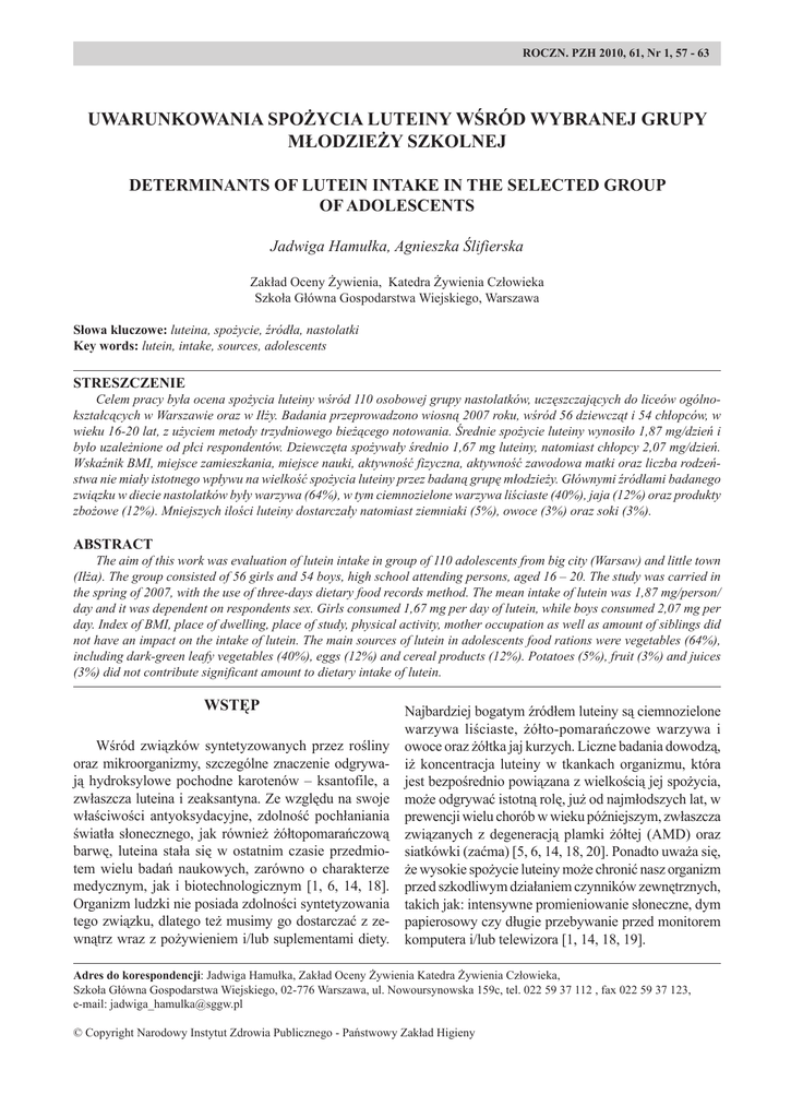 ROCZN. PZH 2010, 61, Nr 1, 57 - 63 UWARUNKOWANIA spożyciA luteiny wśród Wybranej grupy młodzieży szkolnej Determinants of lutein intake IN the SELECTED group of adolescents Jadwiga Hamułka, Agnieszka Ślifierska Zakład Oceny Żywienia, Katedra Żywienia Człowieka Szkoła Główna Gospodarstwa Wiejskiego, Warszawa Słowa kluczowe: luteina, spożycie, źródła, nastolatki Key words: lutein, intake, sources, adolescents STRESZCZENIE Celem pracy była ocena spożycia luteiny wśród 110 osobowej grupy nastolatków, uczęszczających do liceów ogólnokształcących w Warszawie oraz w Iłży. Badania przeprowadzono wiosną 2007 roku, wśród 56 dziewcząt i 54 chłopców, w wieku 16-20 lat, z użyciem metody trzydniowego bieżącego notowania. Średnie spożycie luteiny wynosiło 1,87 mg/dzień i było uzależnione od płci respondentów. Dziewczęta spożywały średnio 1,67 mg luteiny, natomiast chłopcy 2,07 mg/dzień. Wskaźnik BMI, miejsce zamieszkania, miejsce nauki, aktywność fizyczna, aktywność zawodowa matki oraz liczba rodzeństwa nie miały istotnego wpływu na wielkość spożycia luteiny przez badaną grupę młodzieży. Głównymi źródłami badanego związku w diecie nastolatków były warzywa (64%), w tym ciemnozielone warzywa liściaste (40%), jaja (12%) oraz produkty zbożowe (12%). Mniejszych ilości luteiny dostarczały natomiast ziemniaki (5%), owoce (3%) oraz soki (3%). ABSTRACT The aim of this work was evaluation of lutein intake in group of 110 adolescents from big city (Warsaw) and little town (Iłża). The group consisted of 56 girls and 54 boys, high school attending persons, aged 16 – 20. The study was carried in the spring of 2007, with the use of three-days dietary food records method. The mean intake of lutein was 1,87 mg/person/ day and it was dependent on respondents sex. Girls consumed 1,67 mg per day of lutein, while boys consumed 2,07 mg per day. Index of BMI, place of dwelling, place of study, physical activity, mother occupation as well as amount of siblings did not have an impact on the intake of lutein. The main sources of lutein in adolescents food rations were vegetables (64%), including dark-green leafy vegetables (40%), eggs (12%) and cereal products (12%). Potatoes (5%), fruit (3%) and juices (3%) did not contribute significant amount to dietary intake of lutein. Wstęp Wśród związków syntetyzowanych przez rośliny oraz mikroorganizmy, szczególne znaczenie odgrywają hydroksylowe pochodne karotenów – ksantofile, a zwłaszcza luteina i zeaksantyna. Ze względu na swoje właściwości antyoksydacyjne, zdolność pochłaniania światła słonecznego, jak również żółtopomarańczową barwę, luteina stała się w ostatnim czasie przedmiotem wielu badań naukowych, zarówno o charakterze medycznym, jak i biotechnologicznym [1, 6, 14, 18]. Organizm ludzki nie posiada zdolności syntetyzowania tego związku, dlatego też musimy go dostarczać z zewnątrz wraz z pożywieniem i/lub suplementami diety. Najbardziej bogatym źródłem luteiny są ciemnozielone warzywa liściaste, żółto-pomarańczowe warzywa i owoce oraz żółtka jaj kurzych. Liczne badania dowodzą, iż koncentracja luteiny w tkankach organizmu, która jest bezpośrednio powiązana z wielkością jej spożycia, może odgrywać istotną rolę, już od najmłodszych lat, w prewencji wielu chorób w wieku późniejszym, zwłaszcza związanych z degeneracją plamki żółtej (AMD) oraz siatkówki (zaćma) [5, 6, 14, 18, 20]. Ponadto uważa się, że wysokie spożycie luteiny może chronić nasz organizm przed szkodliwym działaniem czynników zewnętrznych, takich jak: intensywne promieniowanie słoneczne, dym papierosowy czy długie przebywanie przed monitorem komputera i/lub telewizora [1, 14, 18, 19]. Adres do korespondencji: Jadwiga Hamułka, Zakład Oceny Żywienia Katedra Żywienia Człowieka, Szkoła Główna Gospodarstwa Wiejskiego, 02-776 Warszawa, ul. Nowoursynowska 159c, tel. 022 59 37 112 , fax 022 59 37 123, e-mail: [email protected] © Copyright Narodowy Instytut Zdrowia Publicznego - Państwowy Zakład Higieny 58 Nr 1 J. Hamułka, A. Ślifierska Ze względu na znaczenie jakie luteina pełni w organizmie człowieka oraz niewielką liczbę prac dotyczących wielkości jej spożycia w populacji polskiej, podjęto niniejsze badanie, mające na celu oszacowanie poziomu i struktury spożycia tego związku w wybranej grupie młodzieży szkolnej. Materiał i Metody Badania przeprowadzono wiosną 2007 roku (kwiecień – czerwiec), wśród 110 osobowej grupy uczniów (56 dziewcząt i 54 chłopców), uczęszczających do dwóch liceów ogólnokształcących, w Warszawie i w Iłży (województwo mazowieckie). Wiek badanej młodzieży mieścił się w zakresie od 16 do 20 lat, natomiast średnia wieku wynosiła 17,7 ± 0,6 lat. Oceny sposobu żywienia dokonano przy użyciu metody trzydniowego bieżącego notowania, w której uwzględniono dwa dni robocze oraz jeden dzień wolny od zajęć szkolnych. Wielkość porcji spożywanych produktów spożywczych określono za pomocą „Albumu fotografii produktów i potraw” [21]. Na podstawie uzyskanych informacji dotyczących spożycia produktów oraz oznaczonych we wcześniejszych badaniach zawartości luteiny w produktach krajowych [8, 10] obliczono średnie dzienne spożycie tego karotenoidu oraz określono udział poszczególnych grup produktów w dostarczaniu tego związku. Uczniowie poproszeni zostali również o wypełnienie formularza zawierającego pytania dotyczące: płci, wieku, wzrostu, masy ciała, miejsca zamieszkania, aktywności zawodowej matki, liczby rodzeństwa, aktywności fizycznej, czasu spędzanego przed komputerem i/lub telewizorem, stosowania diet specjalistycznych oraz przyjmowania suplementów diety, które posłużyły do oceny wpływu tych czynników na wielkość spożycia luteiny. Dane dotyczące masy ciała oraz wzrostu wykorzystano do obliczenia wskaźnika masy ciała BMI (Body Mass I